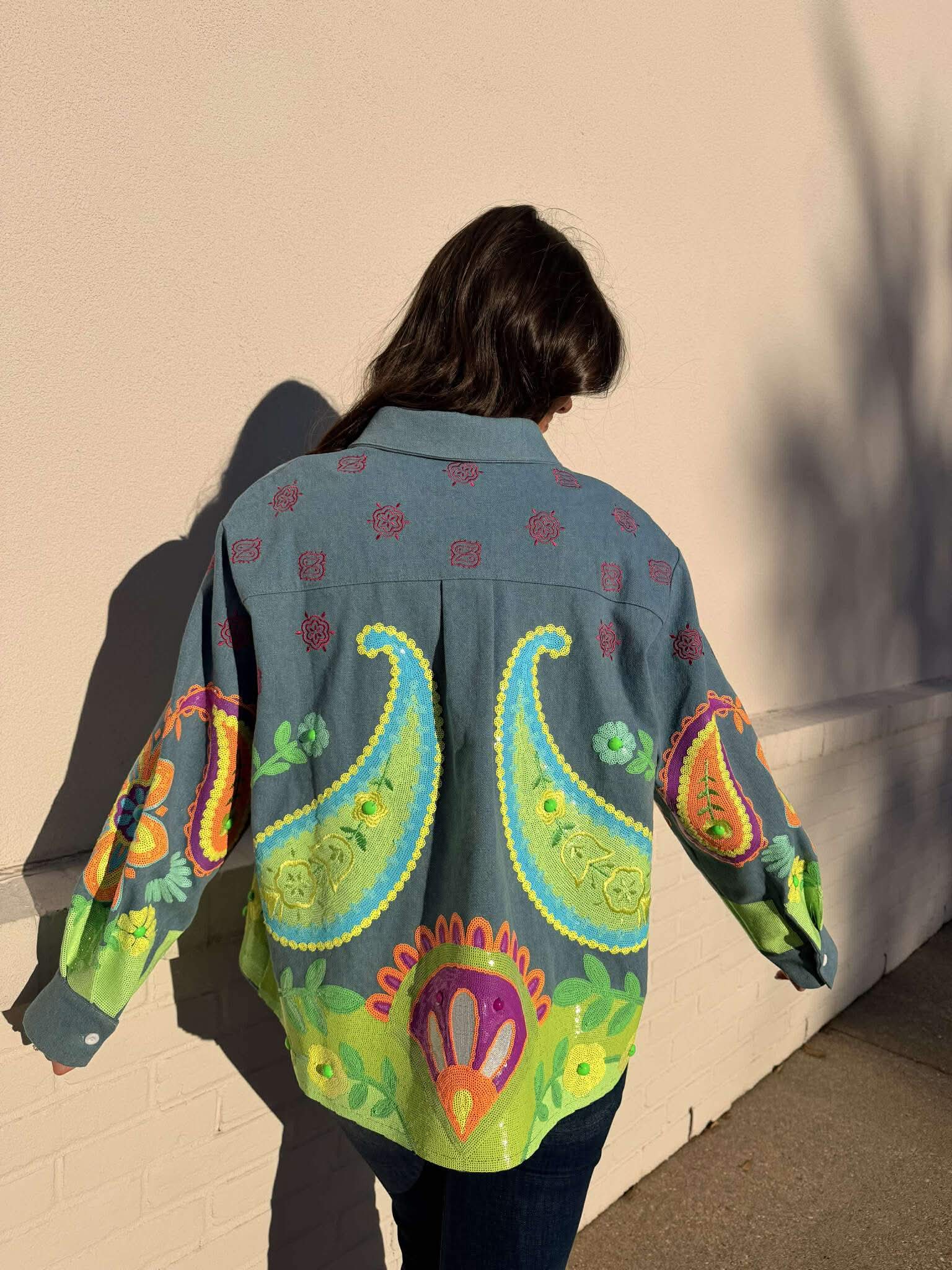 Elevate your wardrobe with the Queen Of Sparkles Denim & Neon Paisley Print Button Up Long Sleeve shirt! Infused with a vibrant rodeo theme, this shirt captures the spirit of adventure and fun. Embrace your bold side and make a statement wherever you go!
