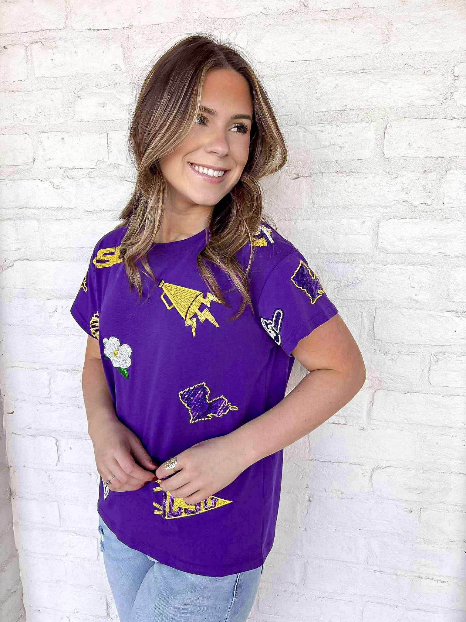 Introducing our Queen of Sparkles LSU Mini Icon Purple Tee! This shirt features our iconic design that showcases your love for LSU. With every wear, you'll feel like royalty and show off your team pride. Make a statement and support your team in style with this must-have shirt! Go Tigers!