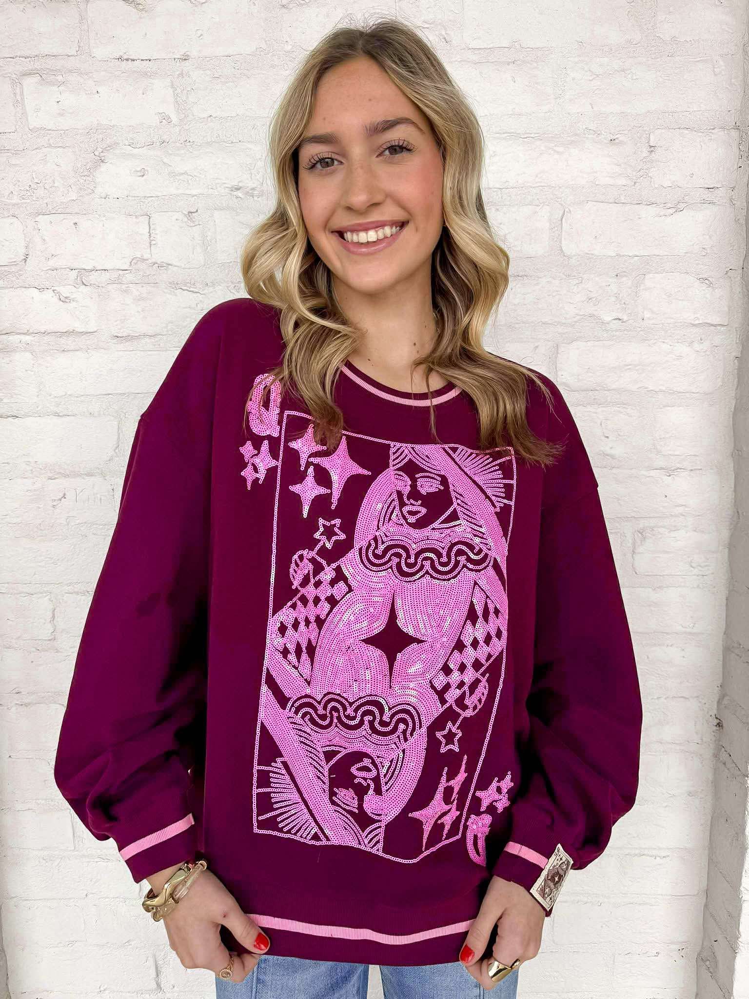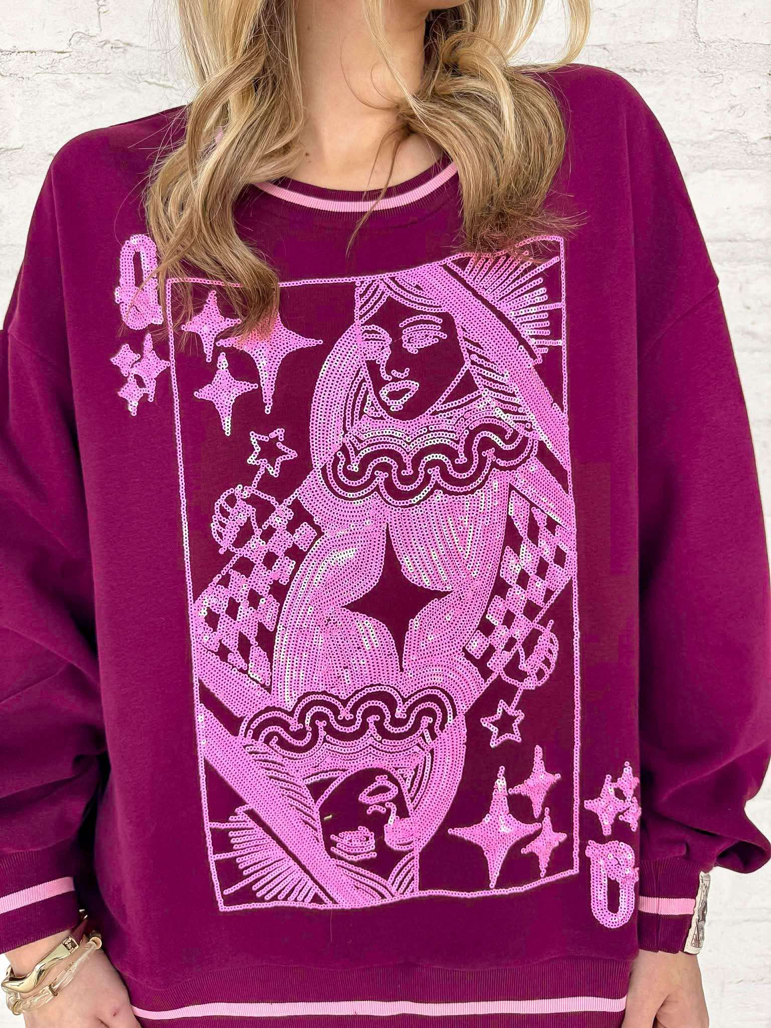 Elevate your style with the Queen Of Sparkles Maroon & Pink Logo Sweatshirt. Featuring a striking logo card, this sweatshirt adds a touch of sparkle to your outfit. Perfect for any occasion, it's a must-have for anyone who wants to make a bold statement. Upgrade your wardrobe today!