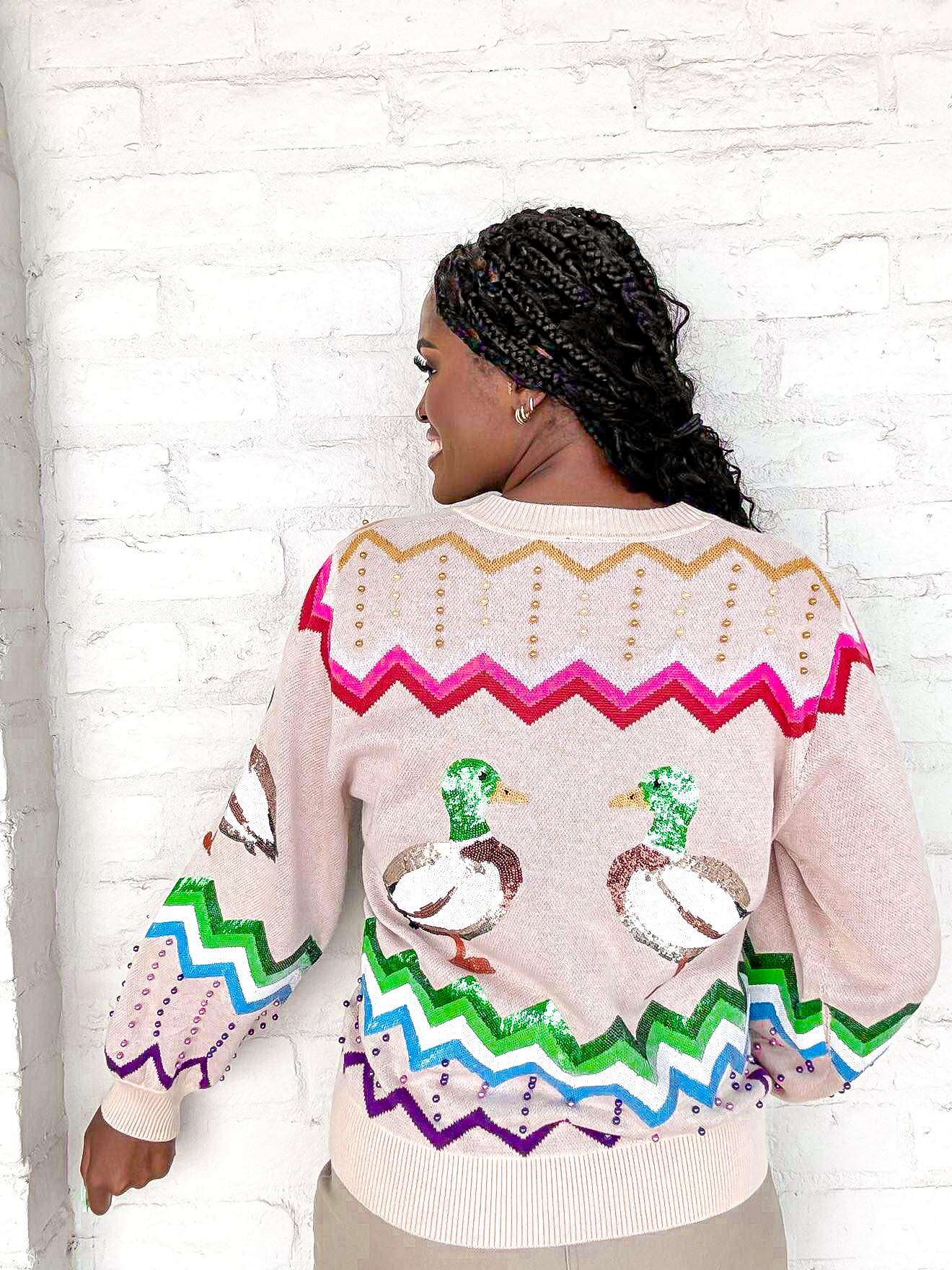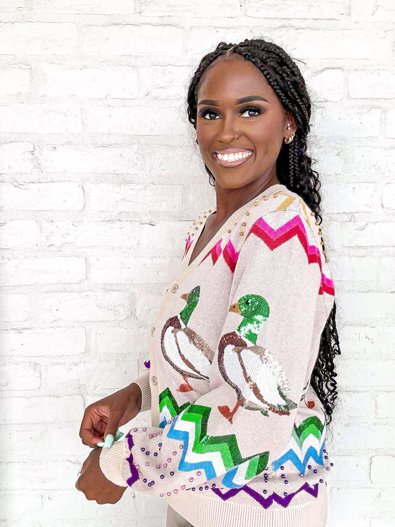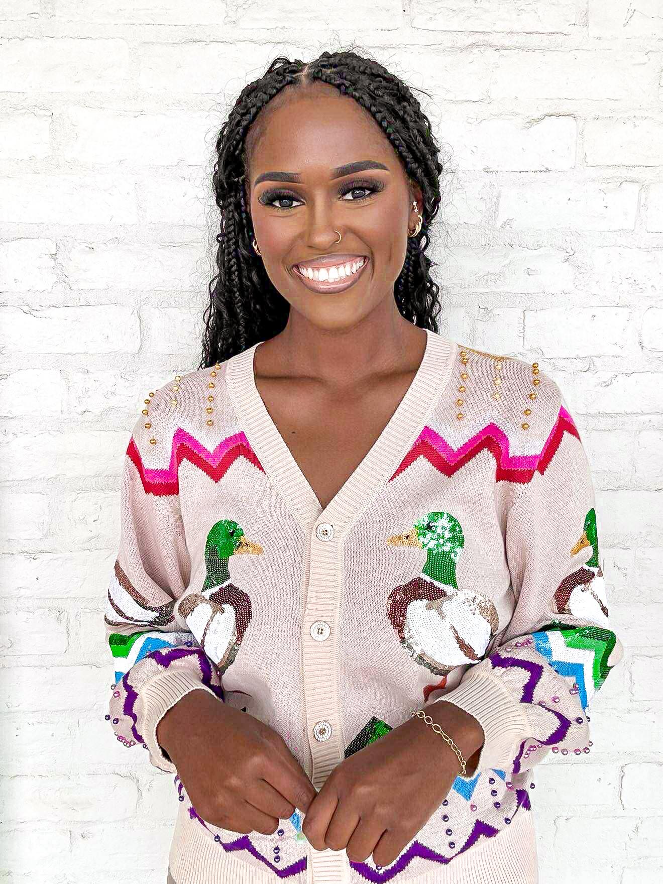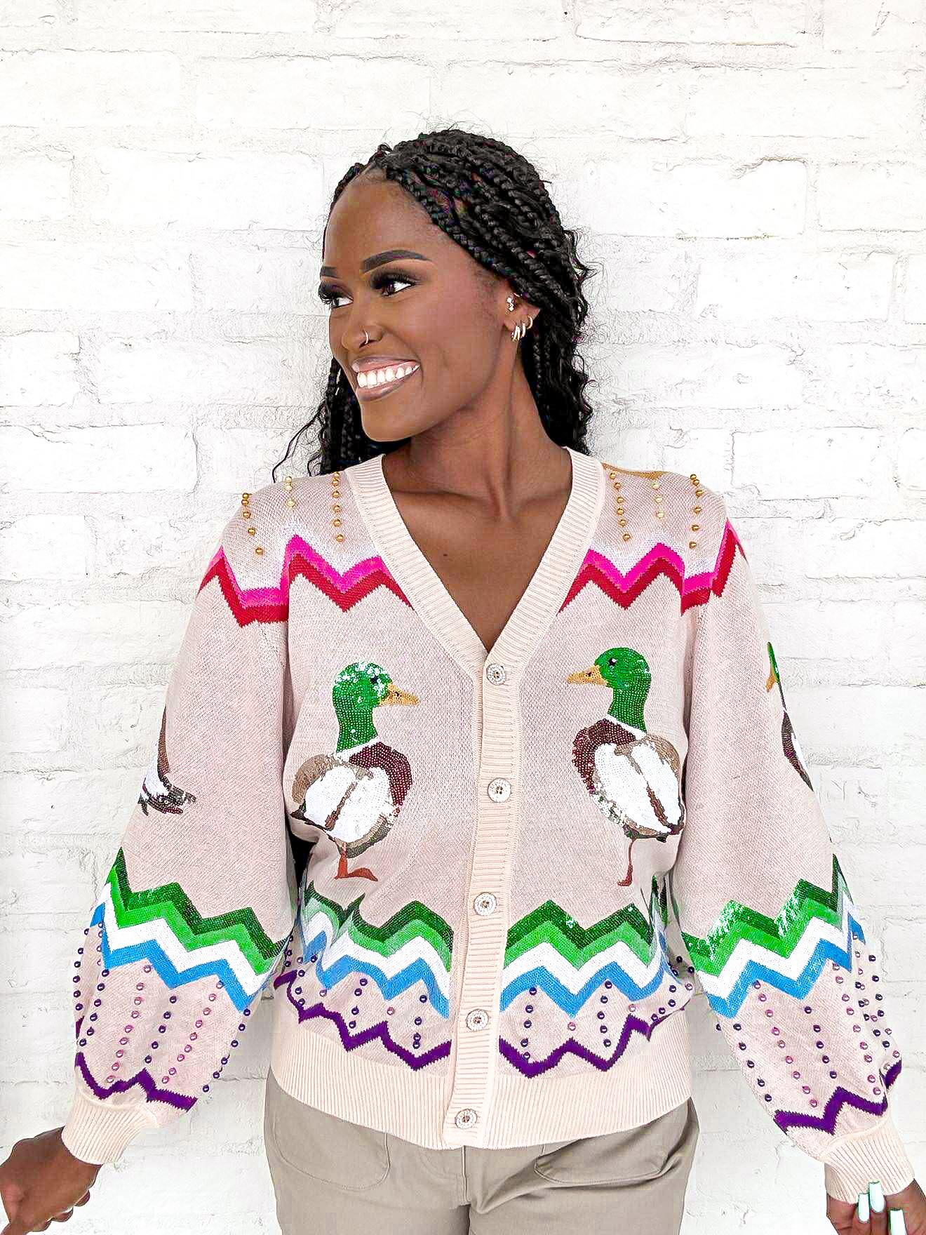 Get ready to shine with our Queen Of Sparkles Multi Zig Zag Duck Cardigan! Featuring a stunning beige color, this cardigan is perfect for adding a touch of elegance to any outfit. With its unique zig zag design, you'll be sure to turn heads and stand out in a crowd. Show off your style and sparkle like a queen!