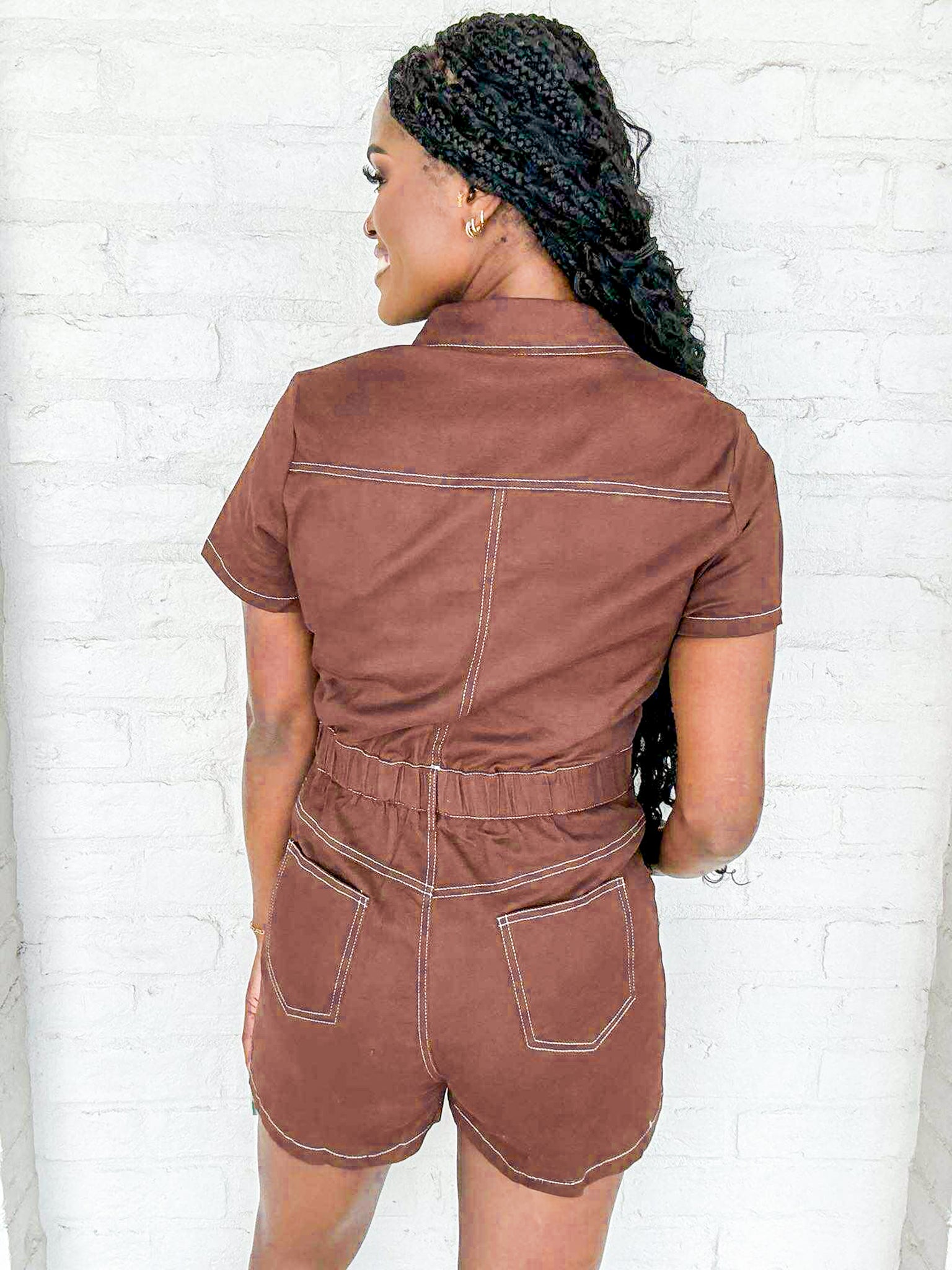 Effortlessly chic and versatile, the Hello Darling Brown Romper is a must-have addition to any wardrobe. Featuring a stylish shirt collar and short sleeves, this romper is perfect for any occasion. The front button adds a touch of elegance to the timeless design. Dress it up or down for a look that is always on trend!