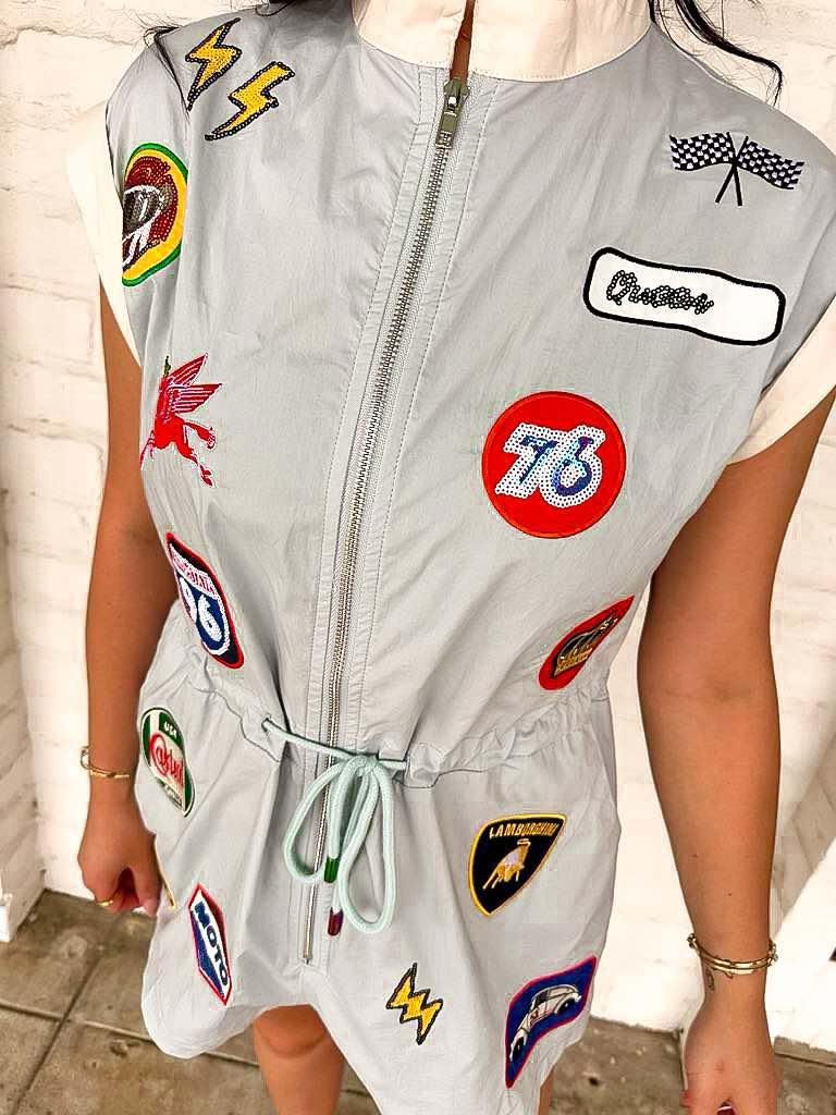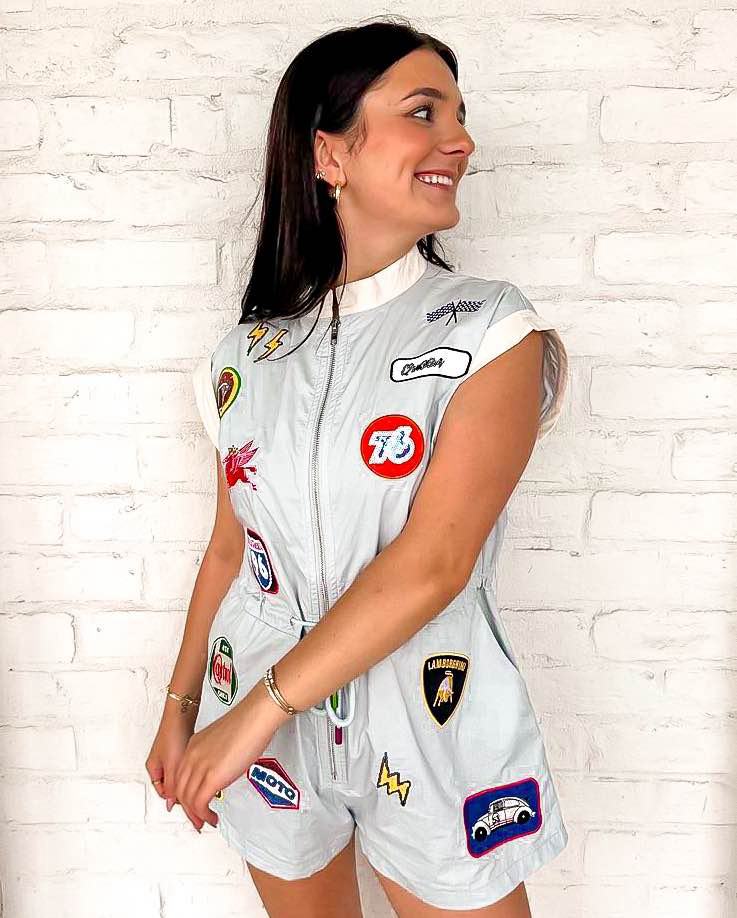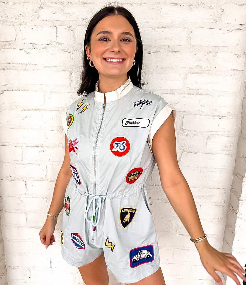 Introducing the Queen of Sparkles Chambray NASCAR Patch Tie Romper. This stand-out romper boasts a classic chambray design and features a bold NASCAR patch for an added touch of style. You'll be sure to turn heads and make a statement in this unique and trendy piece.