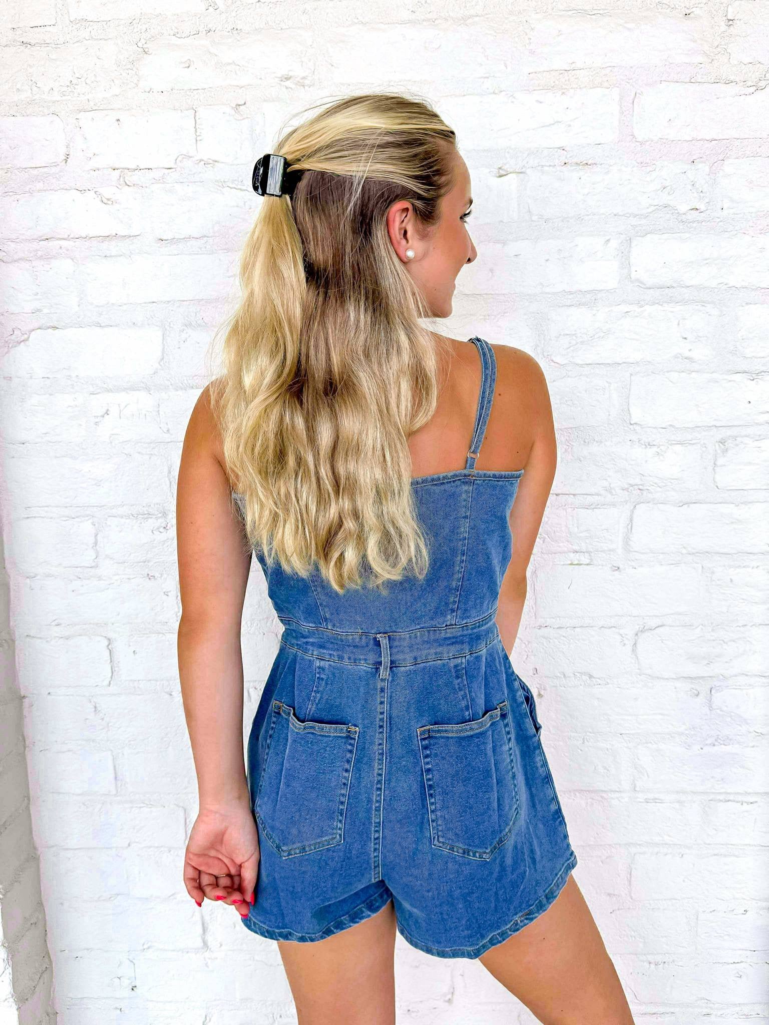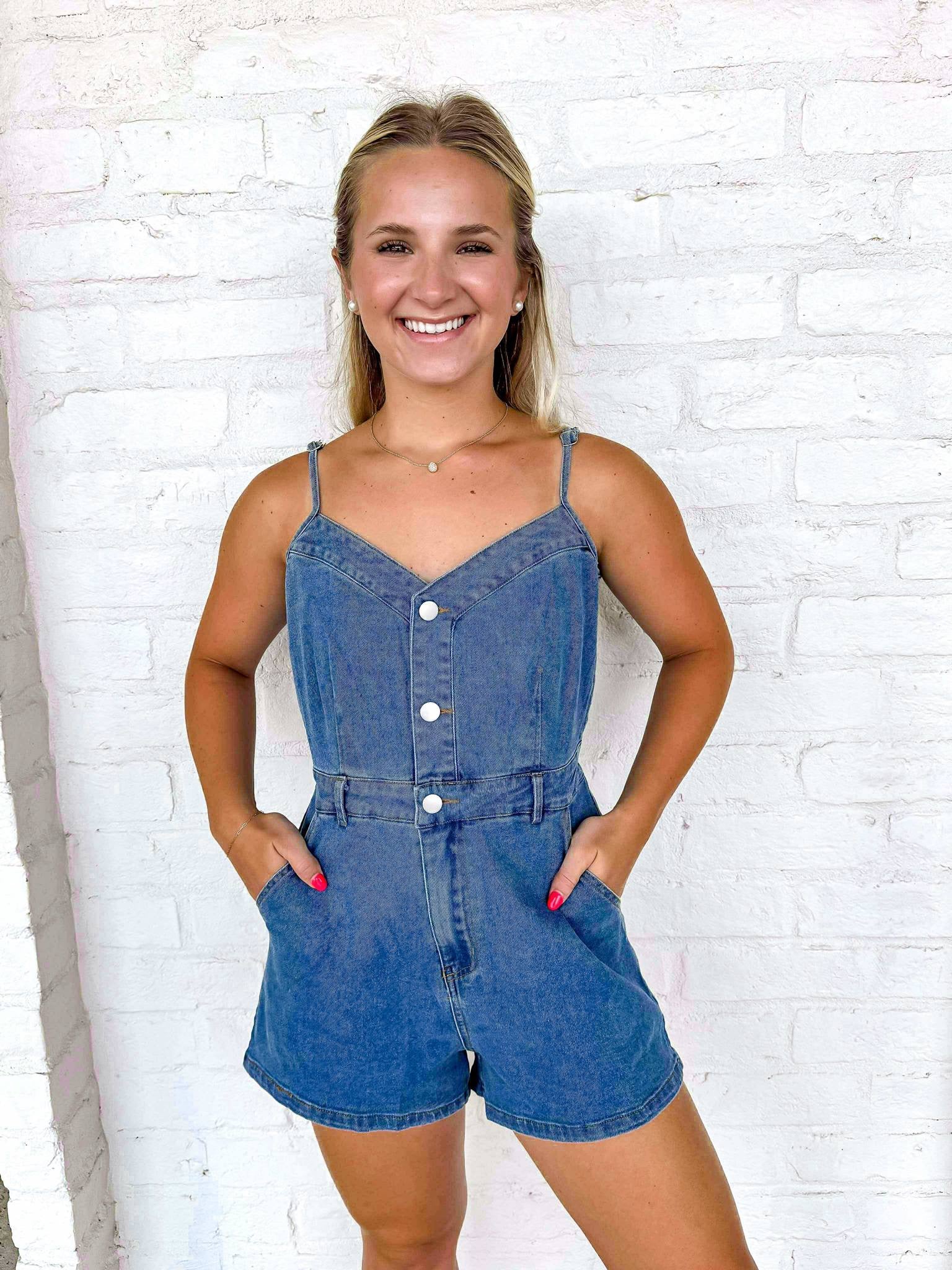 Look stylish and save the day with our Denim button romper. No need to sacrifice fashion for practicality with this versatile piece. Enjoy the convenience of easy buttons while looking effortlessly chic. Perfect for any occasion, this romper is a must-have staple for your wardrobe.