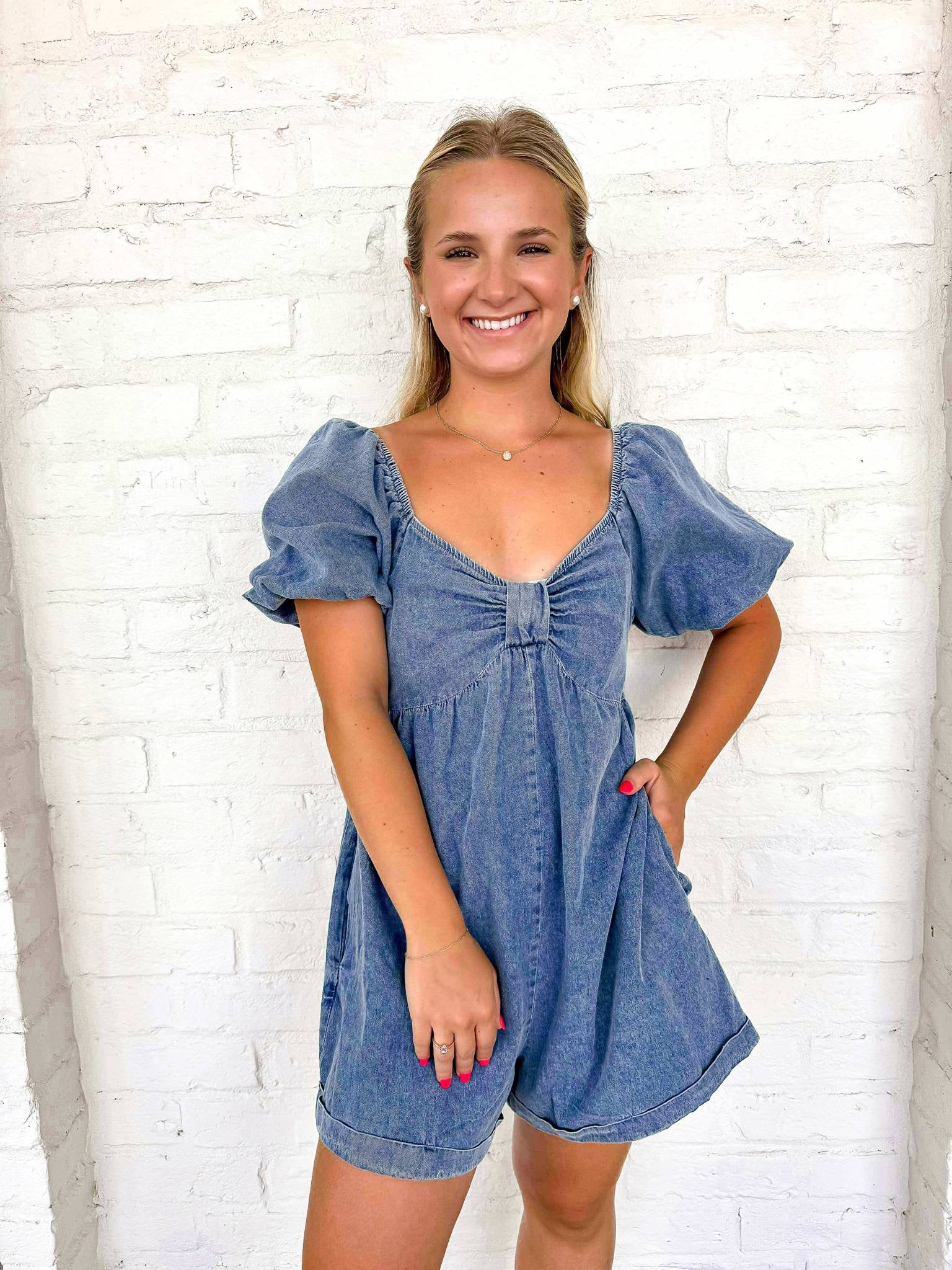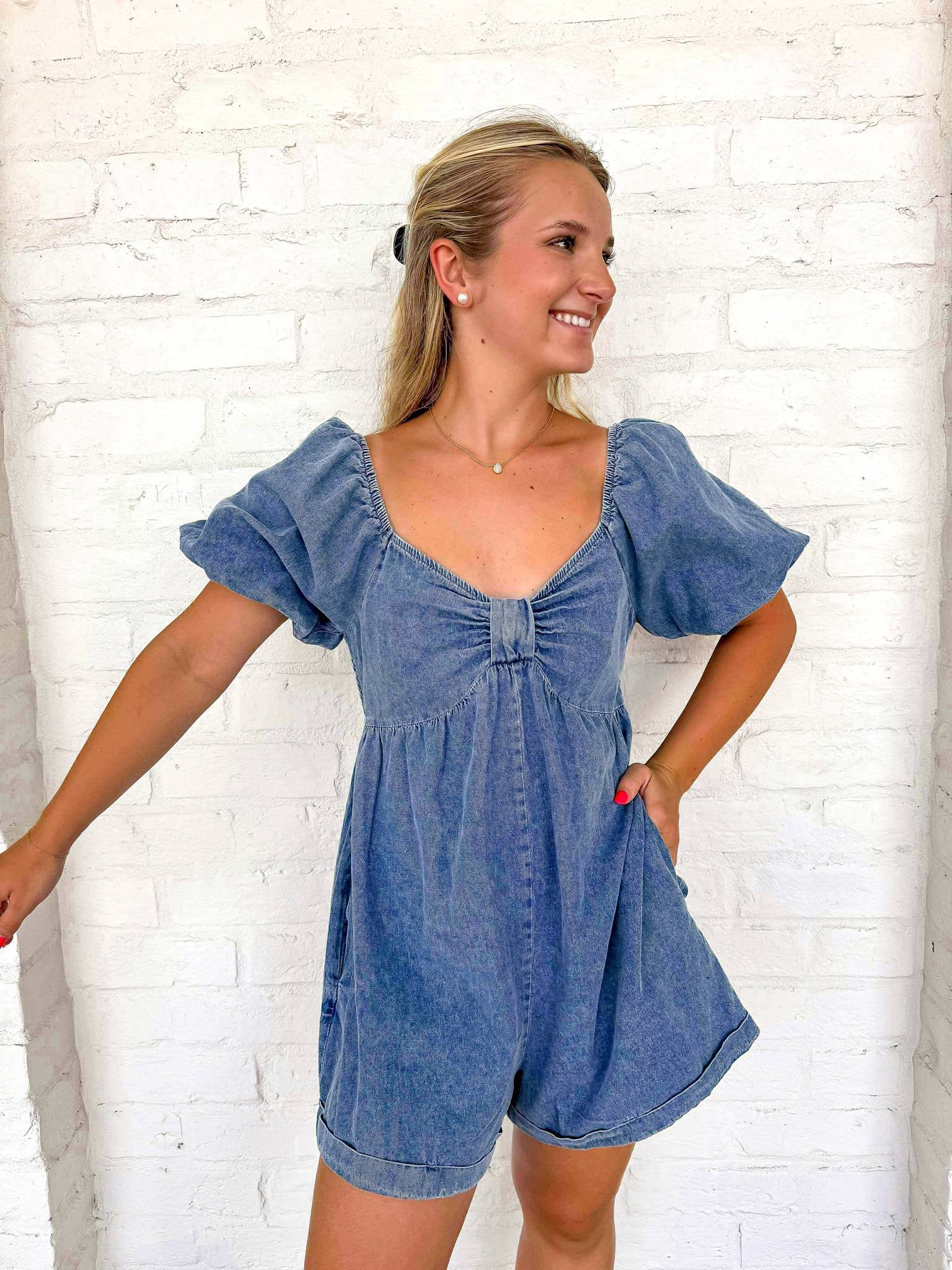 Fall in love with our Sweetheart Washed Denim Romper! Made from soft denim, this romper is both comfortable and stylish. Perfect for any occasion, it'll be your go-to outfit. Get ready to feel confident and chic in this must-have piece!