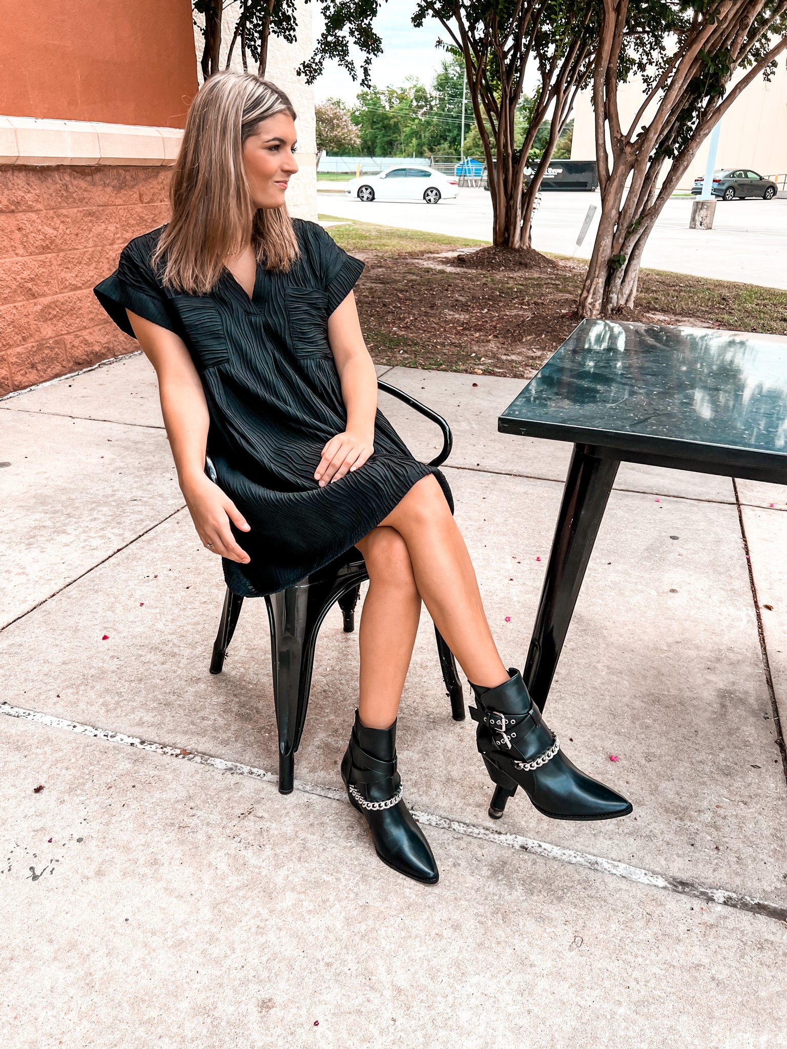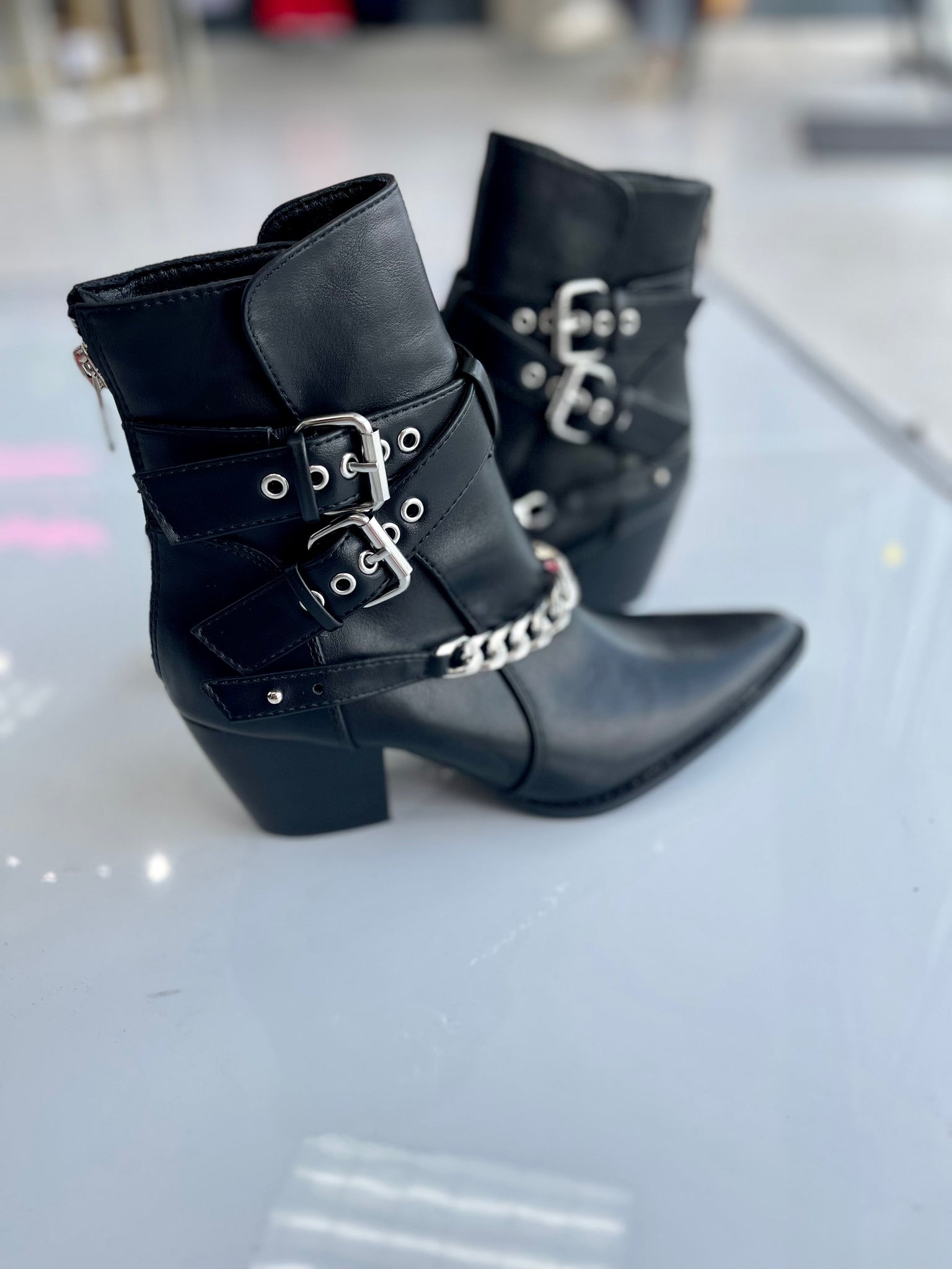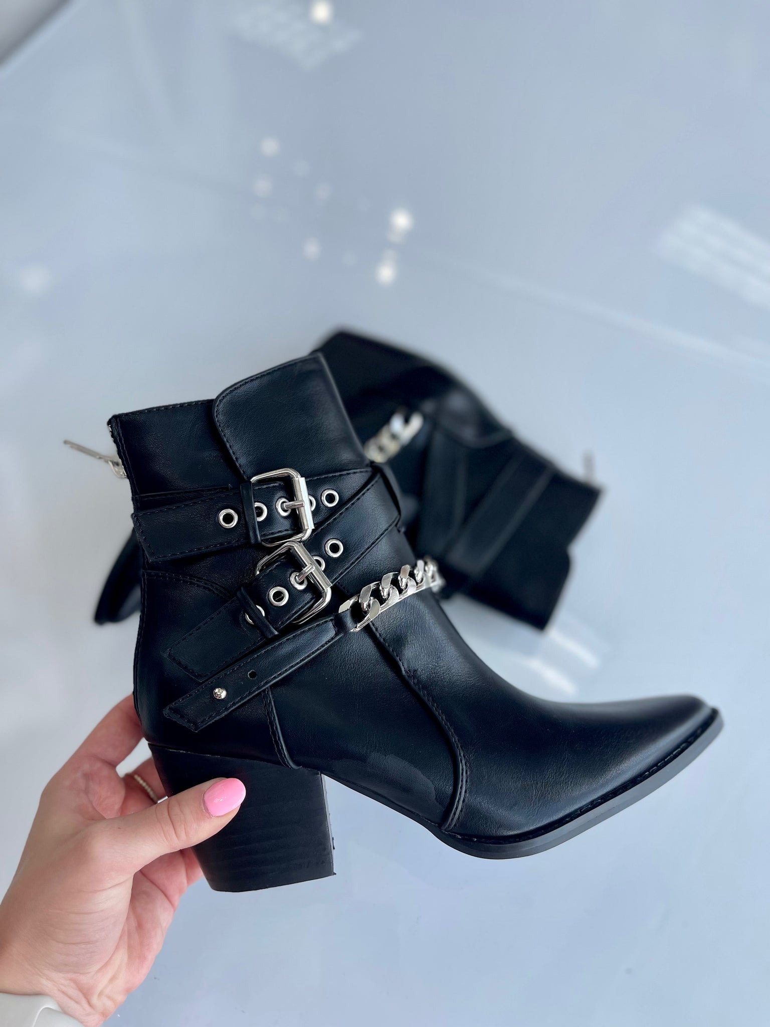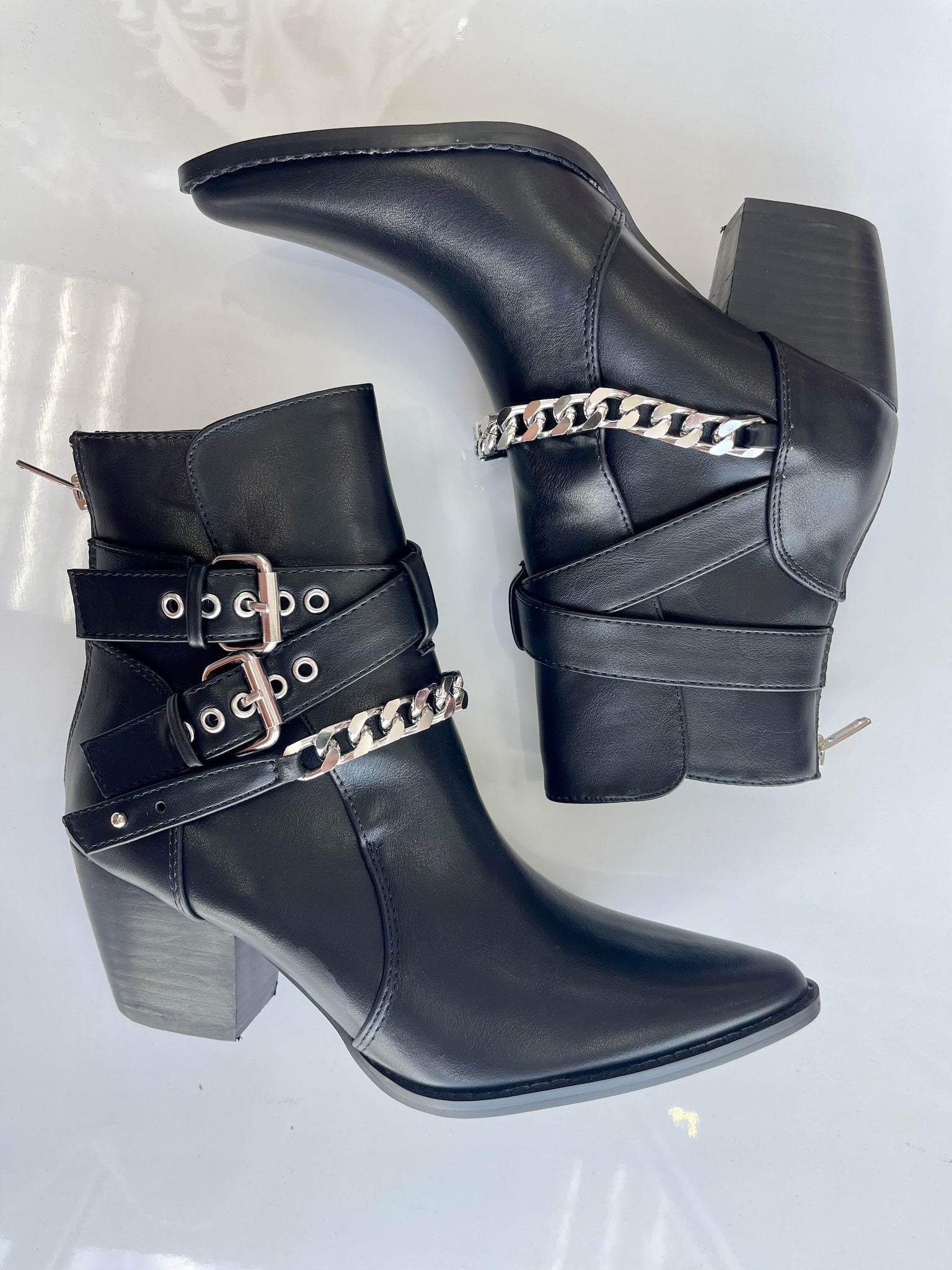 Western inspired ankle boot with buckle and chain details