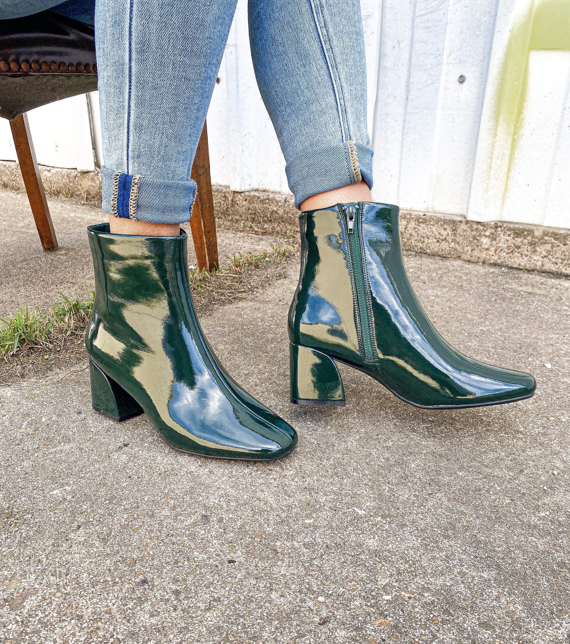 Shiny ankle bootie with a square chunky heel! Can be worn with jeans or dresses