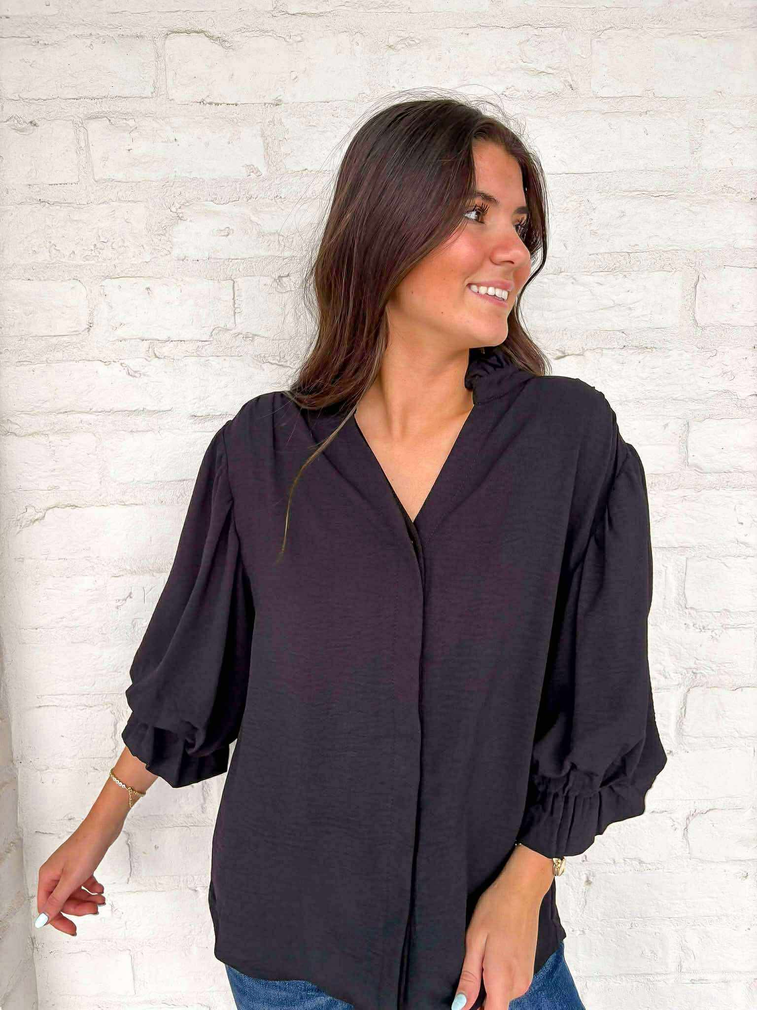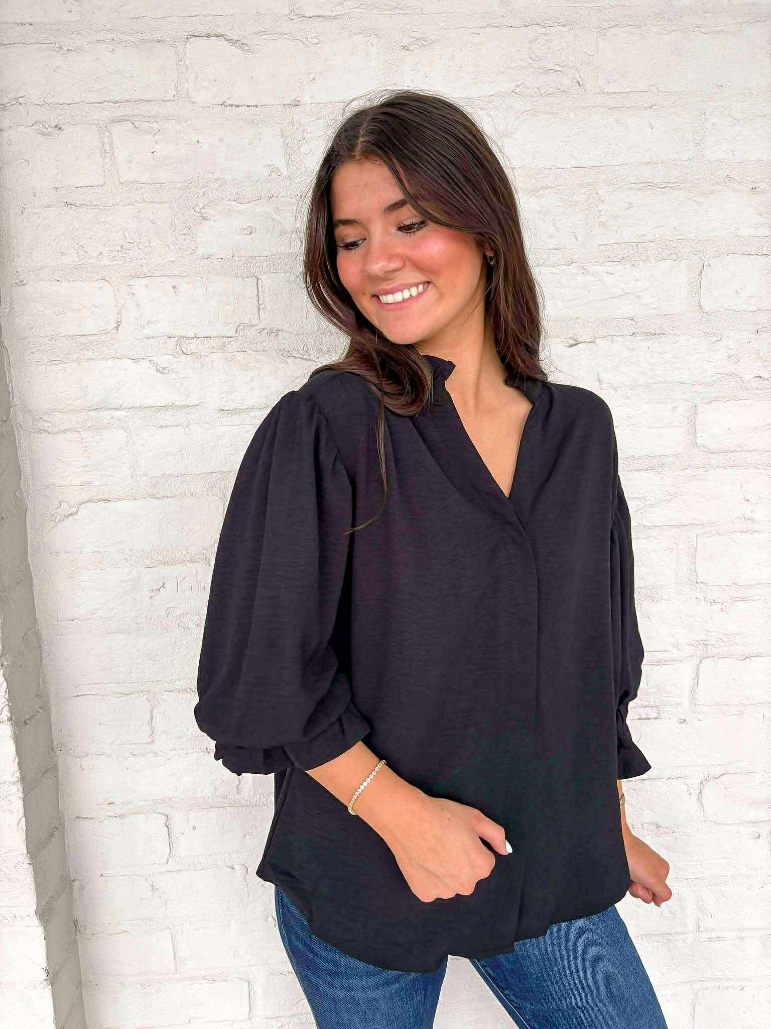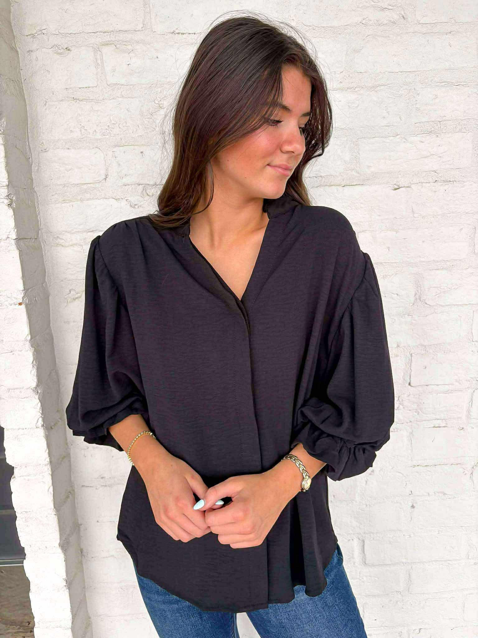 Get ready to take on anything and everything in this sleek black top. With its 3/4 length gathered balloon sleeves, you'll feel stylish, comfortable, and ready to conquer any task. Elevate your wardrobe with this versatile piece that will keep you looking and feeling confident all day long!