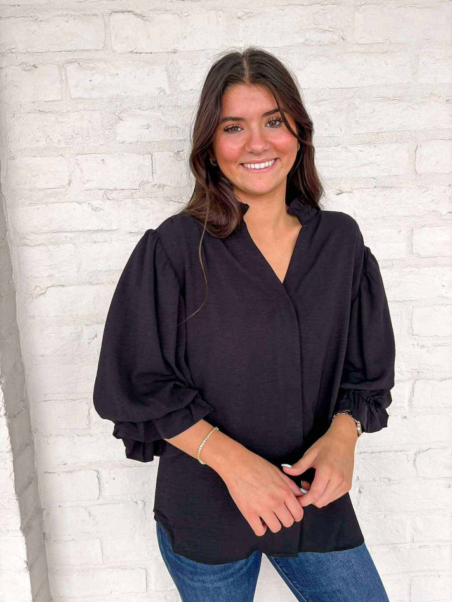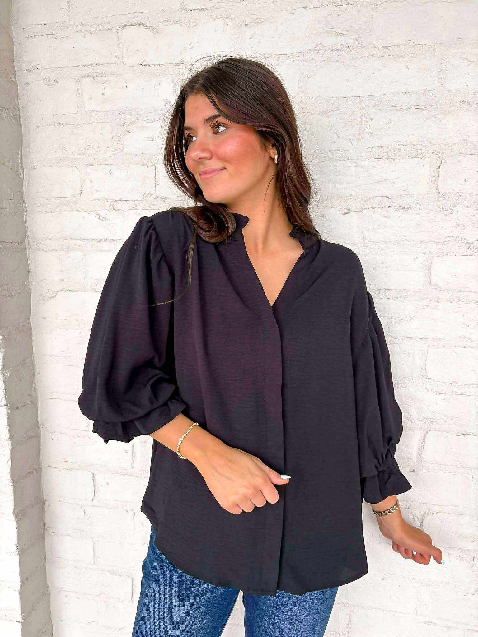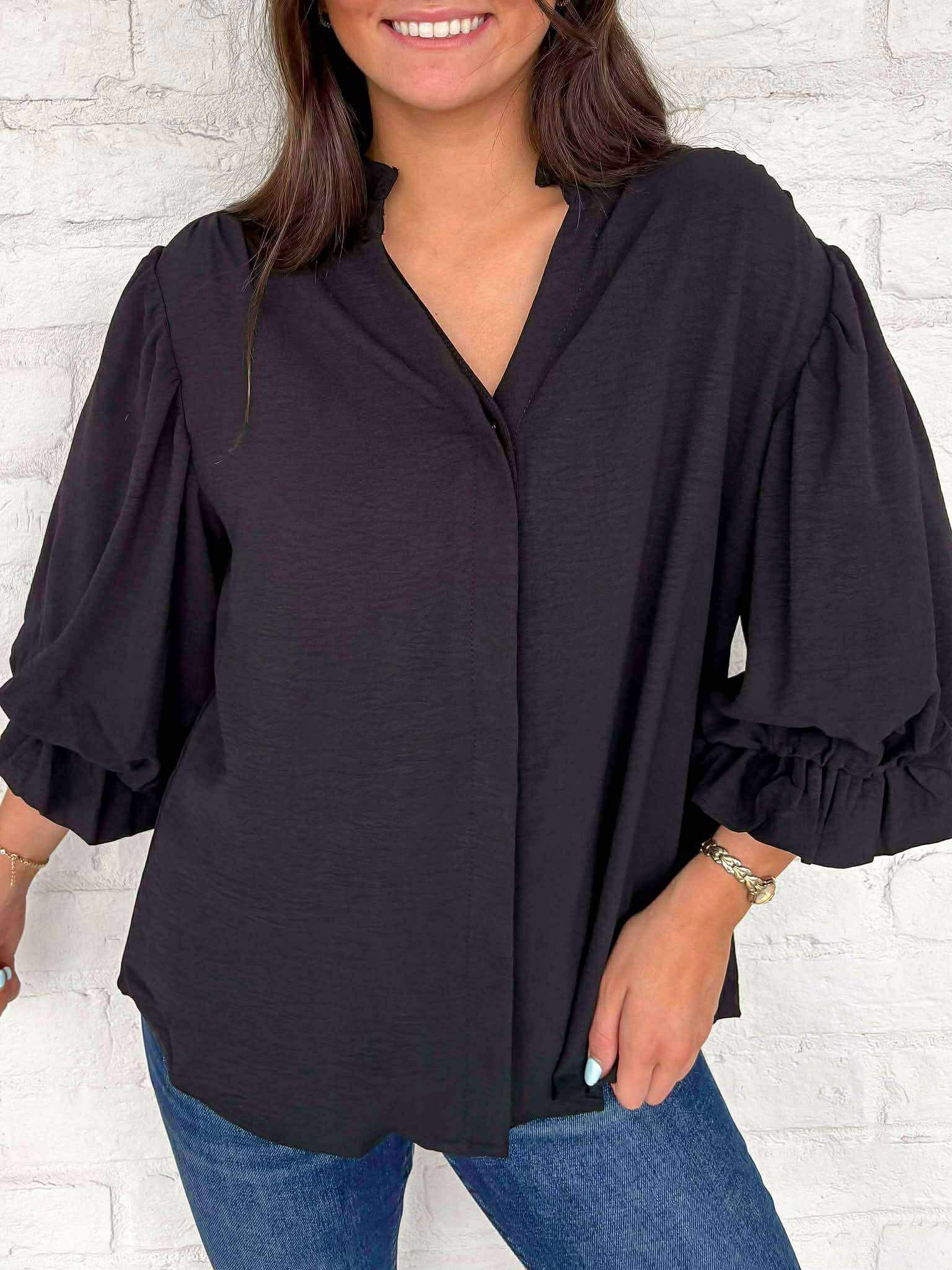 Get ready to take on anything and everything in this sleek black top. With its 3/4 length gathered balloon sleeves, you'll feel stylish, comfortable, and ready to conquer any task. Elevate your wardrobe with this versatile piece that will keep you looking and feeling confident all day long!