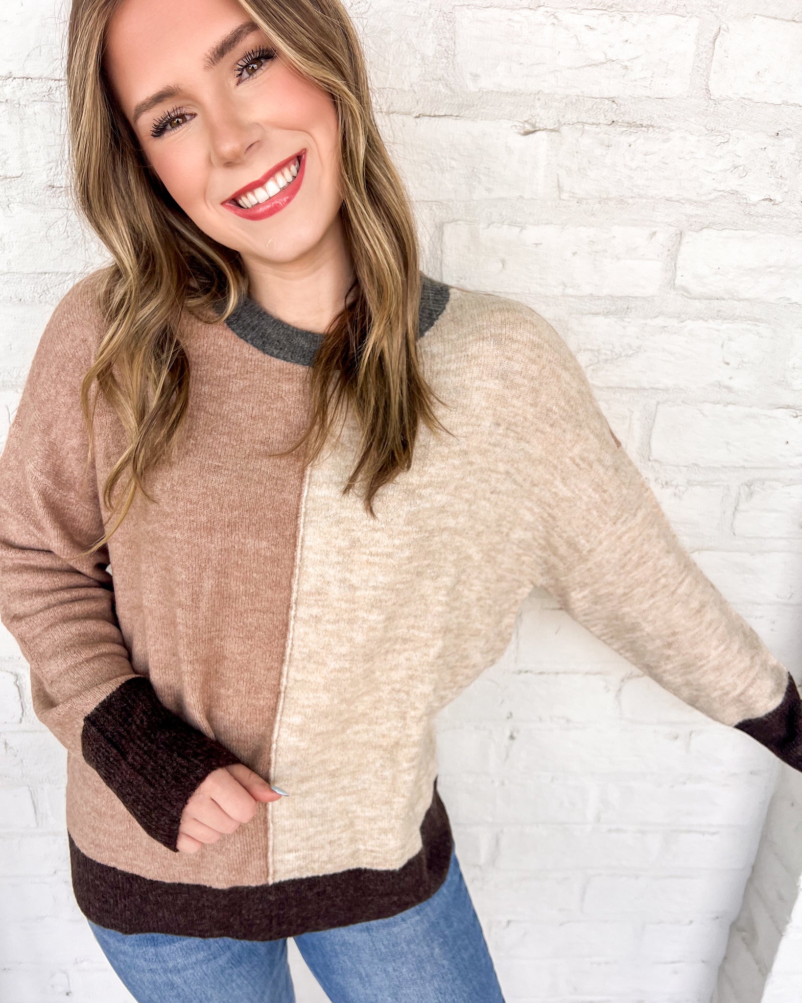 Get ready for fall fashion with our Destination For Fall Khaki Multi Top! Featuring a stylish color block design, front seam detailing, and long sleeves, this knit sweater is perfect for staying cozy and chic all season long. Elevate your wardrobe with this must-have piece and make a bold statement wherever you go.