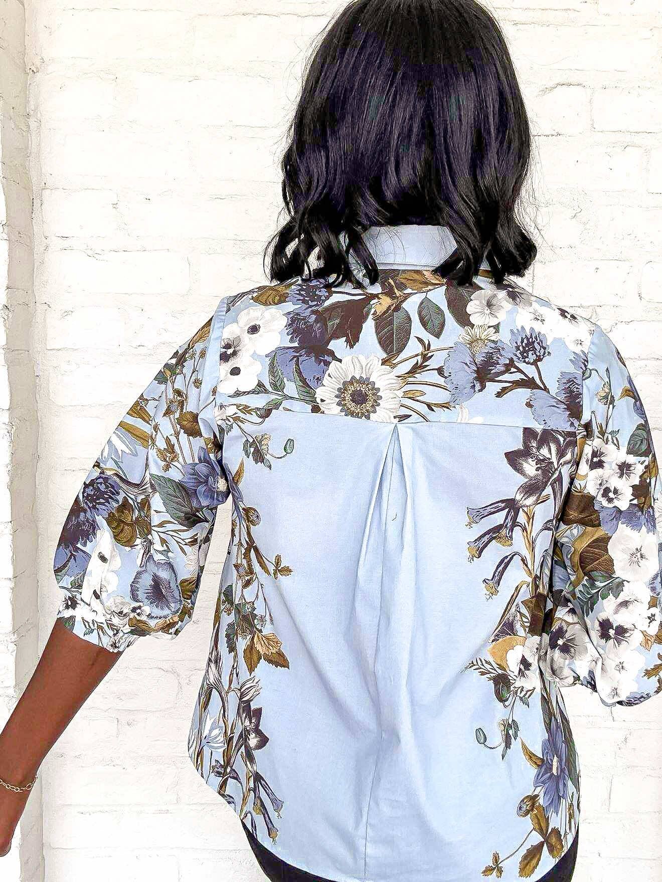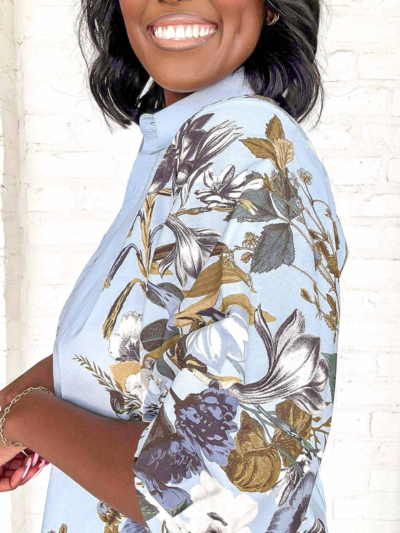 This beautiful floral blouse will make you feel like you're Going Strong! The delicate and intricate flower pattern adds a feminine touch, while the chambray fabric keeps you comfortable and stylish. Elevate your wardrobe with this charming top.
