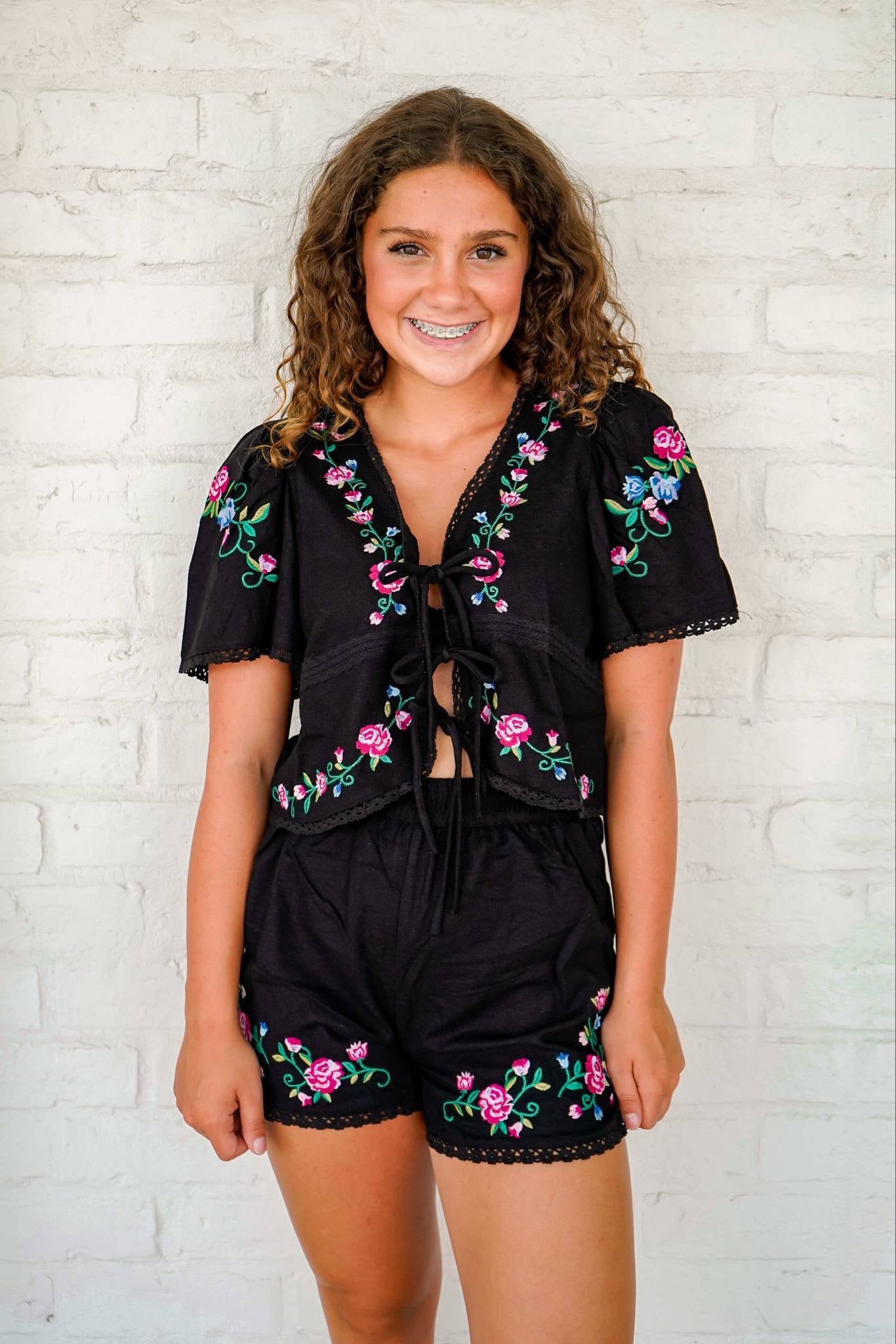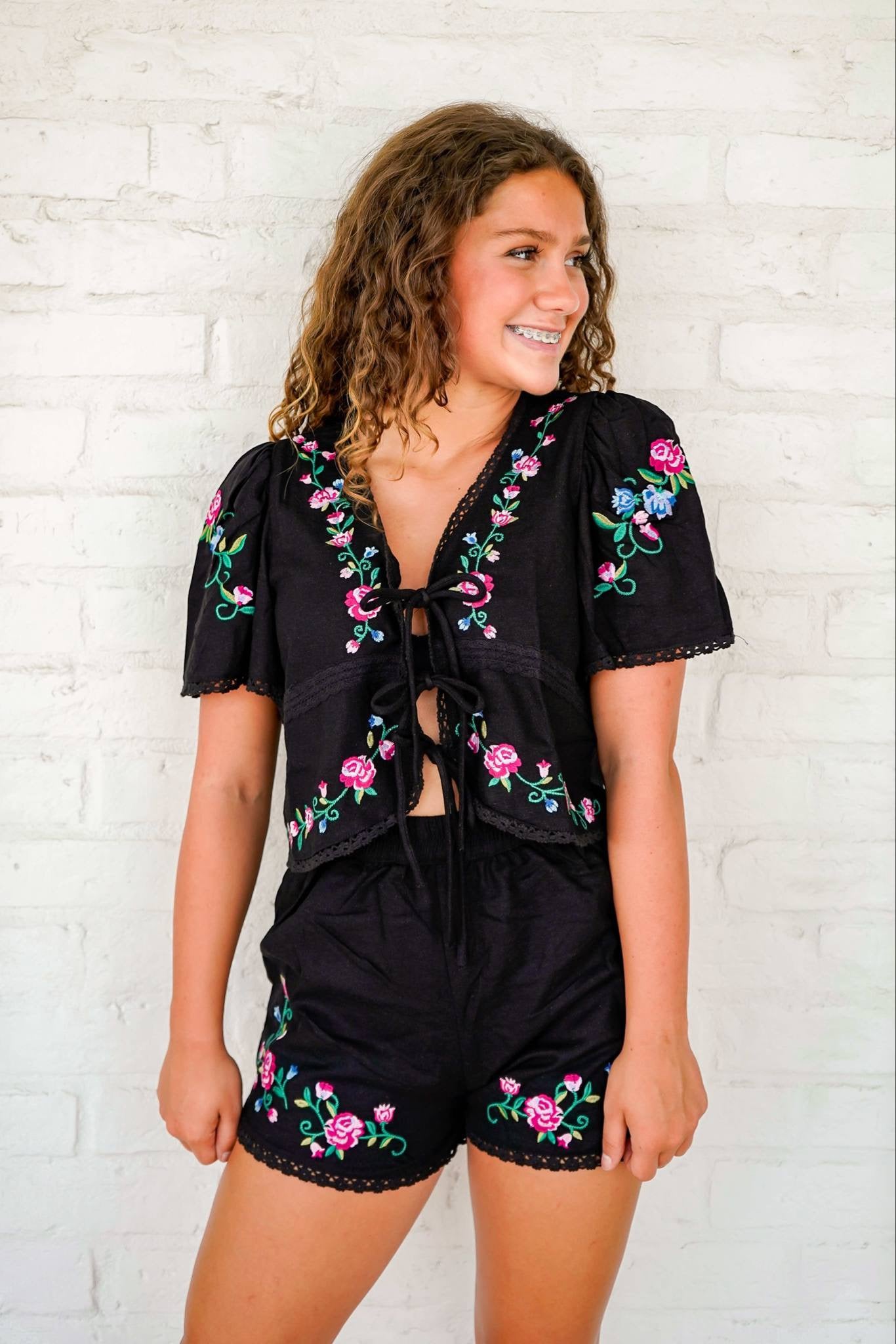 "Feel beautiful and confident in the Make Me Proud Black Top! This stunning top features delicate floral embroidery and a flattering front tie, perfect for adding a touch of elegance to any outfit. Its cropped design adds a trendy and stylish twist, making you stand out and feel proud!"