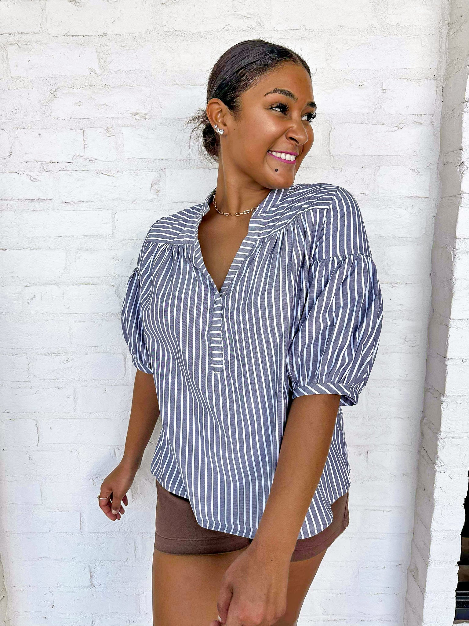 Stay stylishly on-trend with our On My Side Top! This versatile top features classic stripes that will elevate any outfit. Perfect for any occasion, this top will keep you looking chic and on point. Add this must-have piece to your wardrobe and be ready for any adventure that comes your way!