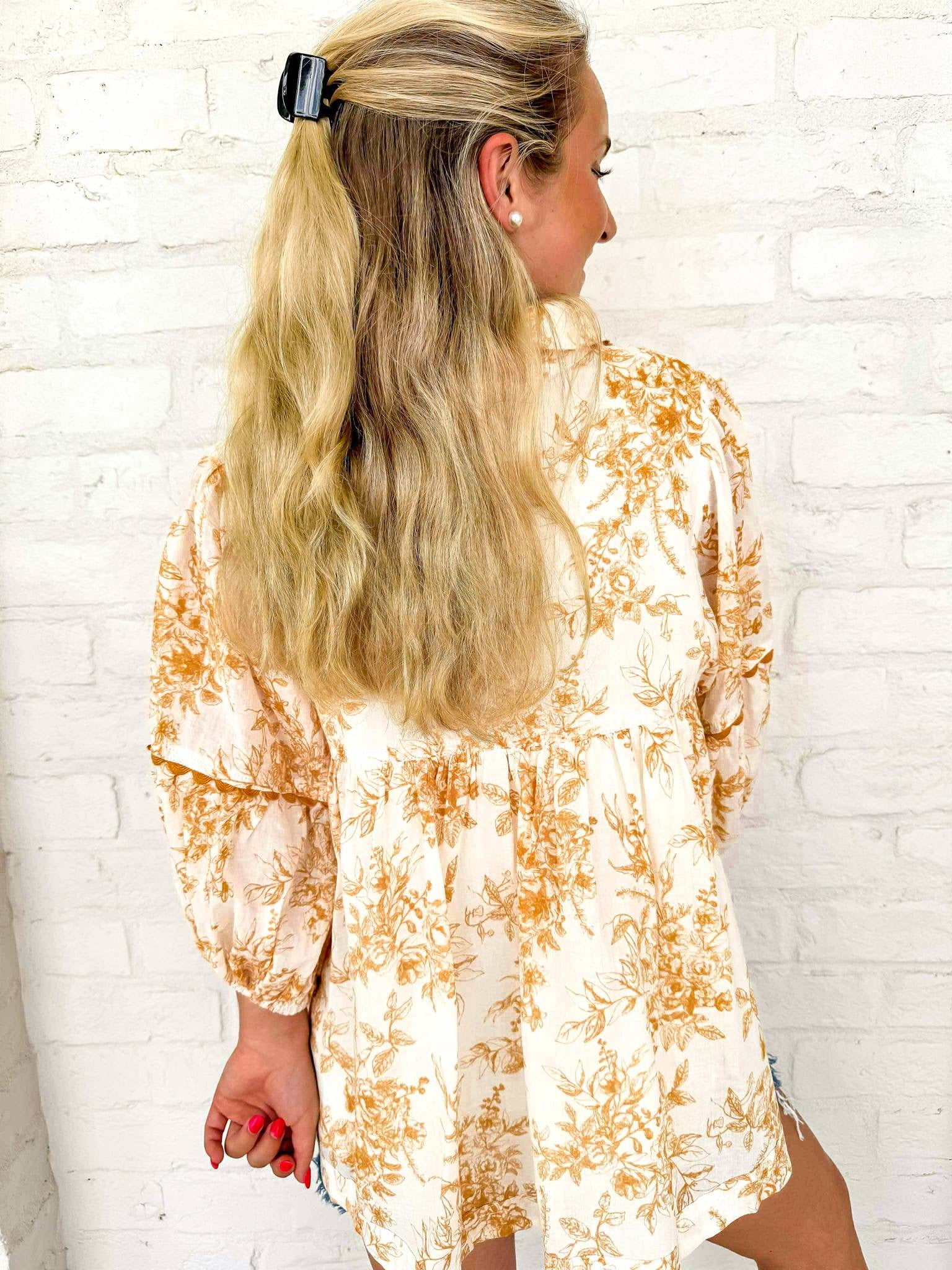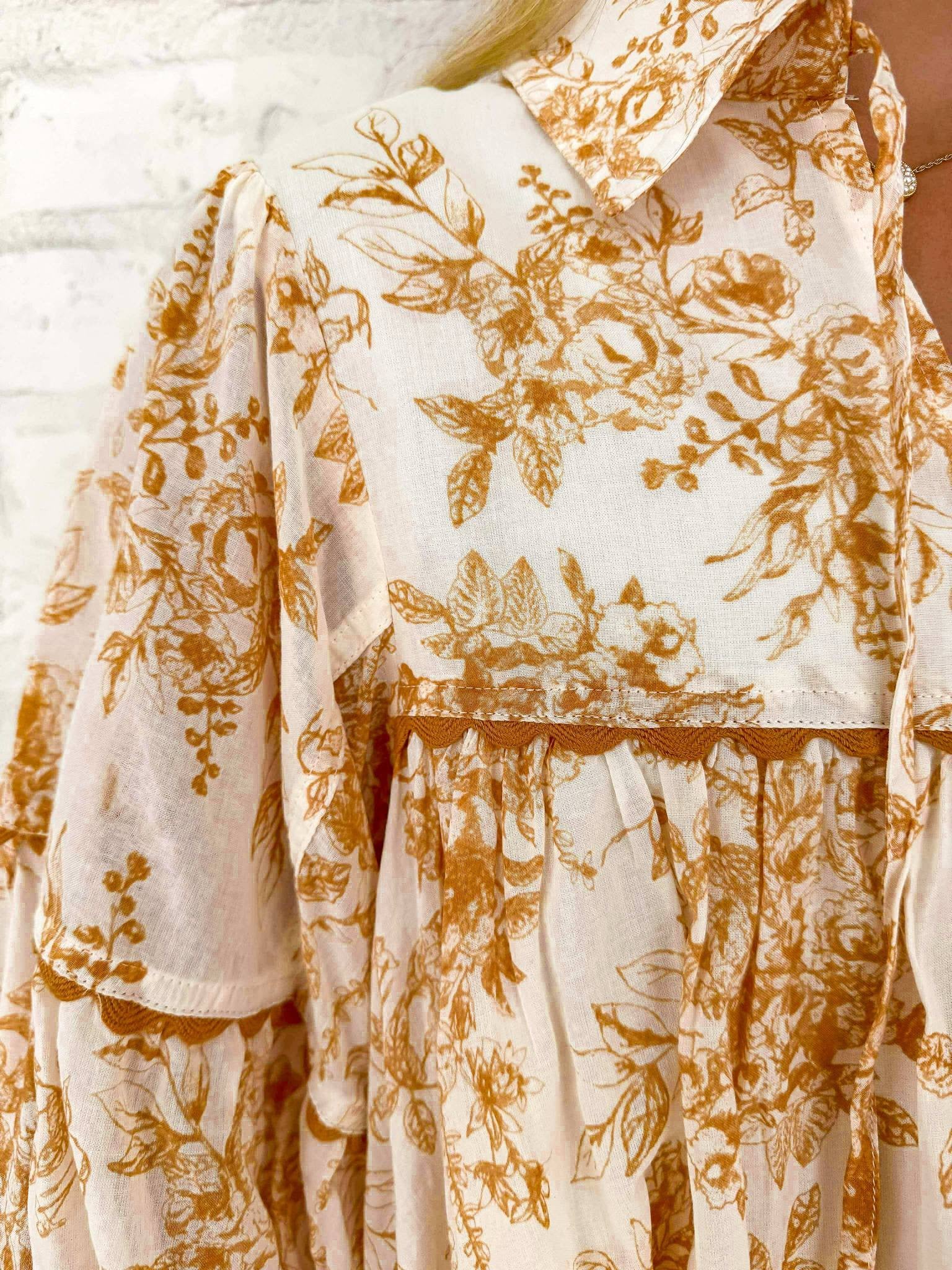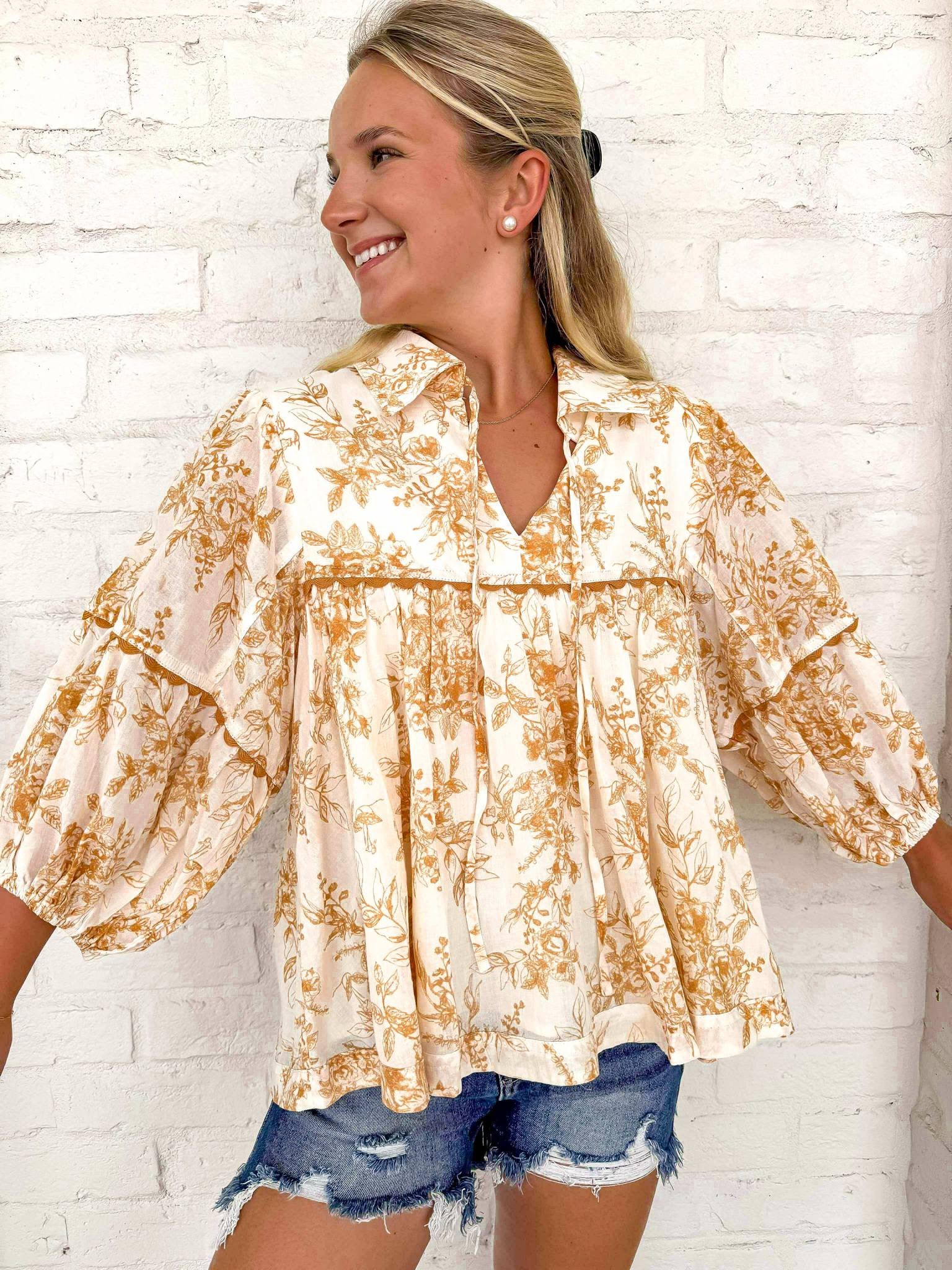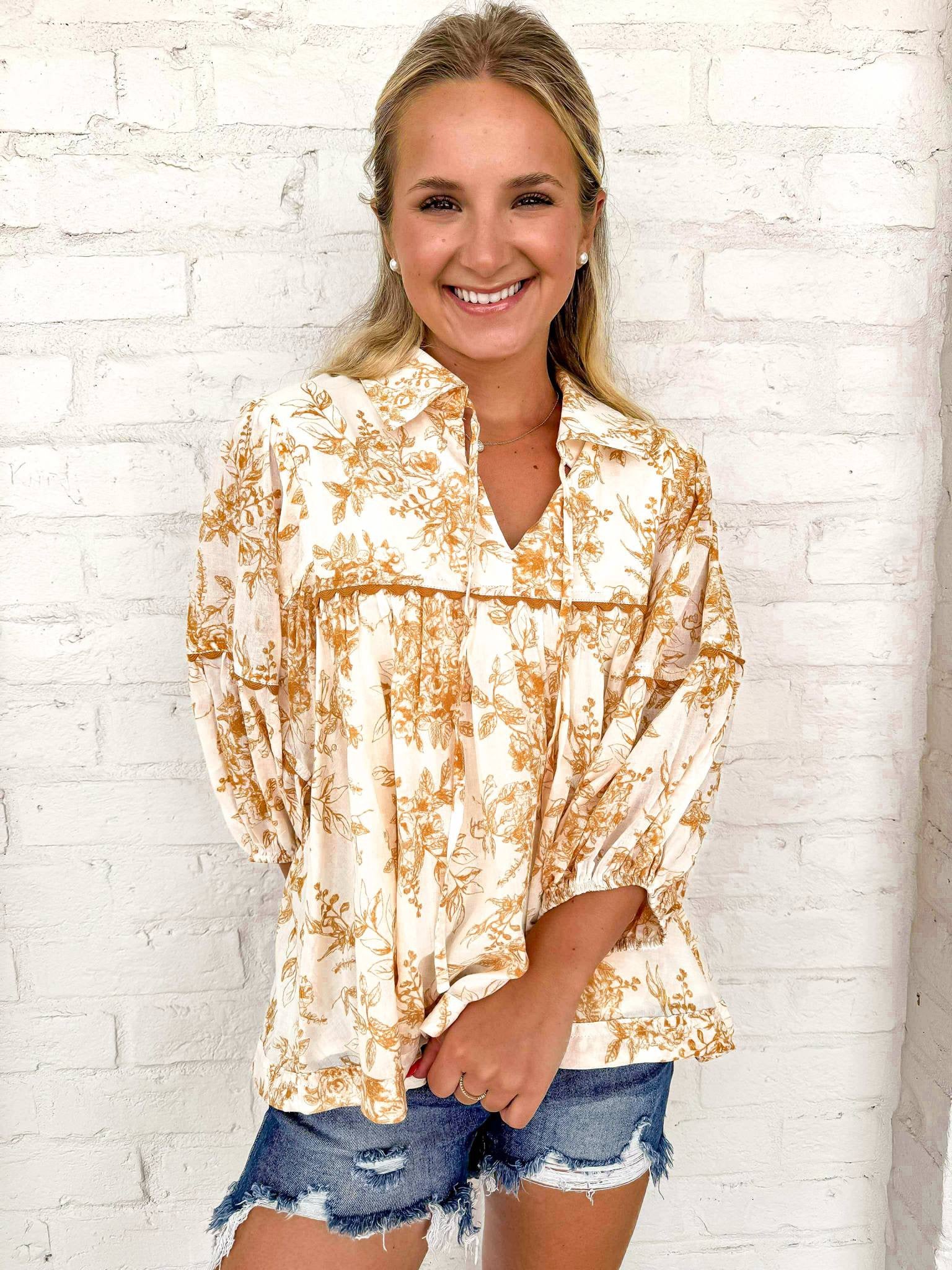 Indulge in your own pretty little moment with our exclusive floral print tie neck top. Elevate your style with this elegant top, perfect for any occasion. Add a touch of sophistication to your wardrobe and make a statement with this must-have piece.