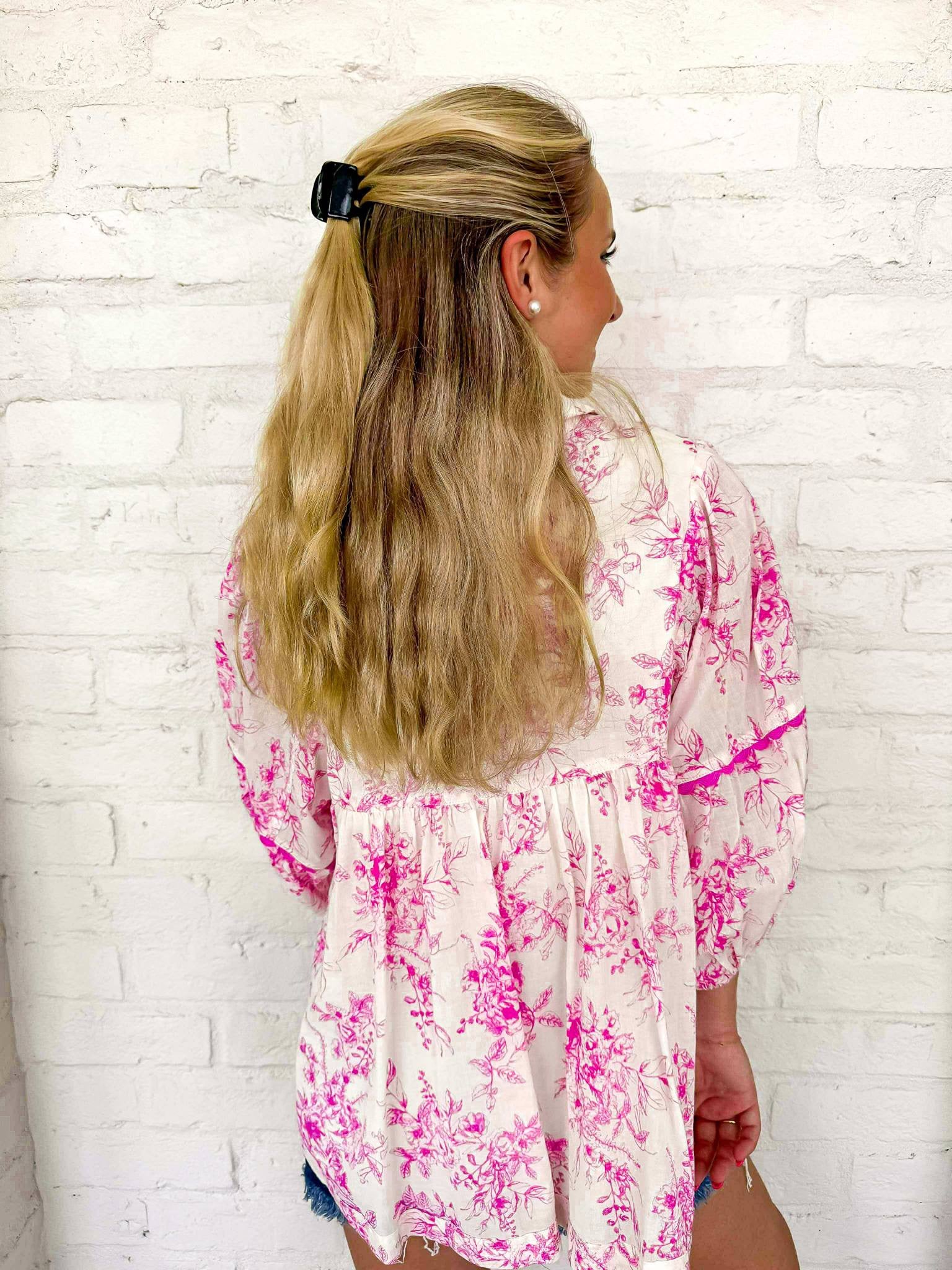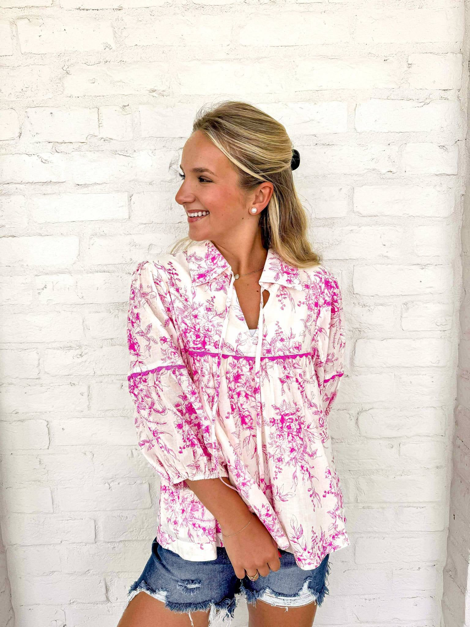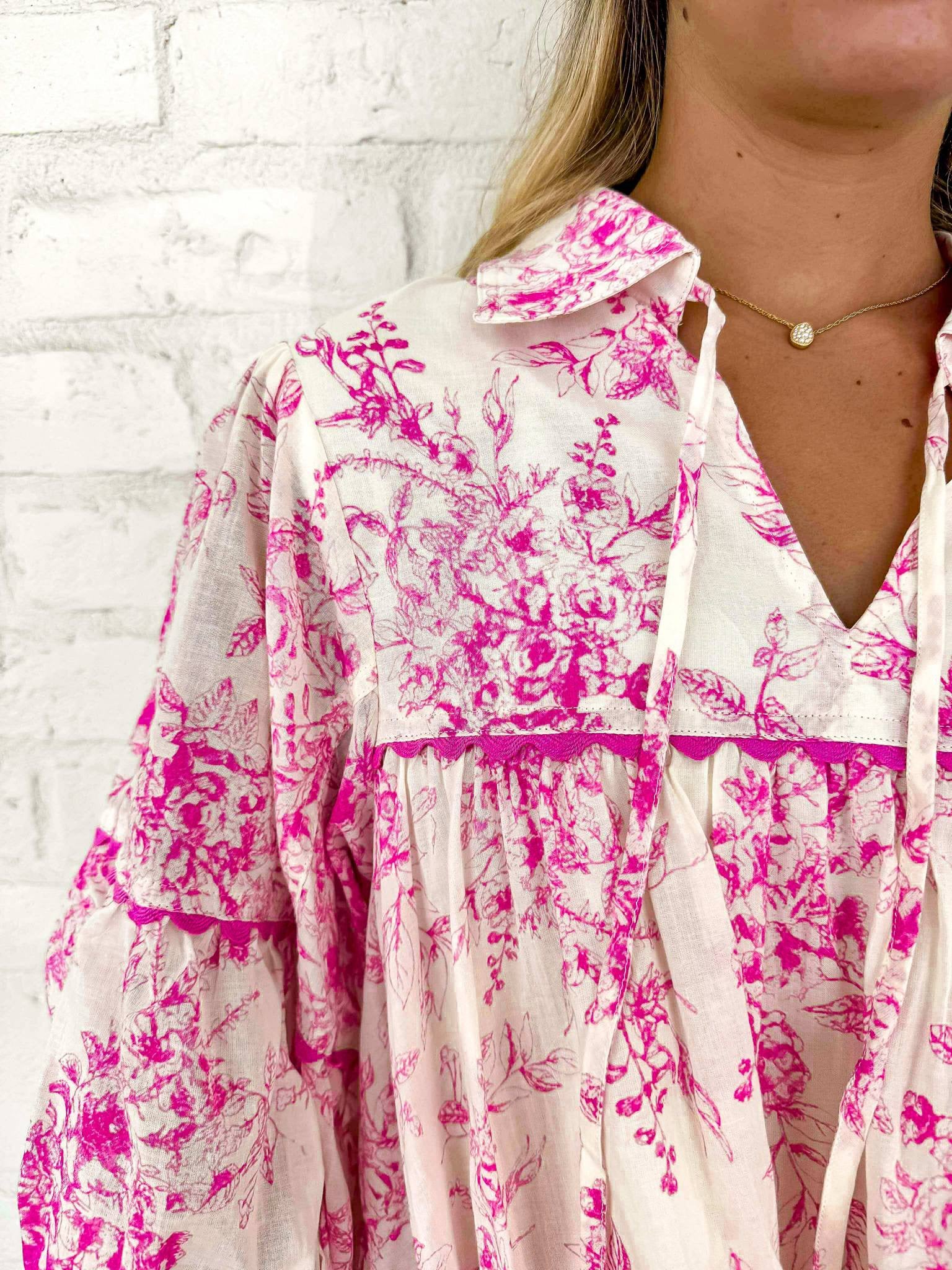Indulge in your own pretty little moment with our exclusive floral print tie neck top. Elevate your style with this elegant top, perfect for any occasion. Add a touch of sophistication to your wardrobe and make a statement with this must-have piece.