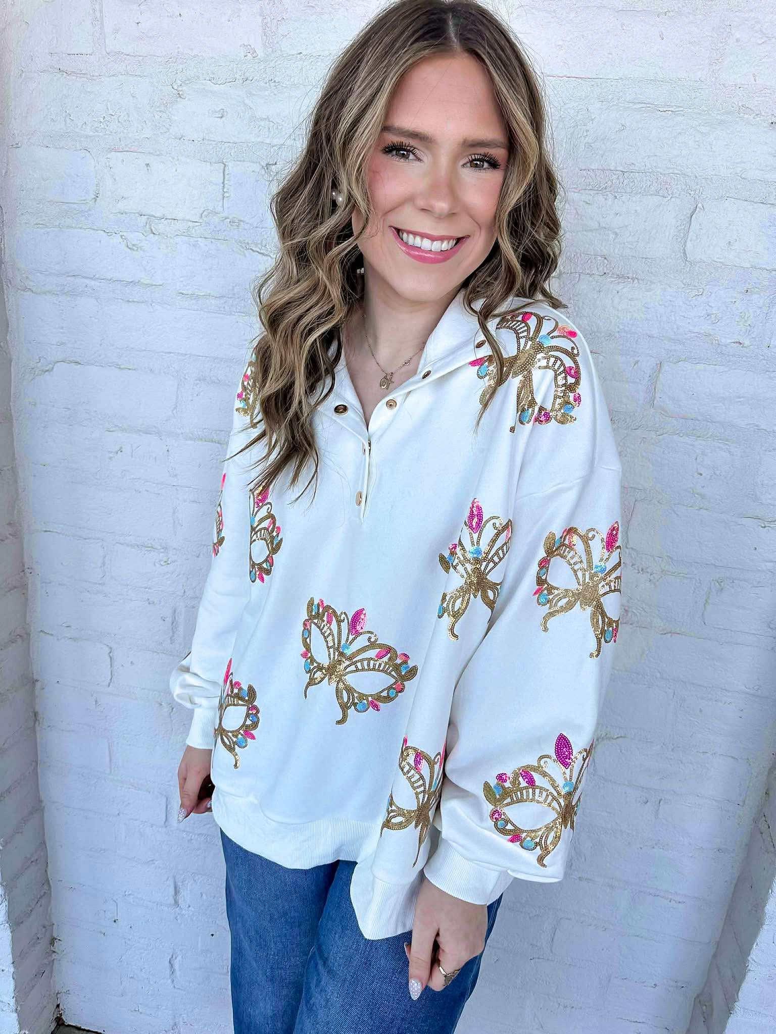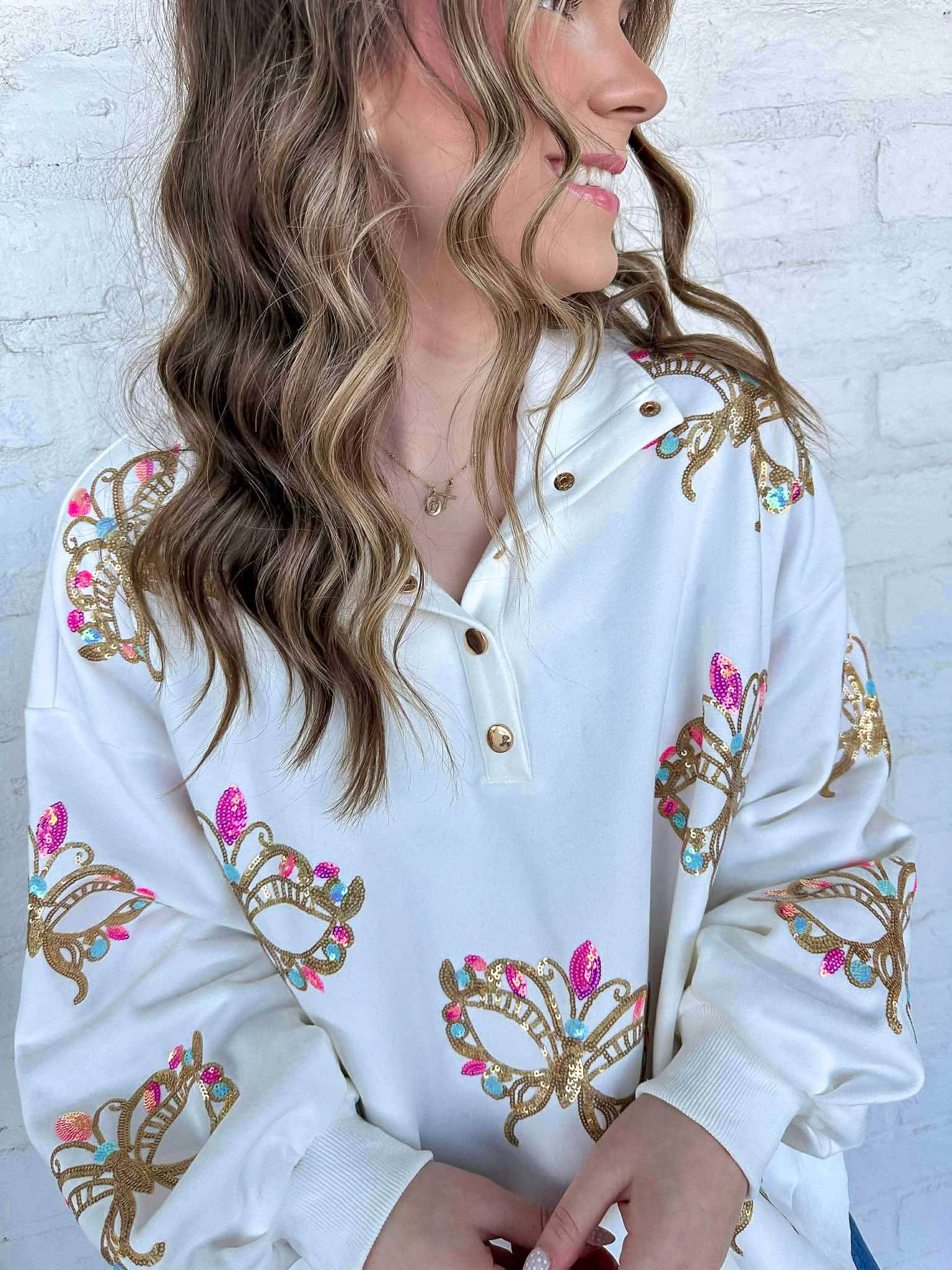 Elevate your style with the Iridescent Mask Mock Neck Button Up! This versatile piece is perfect for any season, effortlessly blending girly charm with modern sophistication. Its unique iridescent fabric catches the light beautifully, making you feel extraordinary wherever you go. Embrace your magic!