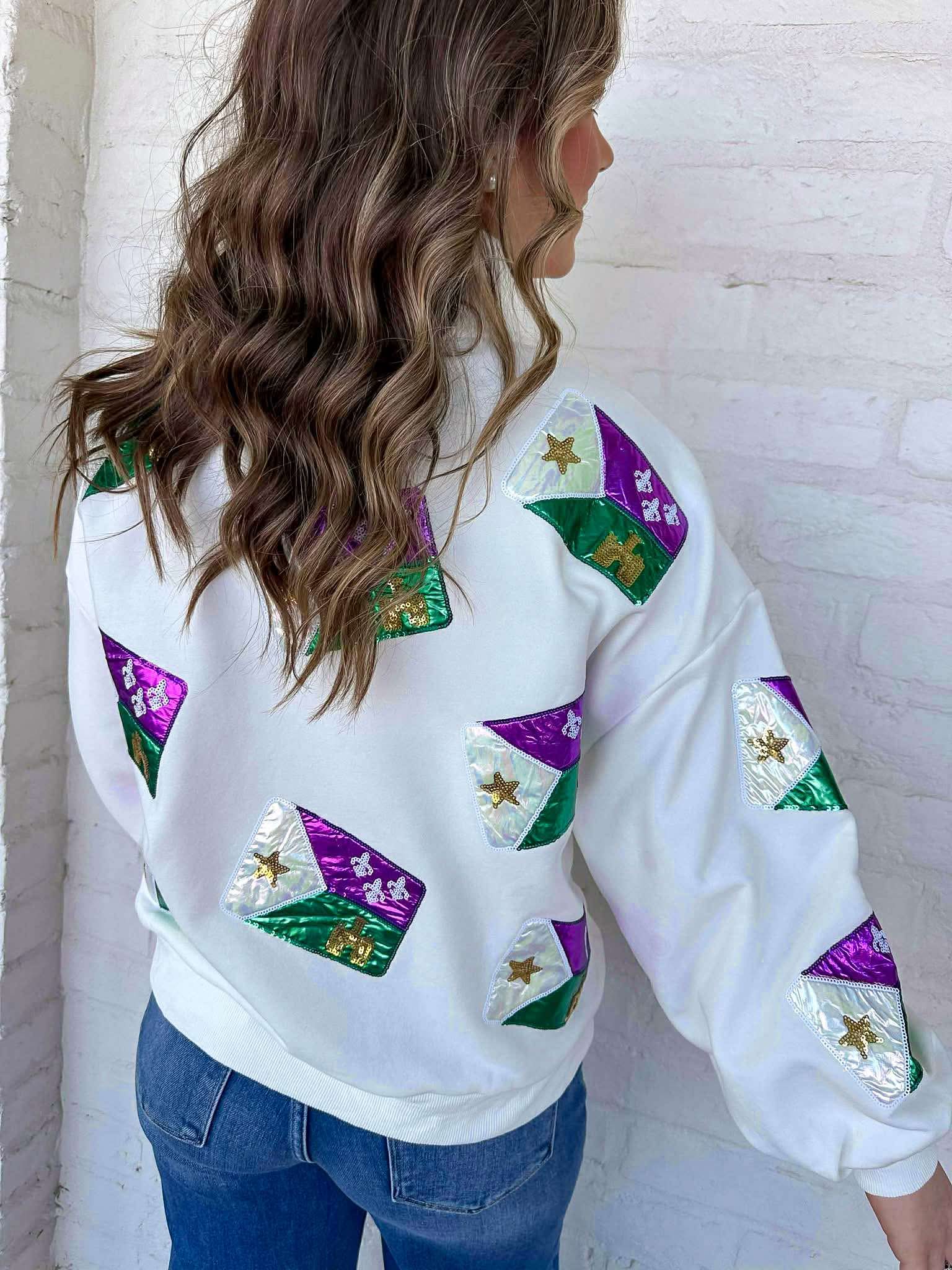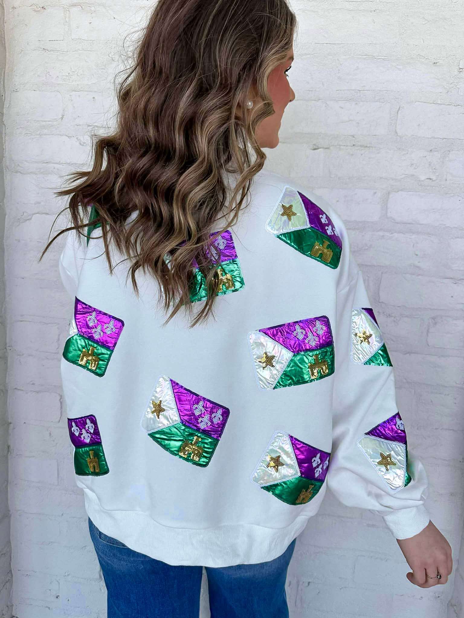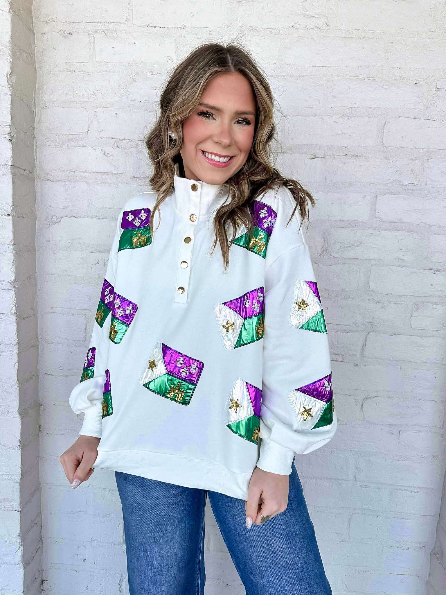 Mardi Gras Acadian Flag Mock Neck Button Up Pullover (front & back)