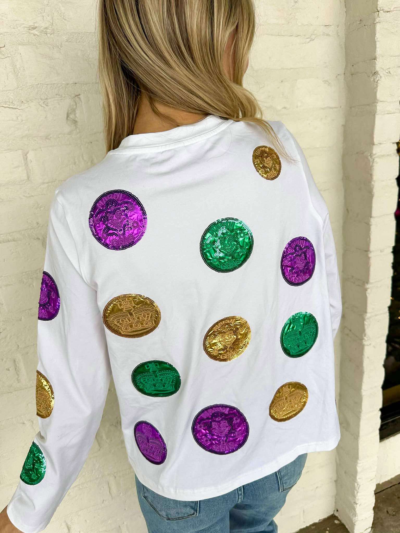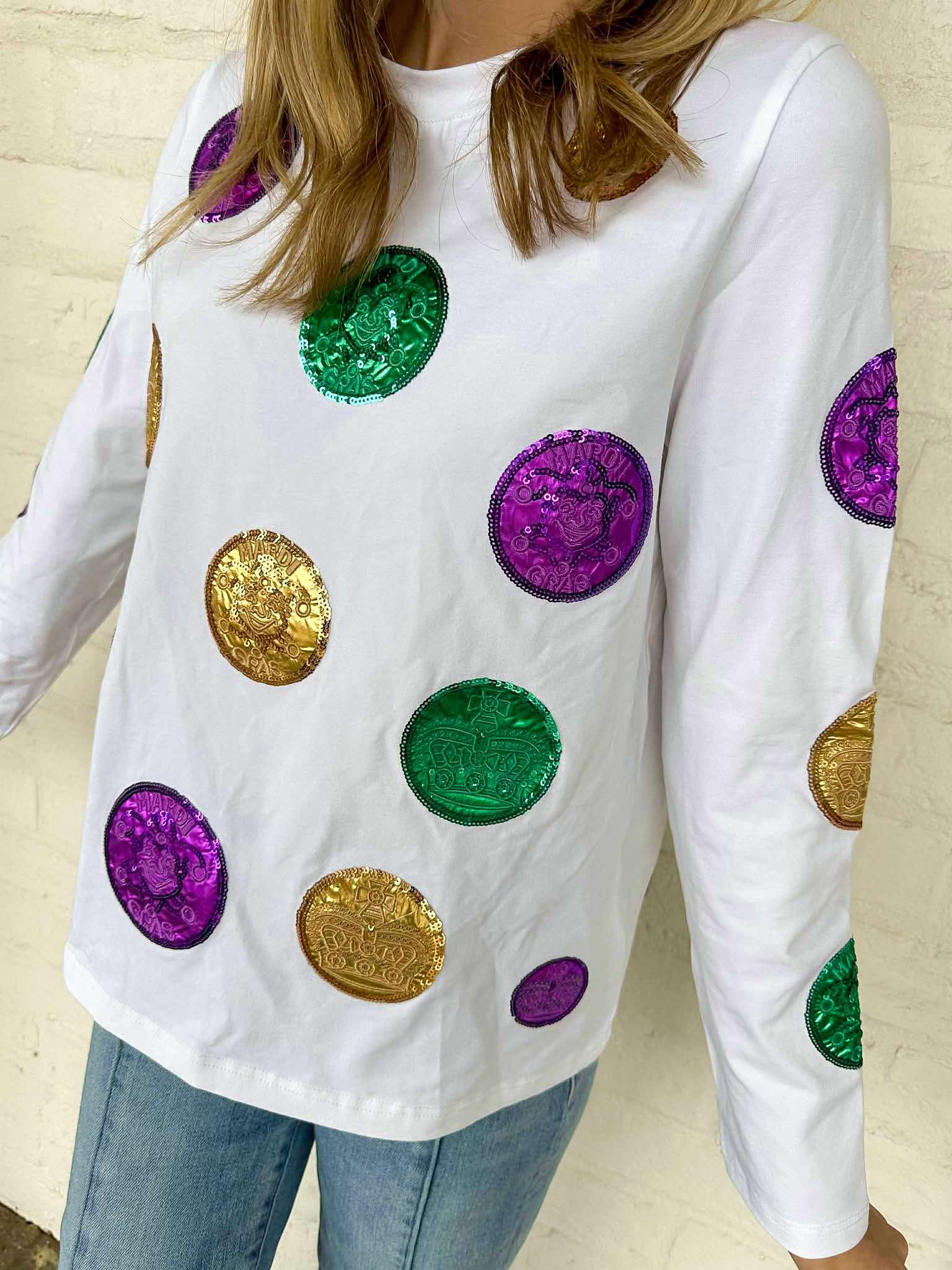 Celebrate the spirit of Mardi Gras with the Mardi Gras Scattered Doubloon Long sleeve! Adorned with vibrant doubloons on both front and back, this shirt embodies the festive energy of the season. Wear it to bring joy and a touch of color to any celebration!