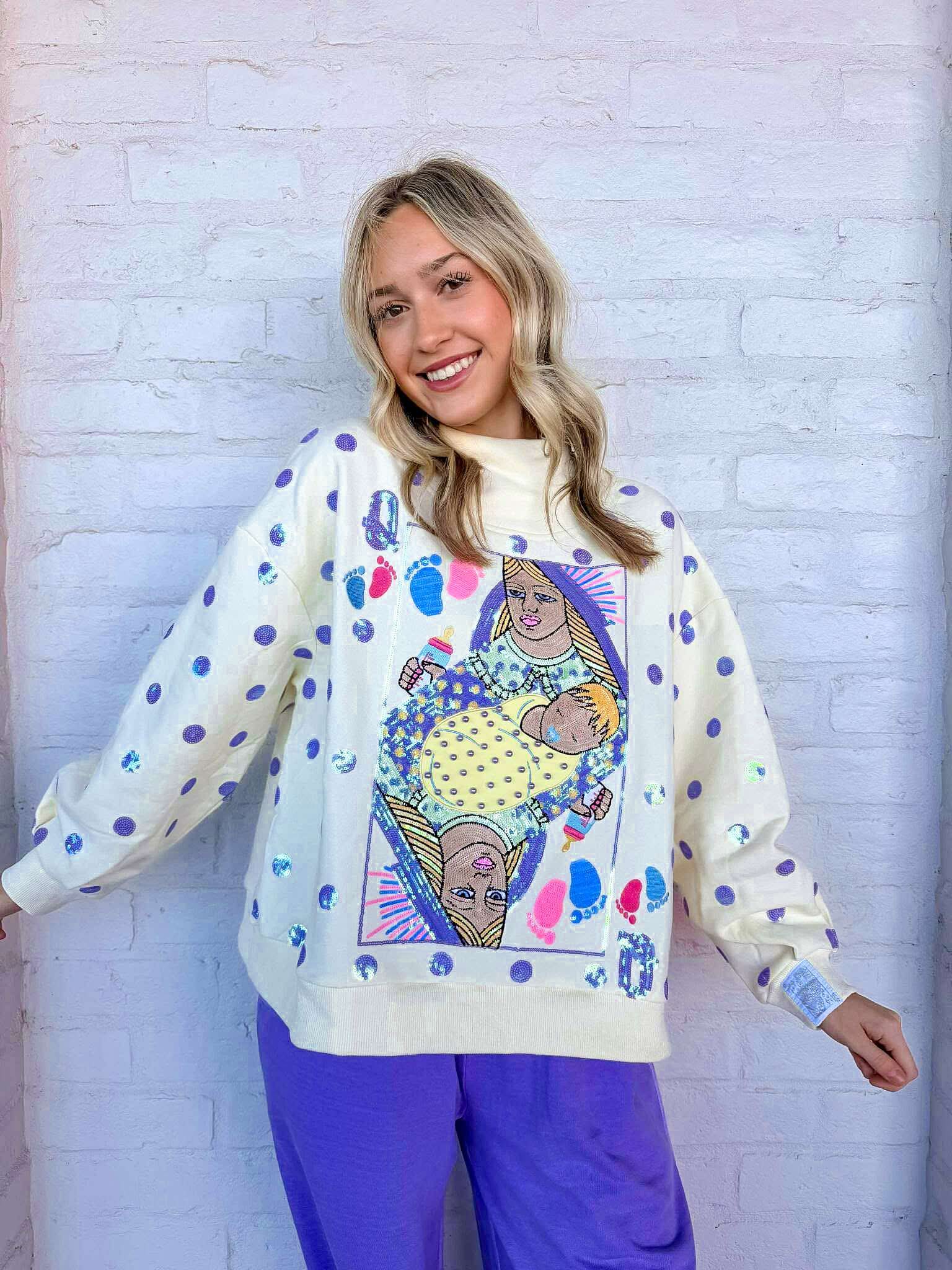 Embrace your playful side with the Queen Of Sparkles Beige & Lavender Polka Dot Sparkle Logo Sweatshirt! This charming piece not only showcases a delightful polka dot design celebrating motherhood in style. Wrap yourself in the warmth of comfort and confidence—it’s time to shine!