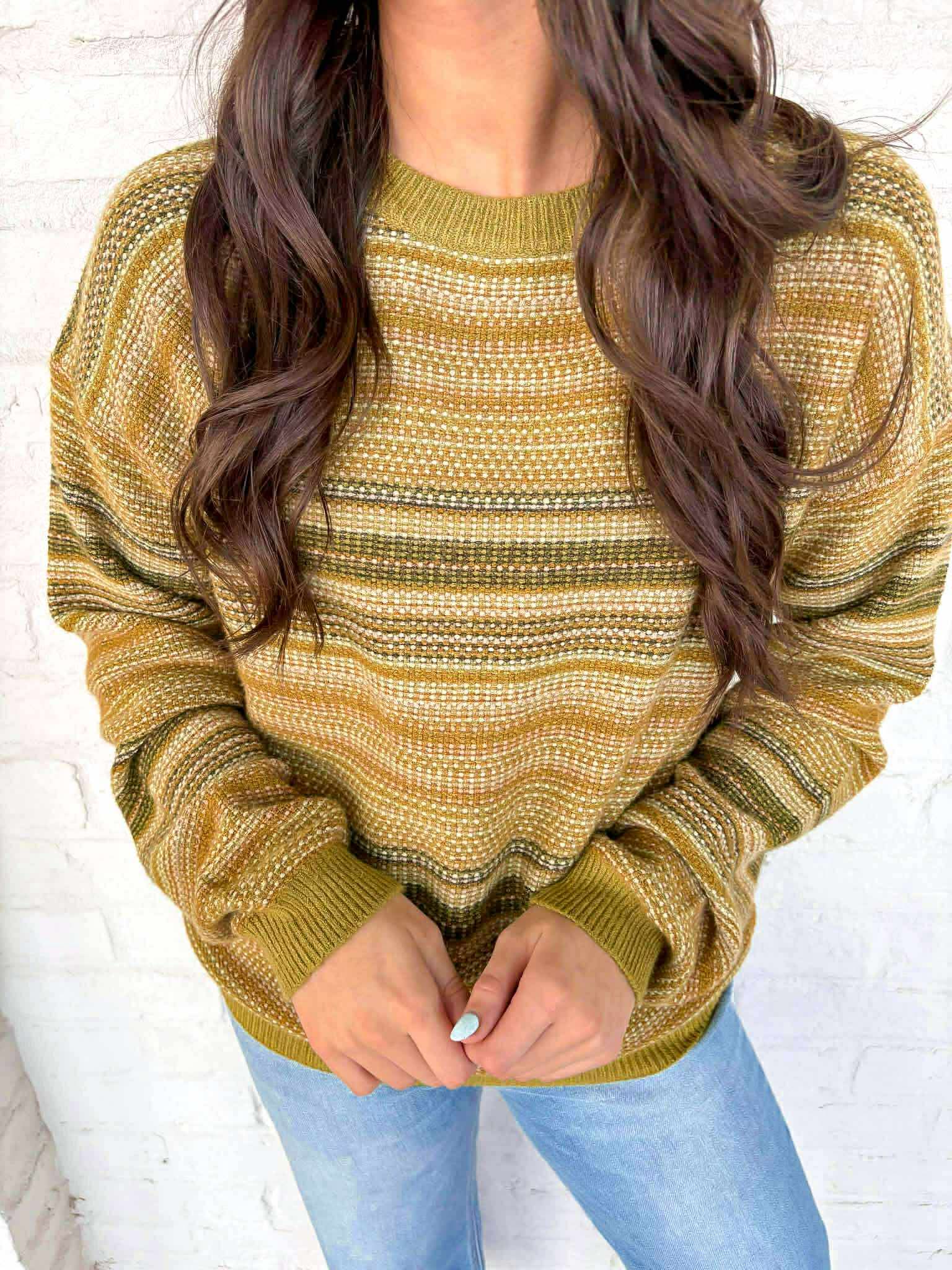 Experience the beauty of nature with our Reach Out For More Olive Sweater. With an ombré design of olive stripes, this sweater is a stylish reminder to embrace the natural world. Let it inspire you to reach for more in life and add a touch of nature to your wardrobe.