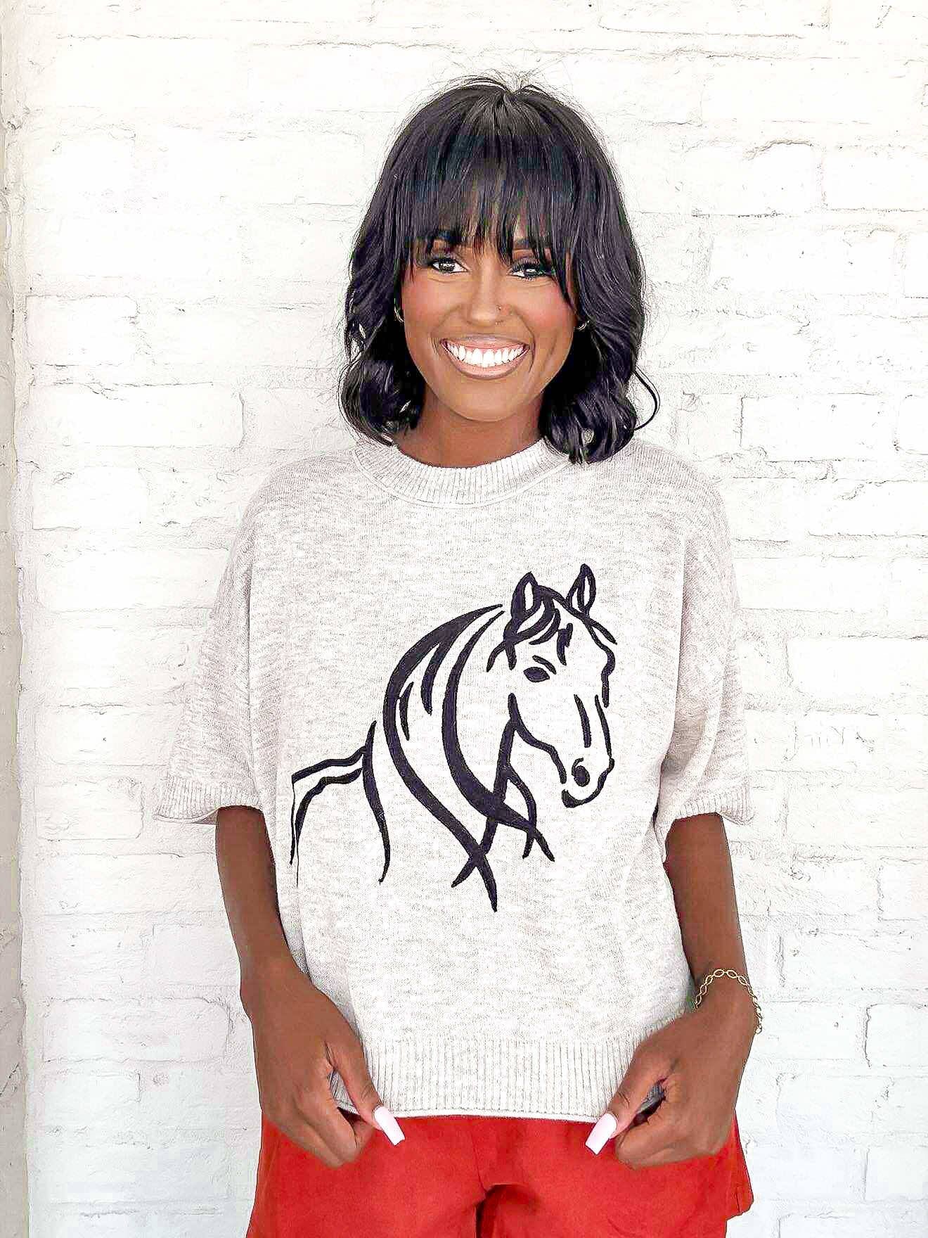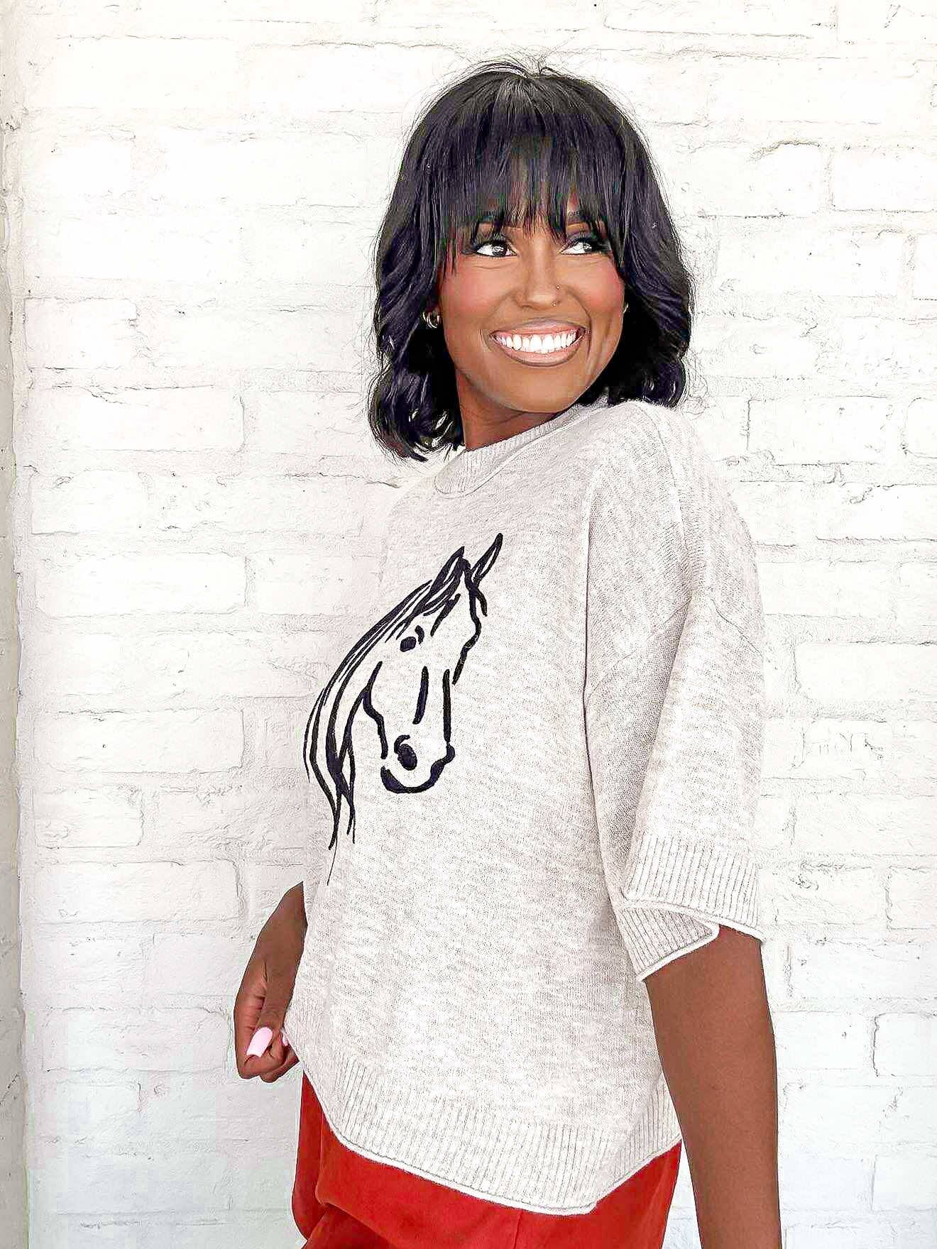 Elevate your style with our Saddle Up Oatmeal Top, featuring a stunning horse print. With this top, you'll make a statement while feeling comfortable and chic. Perfect for any occasion, show off your love for horses in a stylish and unique way. Order now to add this must-have piece to your wardrobe!