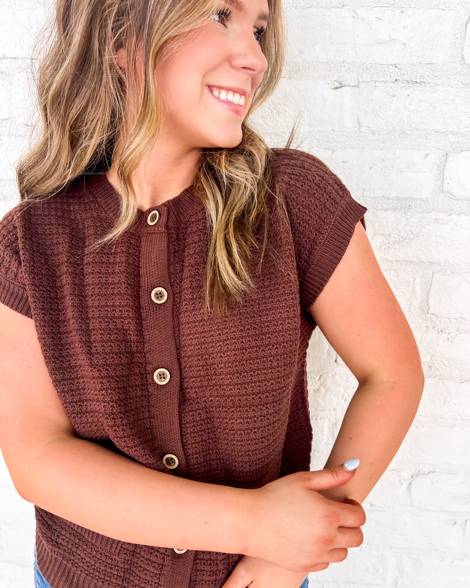"The Send My Regards Top is a versatile must-have for your wardrobe. This button-down short sleeve knit cardigan vest adds a touch of elegance to any outfit. Its lightweight and comfortable fabric ensures all-day wearability. Stand out in style and make a statement!"
