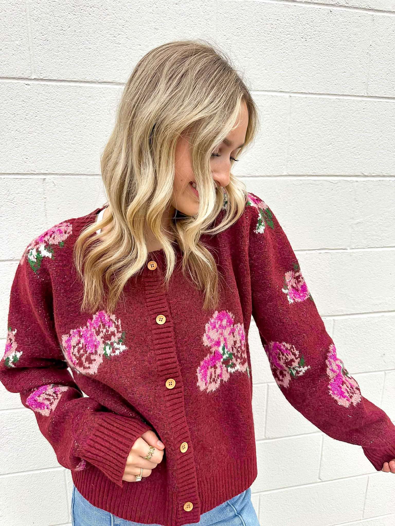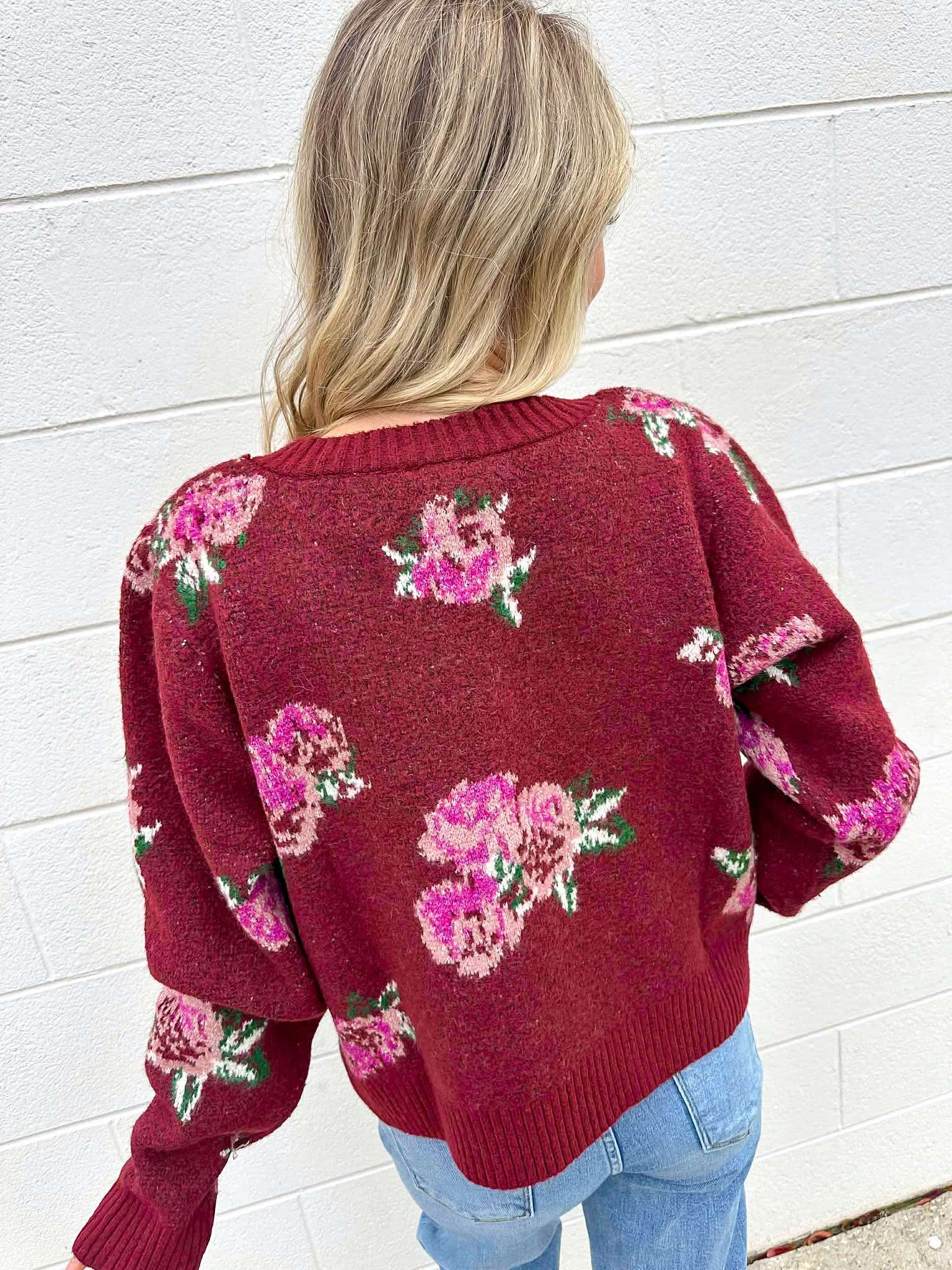 Indulge in the beauty and elegance of our Sweet Reflections Wine Floral Sweater. Featuring stunning floral tops, this sweater offers a touch of femininity and charm to any outfit. Turn heads and feel confident in this must-have piece for any wardrobe. Elevate your style and embrace your inner goddess with this irresistible sweater.