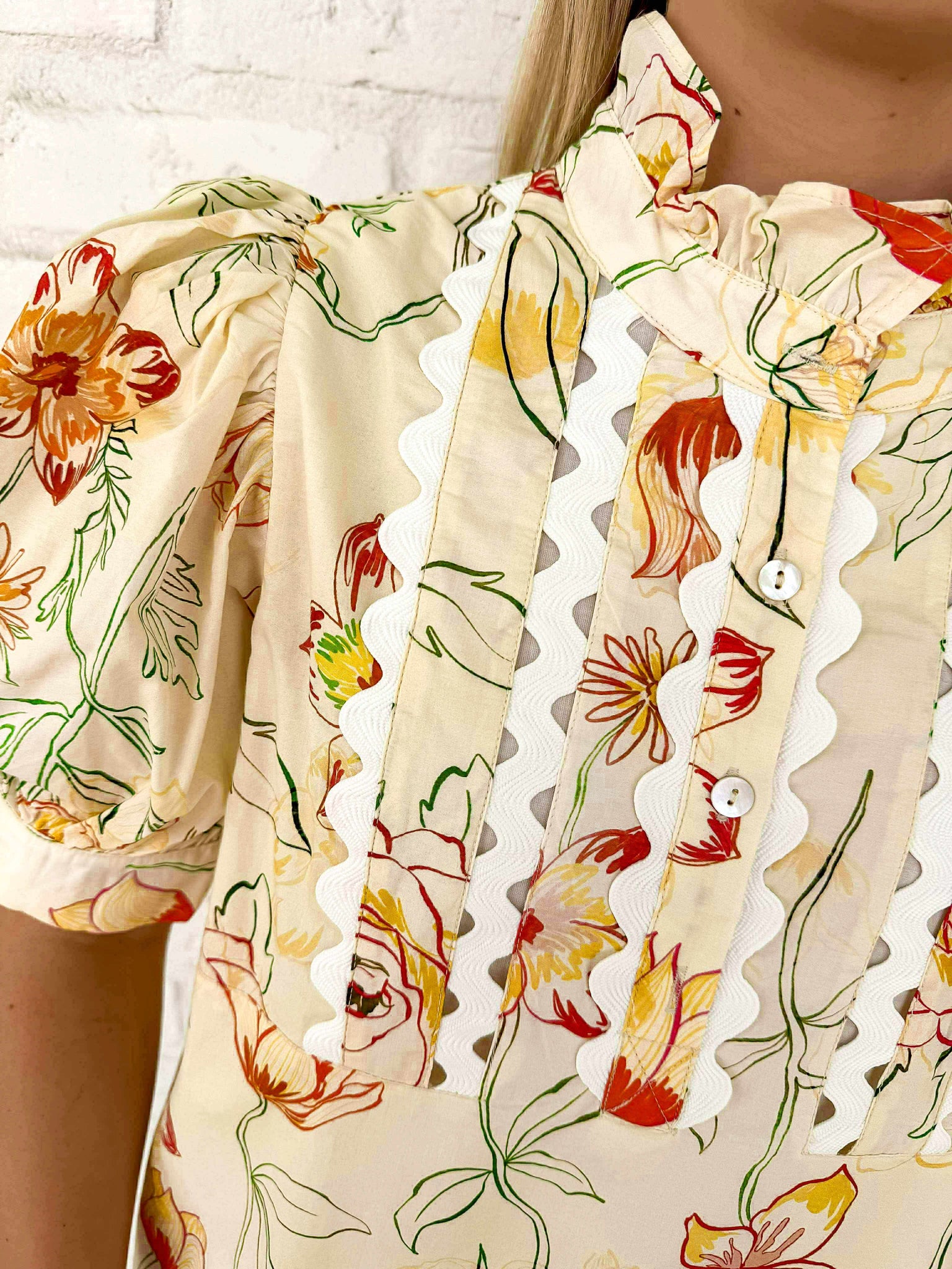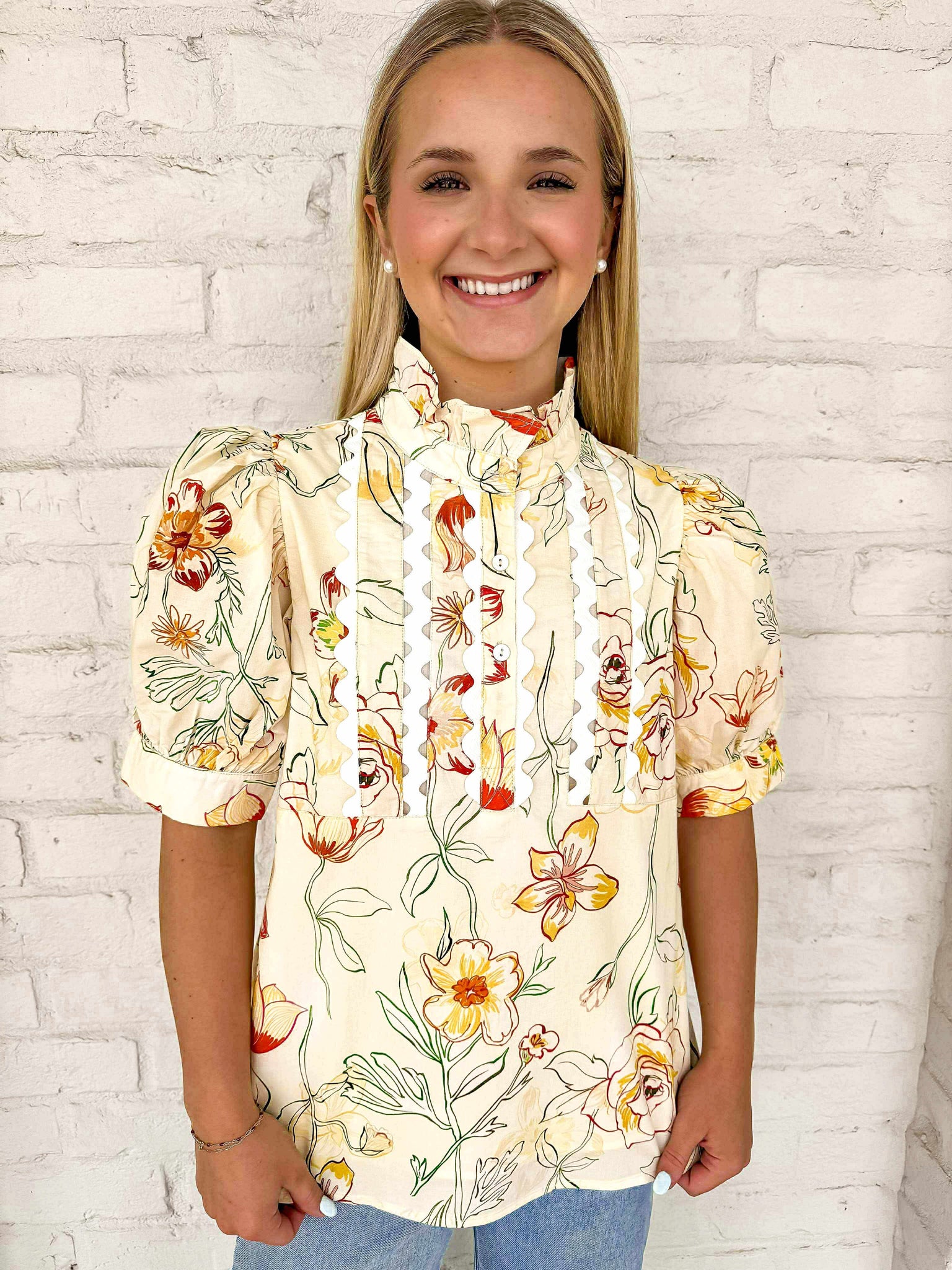 Embrace the beauty of spring with our Take With Ease Yellow Top. The vibrant yellow floral pattern and delicate ricrac details add a touch of elegance to any outfit. Light and breezy, this top is perfect for any occasion and will make you stand out in a sea of ordinary.