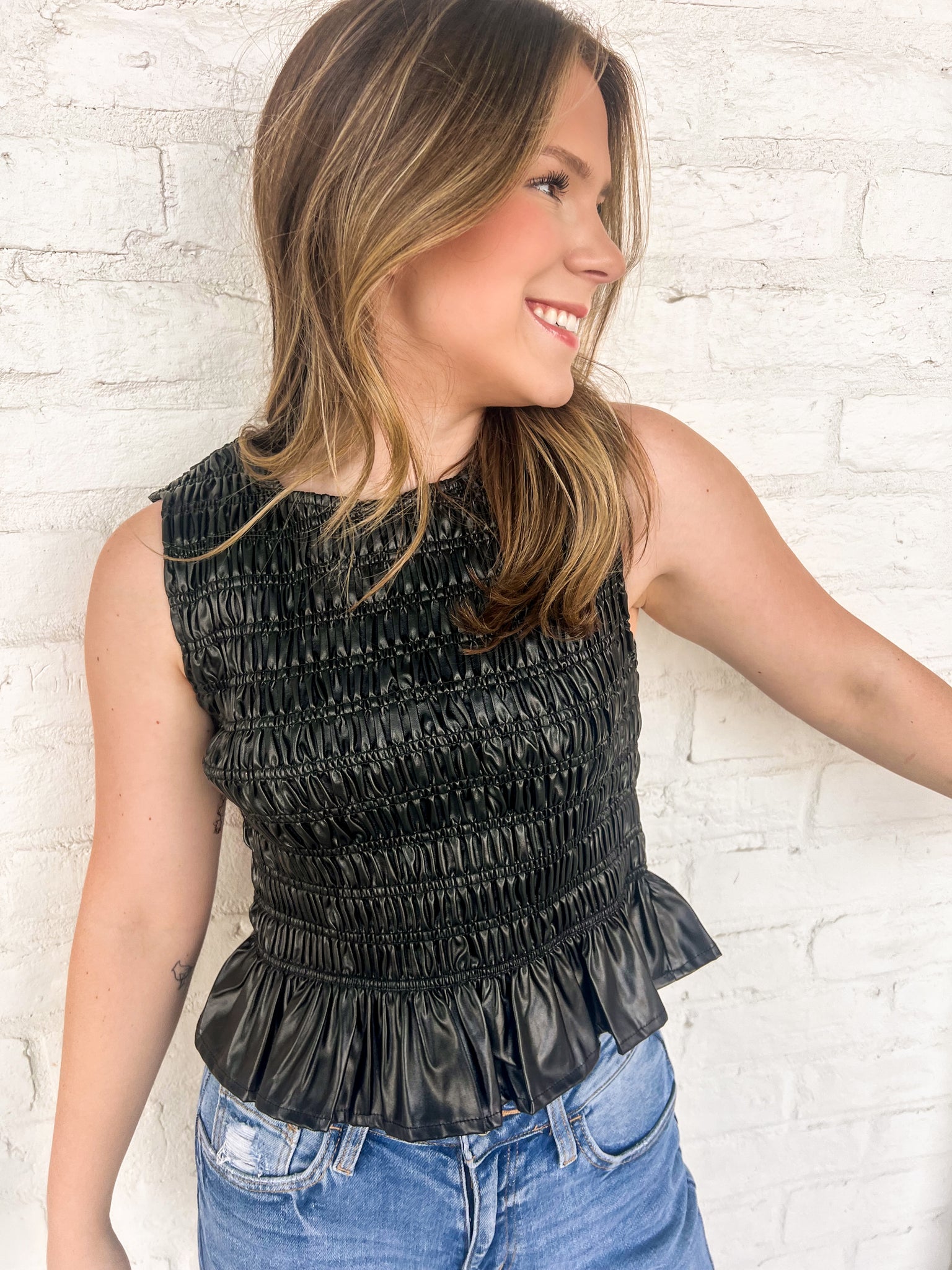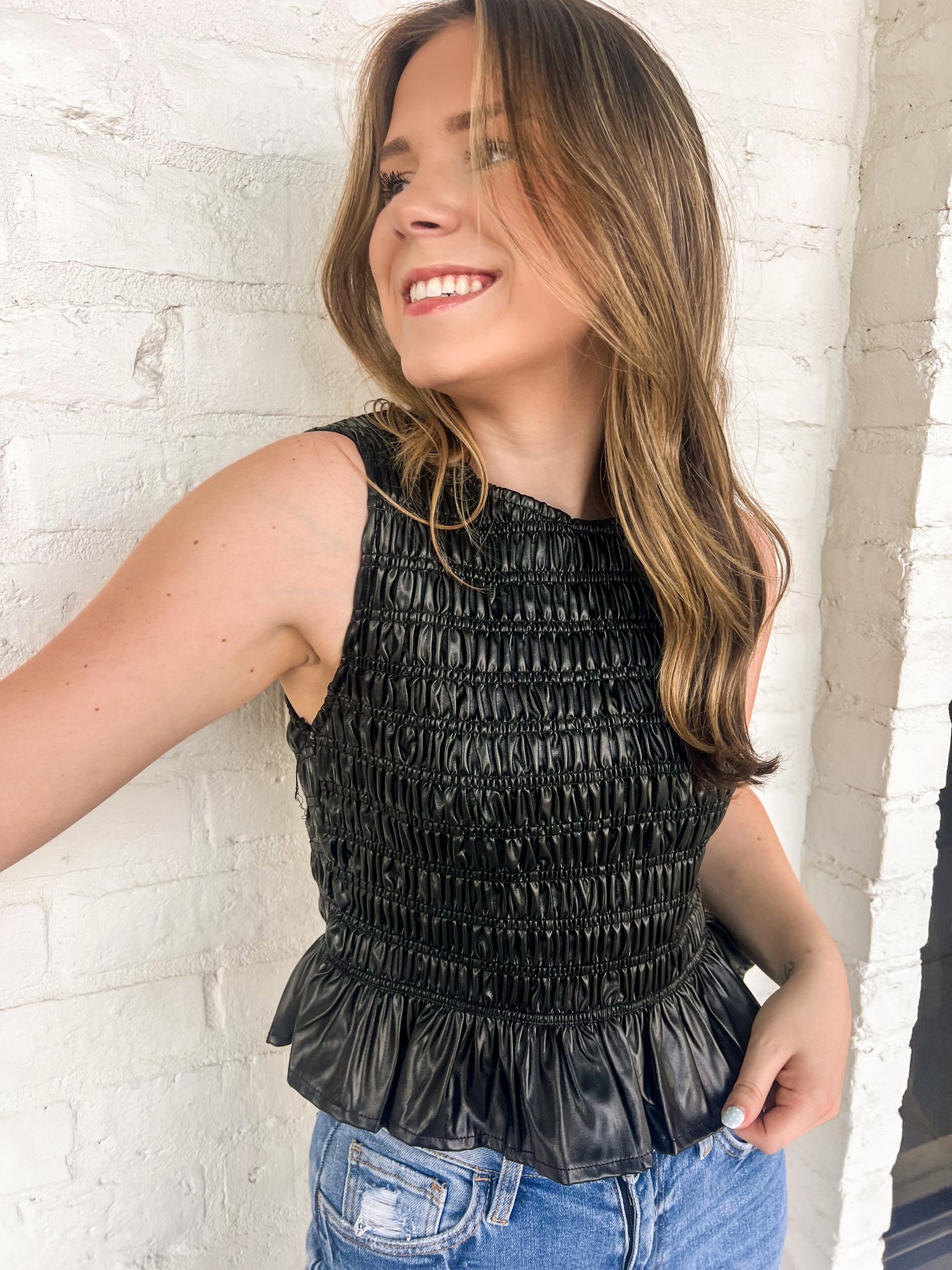 Elevate your style with The Next One Smocked Top! Featuring faux leather and a sleeveless design, this crop top is sure to make a statement. Dress it up or down, this versatile piece is a must-have for any fashion-forward individual. Make a bold and confident statement with The Next One Smocked Top.
