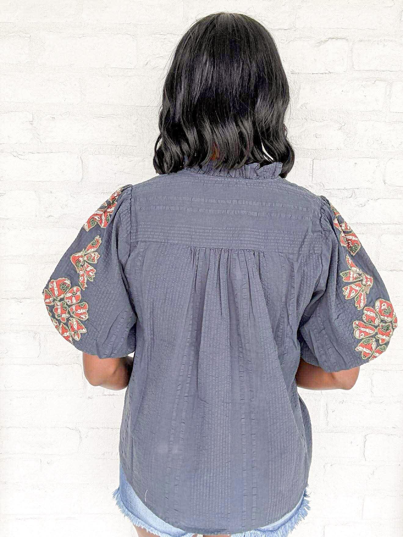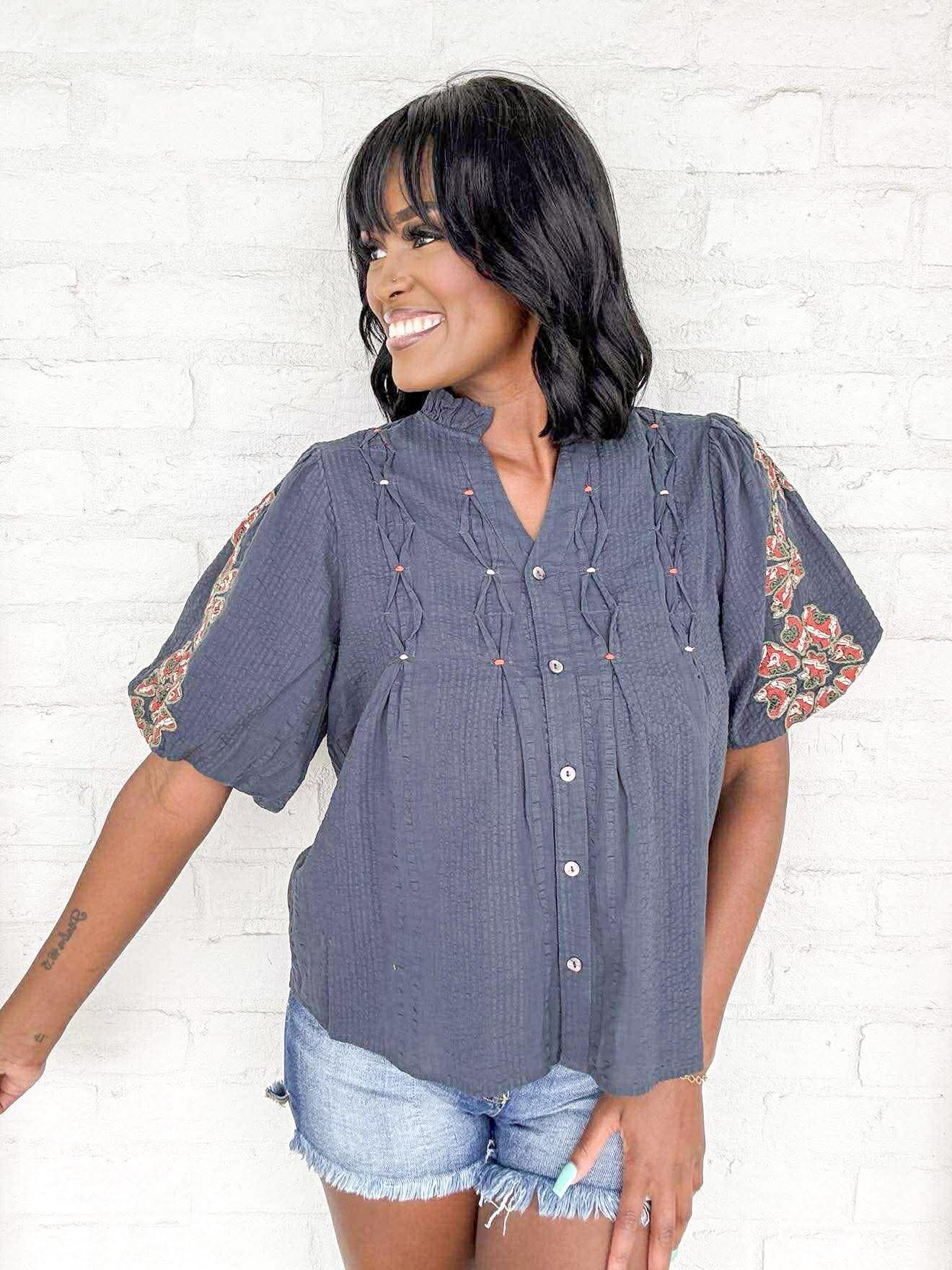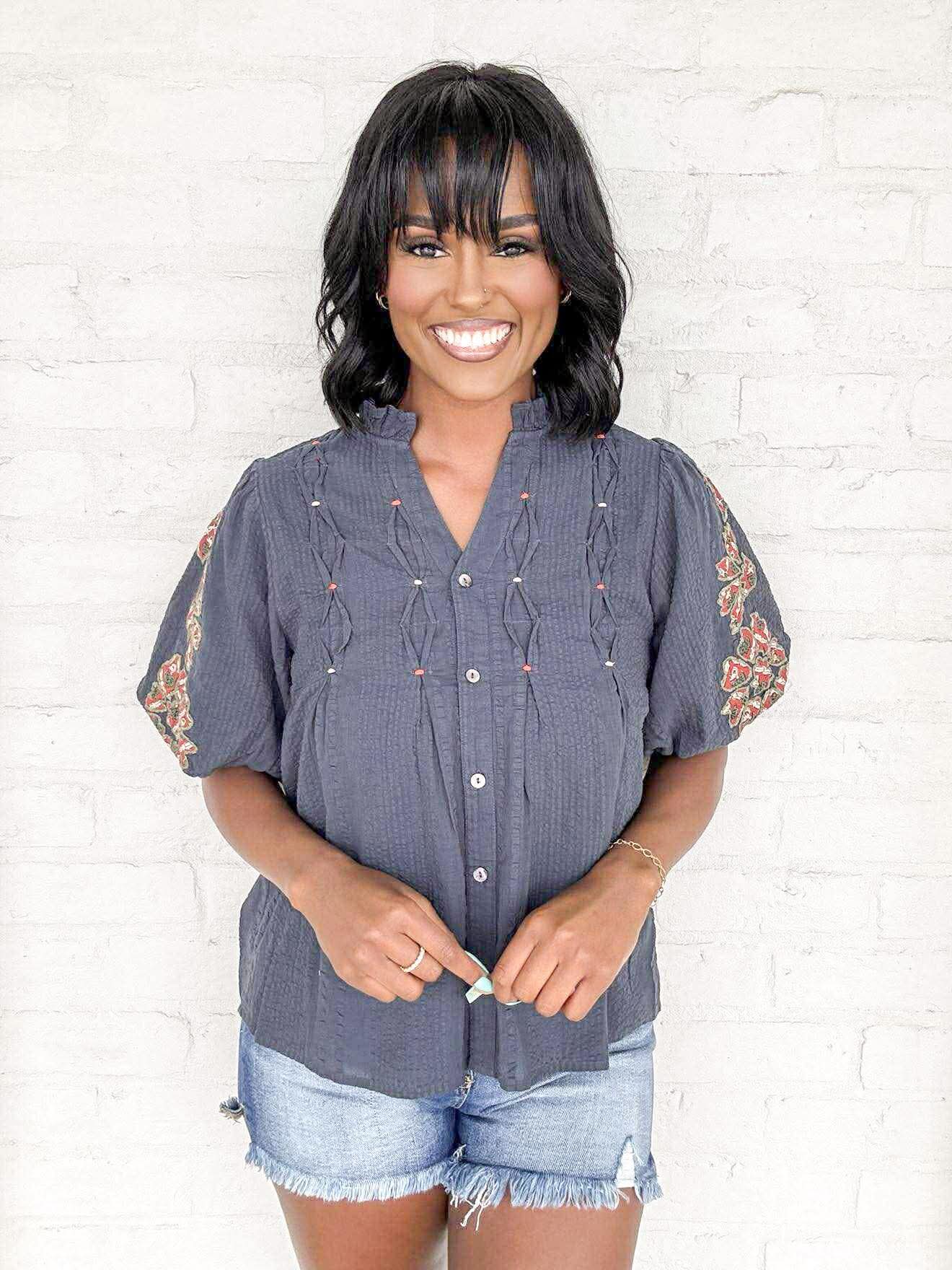 Elevate your everyday look with our THML There For You Navy Top. Crafted from a rich navy fabric, this top adds a touch of sophistication to any outfit. Perfect for both work and play, it's a versatile piece that will be there for you whenever you need it.