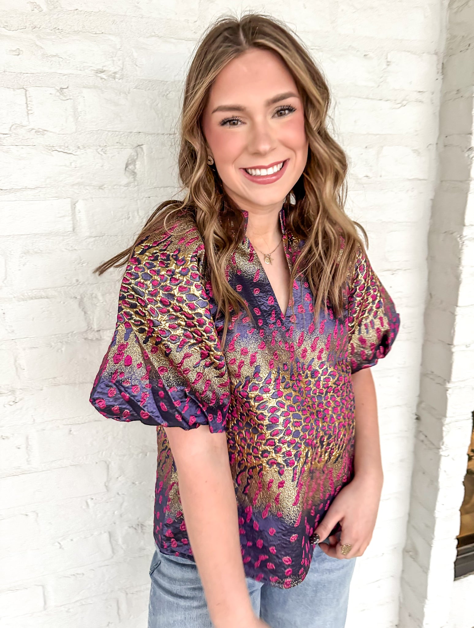 Embrace your inner goddess with our THML For The Journey Metallic Multi Top! This stunning top features a metallic detail that will make you shine in any setting. The bell sleeves add a touch of whimsy and elegance to this must-have piece. Perfect for any journey, big or small!