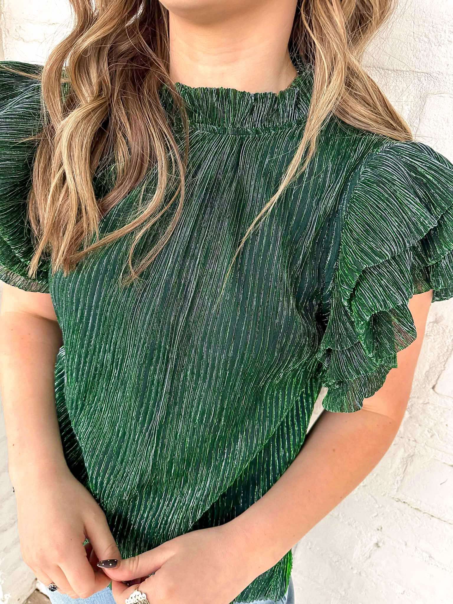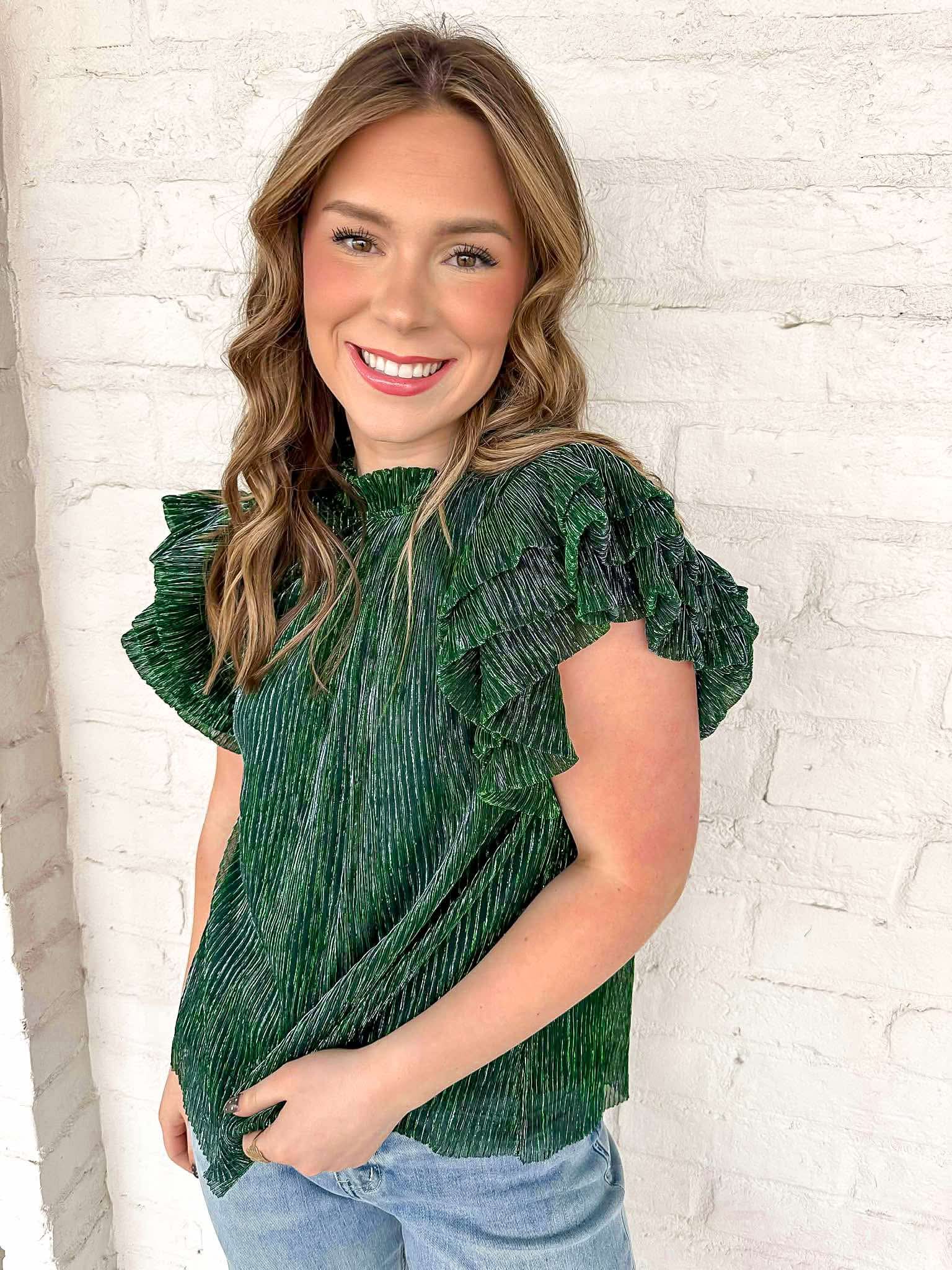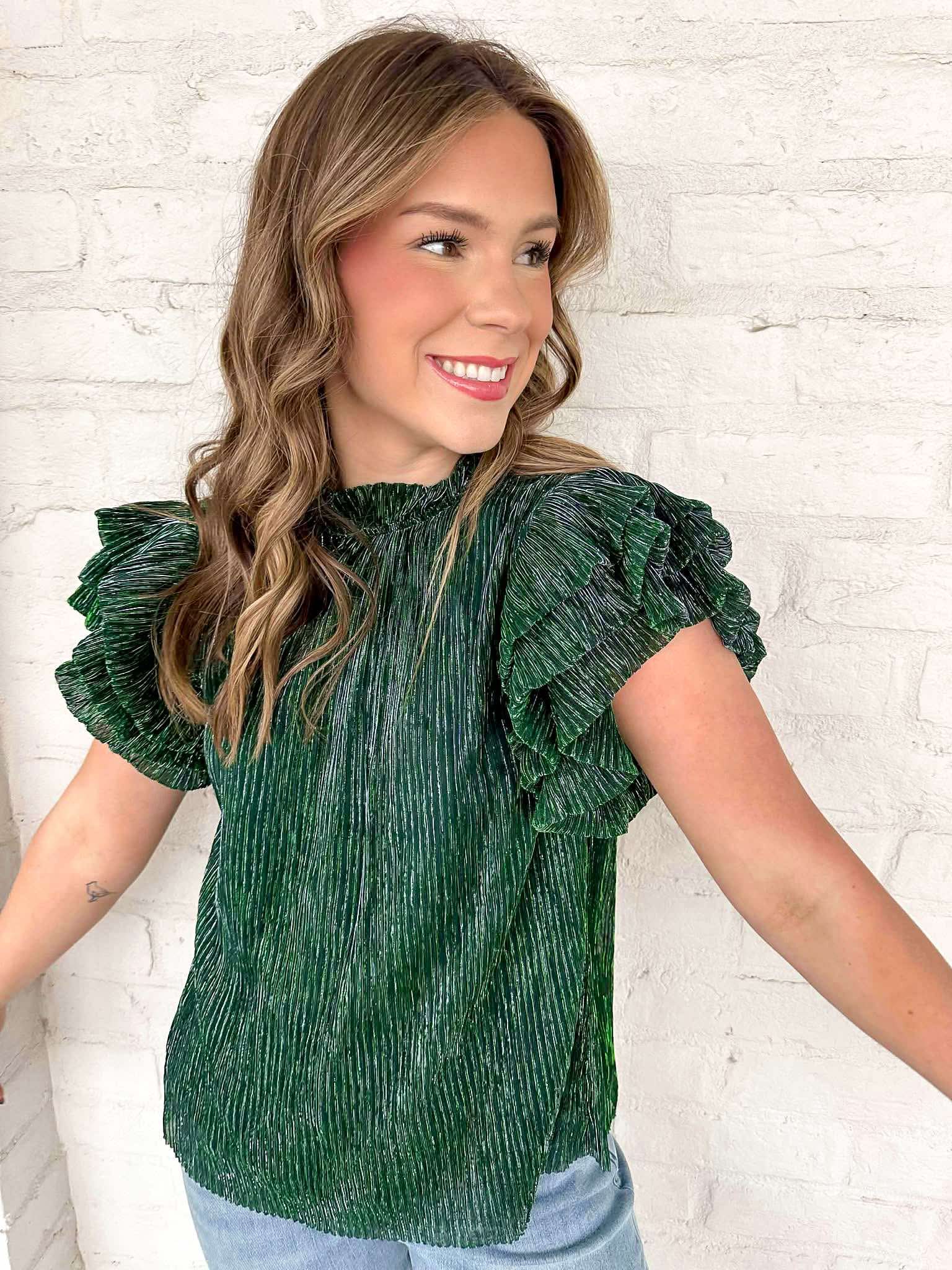 Elevate your holiday wardrobe with the THML Holiday Chaos Green Top! The vibrant green color and flutter sleeves add a touch of festive charm, while the metallic finish adds a touch of glamour. Perfect for any occasion, this top promises to make a statement and turn heads. Don't miss out on this must-have piece!