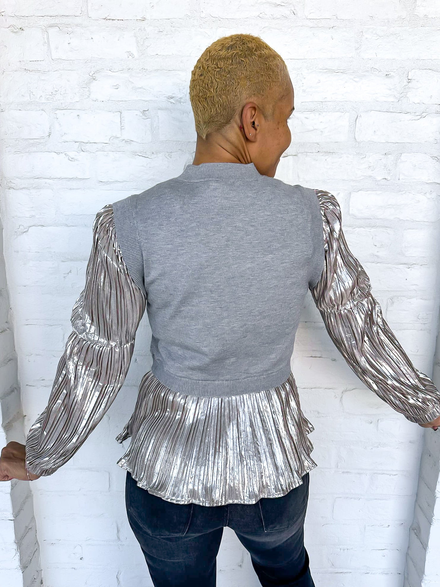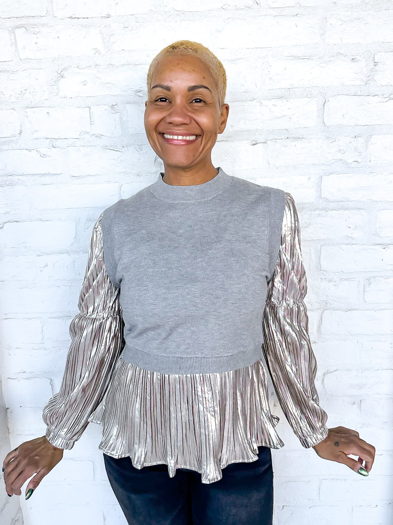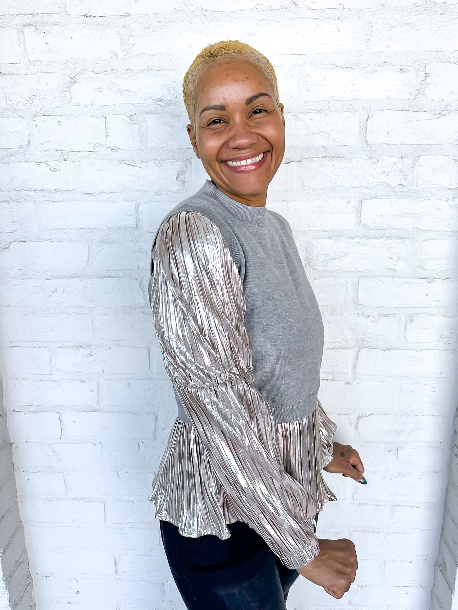 Indulge in the luxurious feel of THML's Metallic Vibes Gray Top. The metallic sleeve knit top not only adds a touch of glam to any outfit, but also provides comfort and style. Elevate your wardrobe with this must-have piece and make a statement wherever you go.