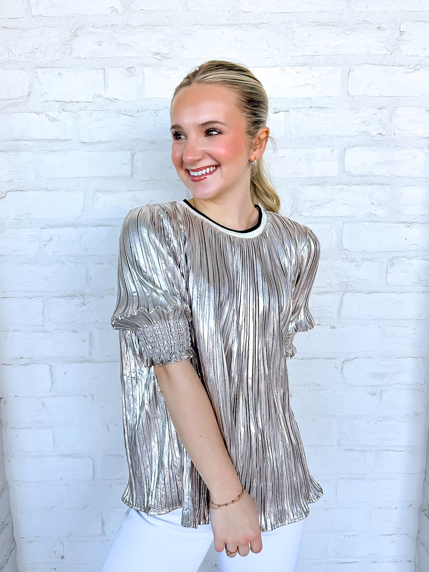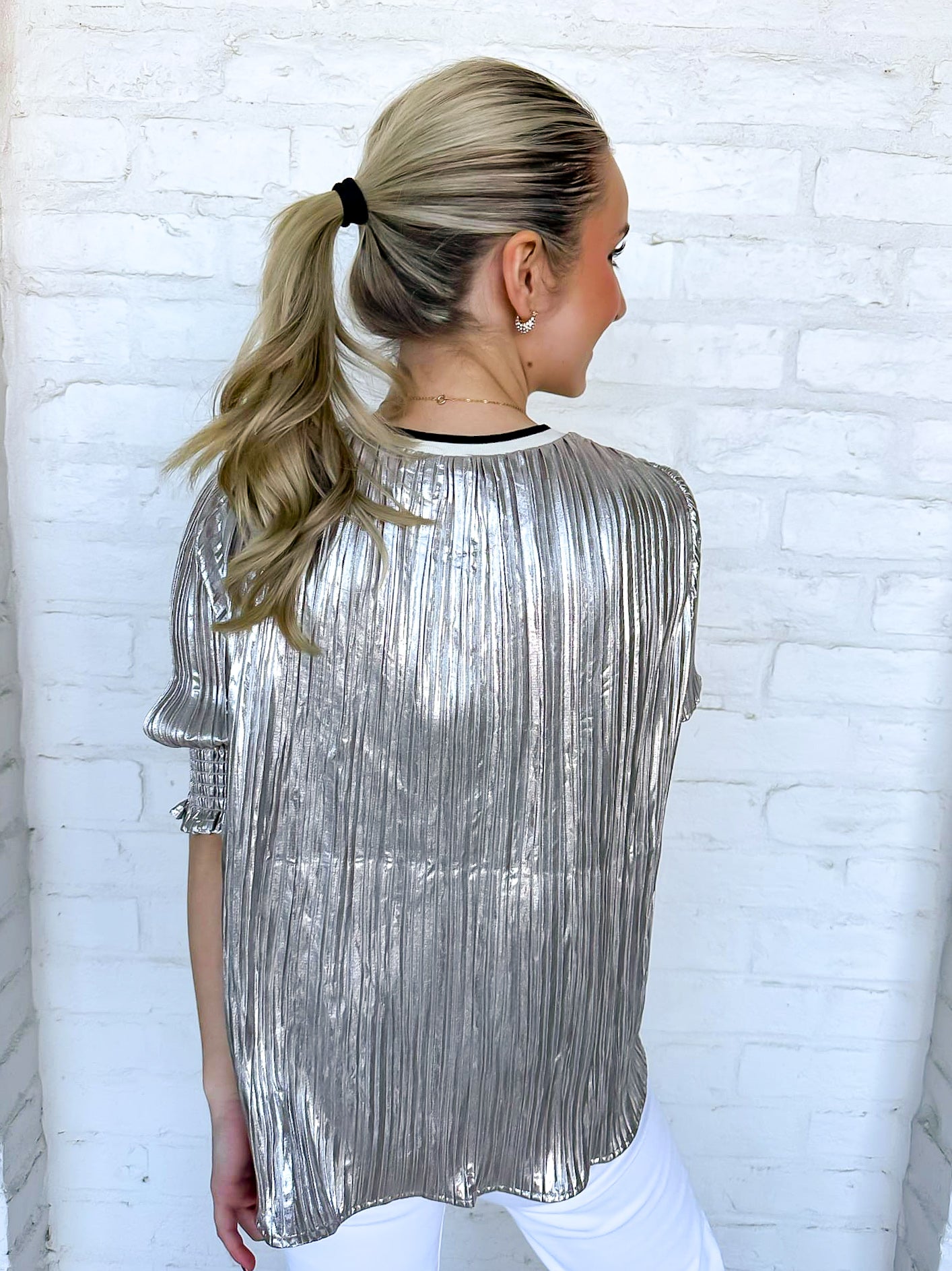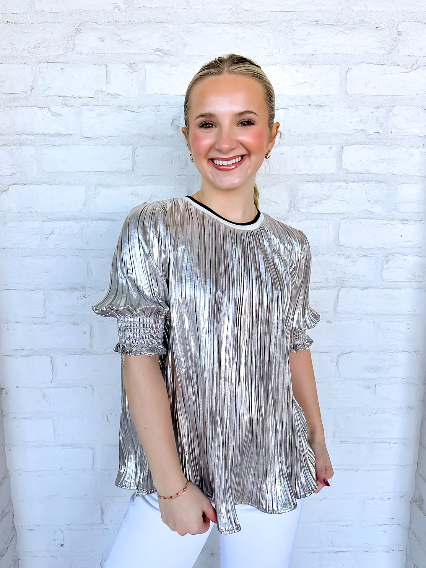 Indulge in a touch of elegance with our THML Pleated Goodness top. The short sleeves and pleated design offer a flattering fit, while the metallic detailing adds a subtle touch of glamour. Perfect for adding a touch of sophistication to your wardrobe.
