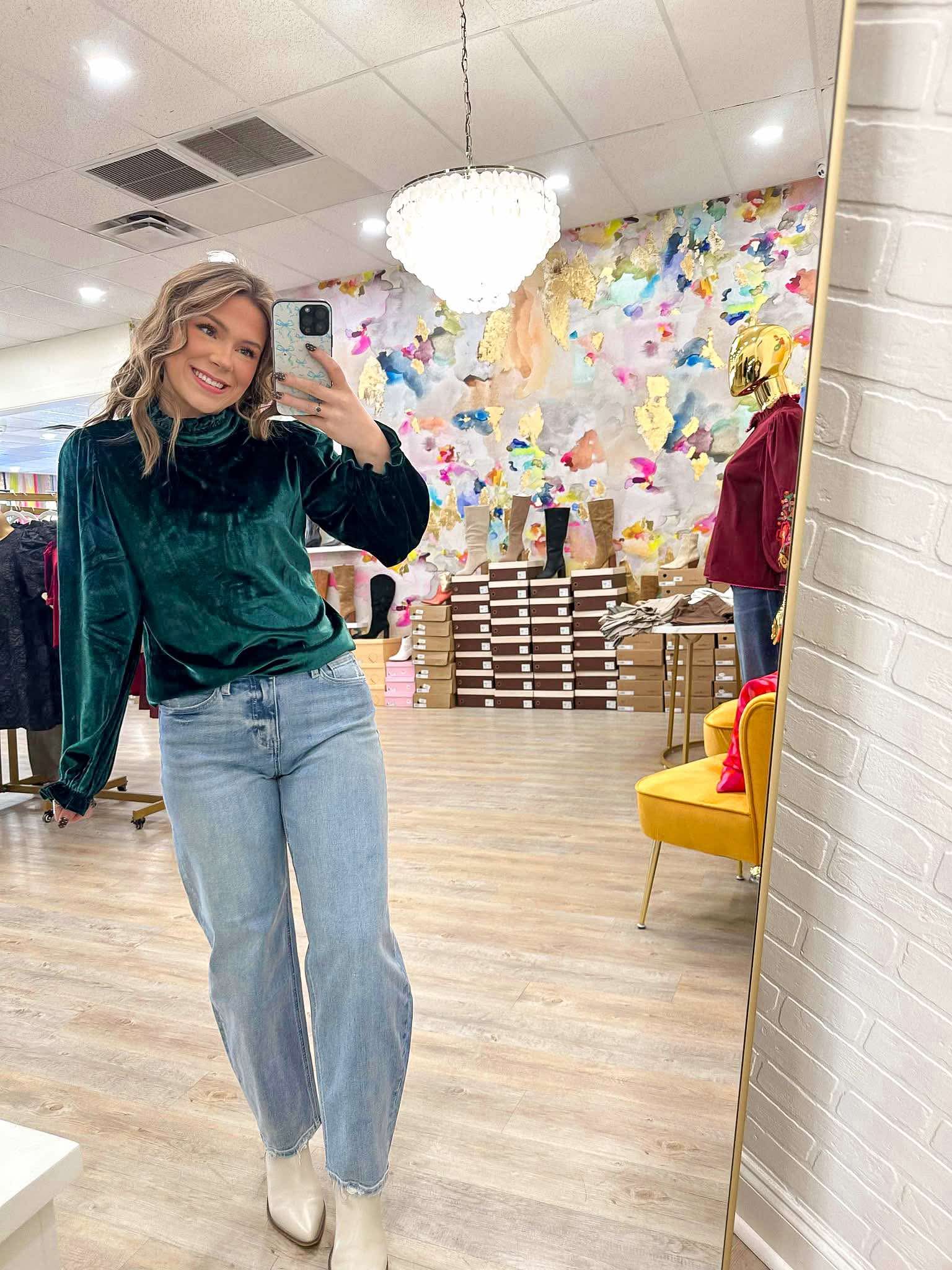 Indulge in the luxurious feel of our Velveteen Lux Emerald Top. With its soft velvet fabric, you'll feel like royalty while making a statement. Perfect for any occasion, this top will add a touch of sophistication and elegance to your wardrobe. Elevate your style with our exquisite velvet tops.