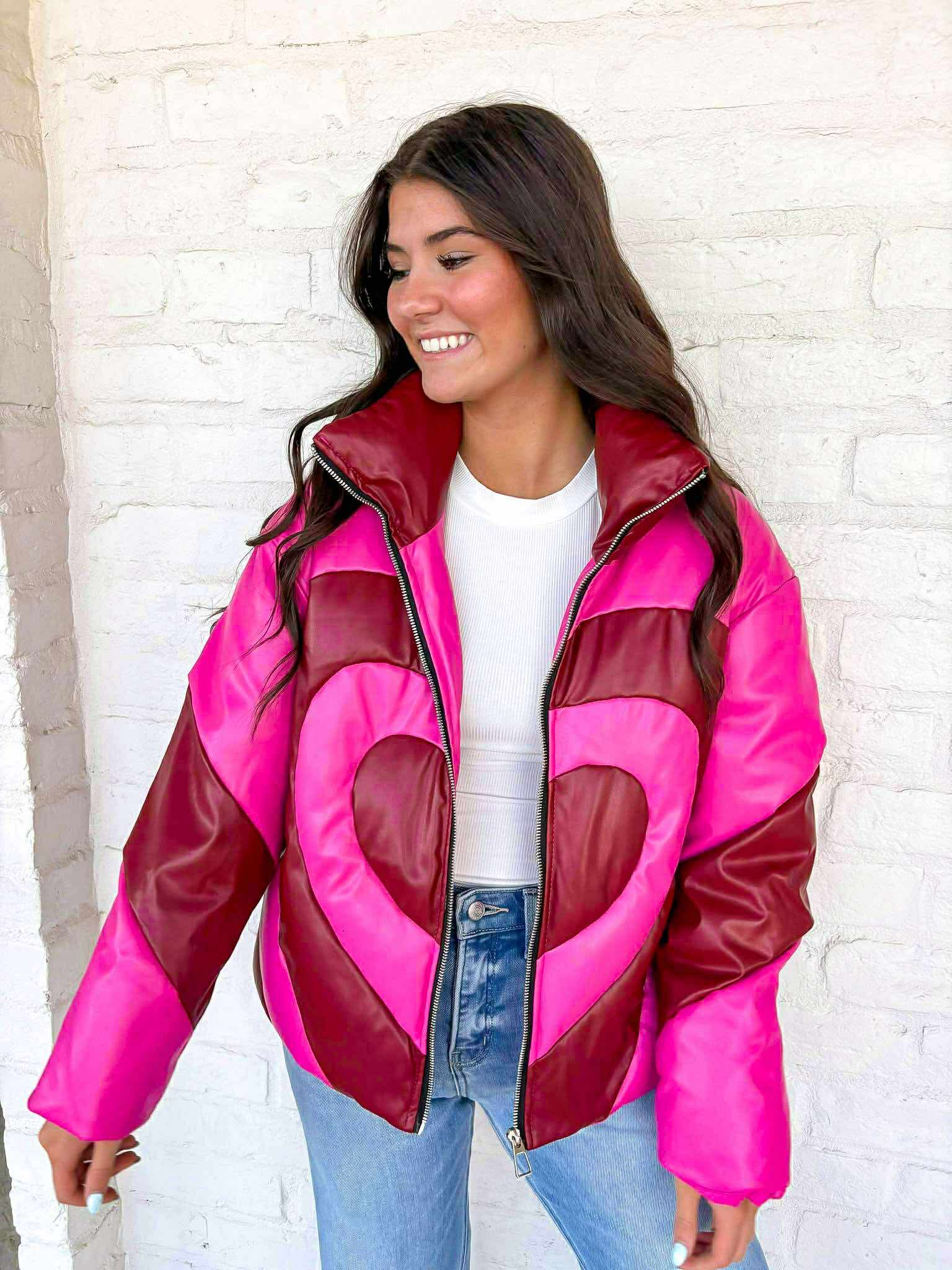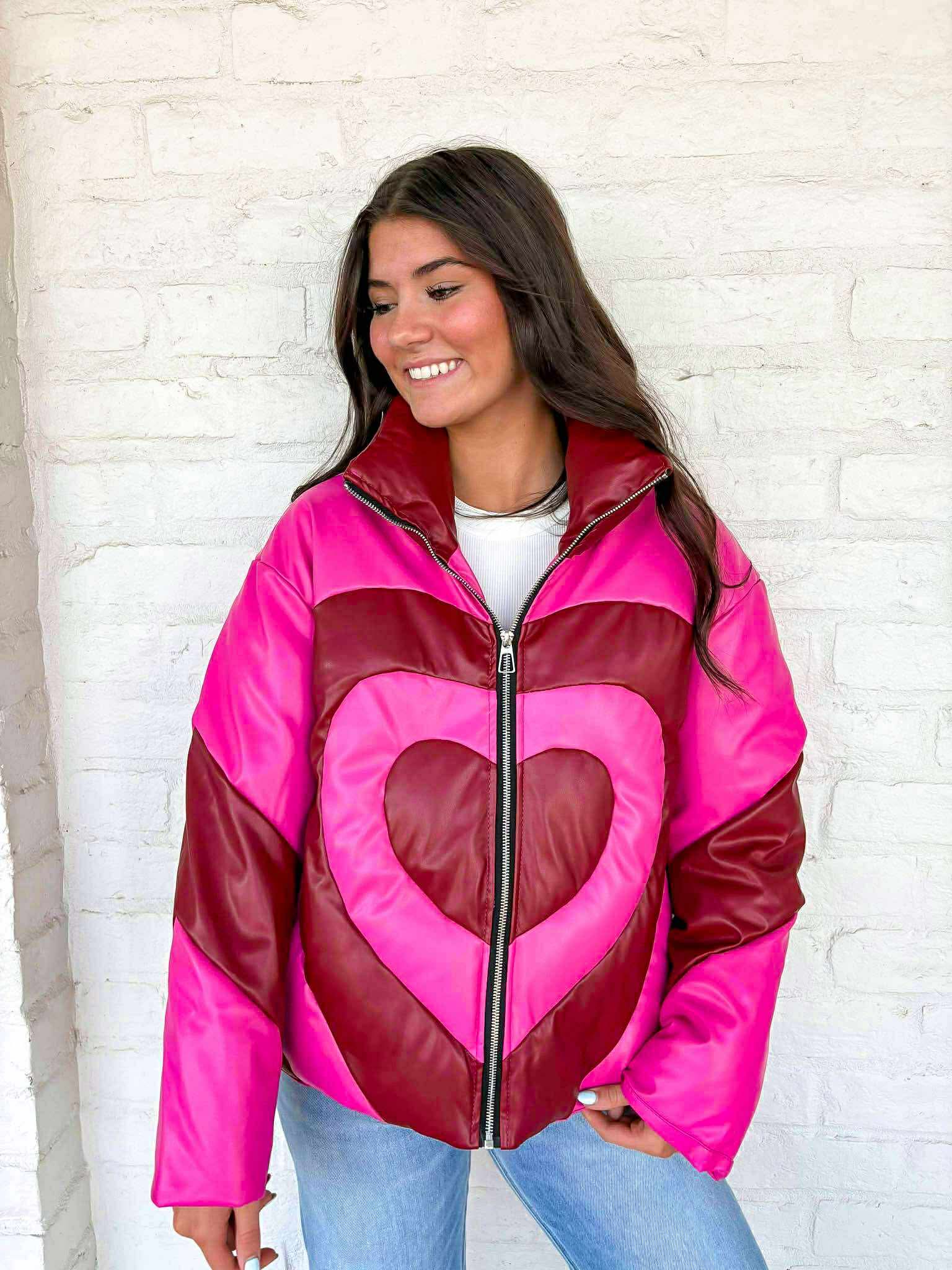 Stay cozy and stylish with our Hearts Eyes Hot Pink Jacket! This heart puffer jacket is sure to turn heads while keeping you warm. Perfect for adding a pop of color to any outfit and spreading love. Don't miss out on this must-have piece!