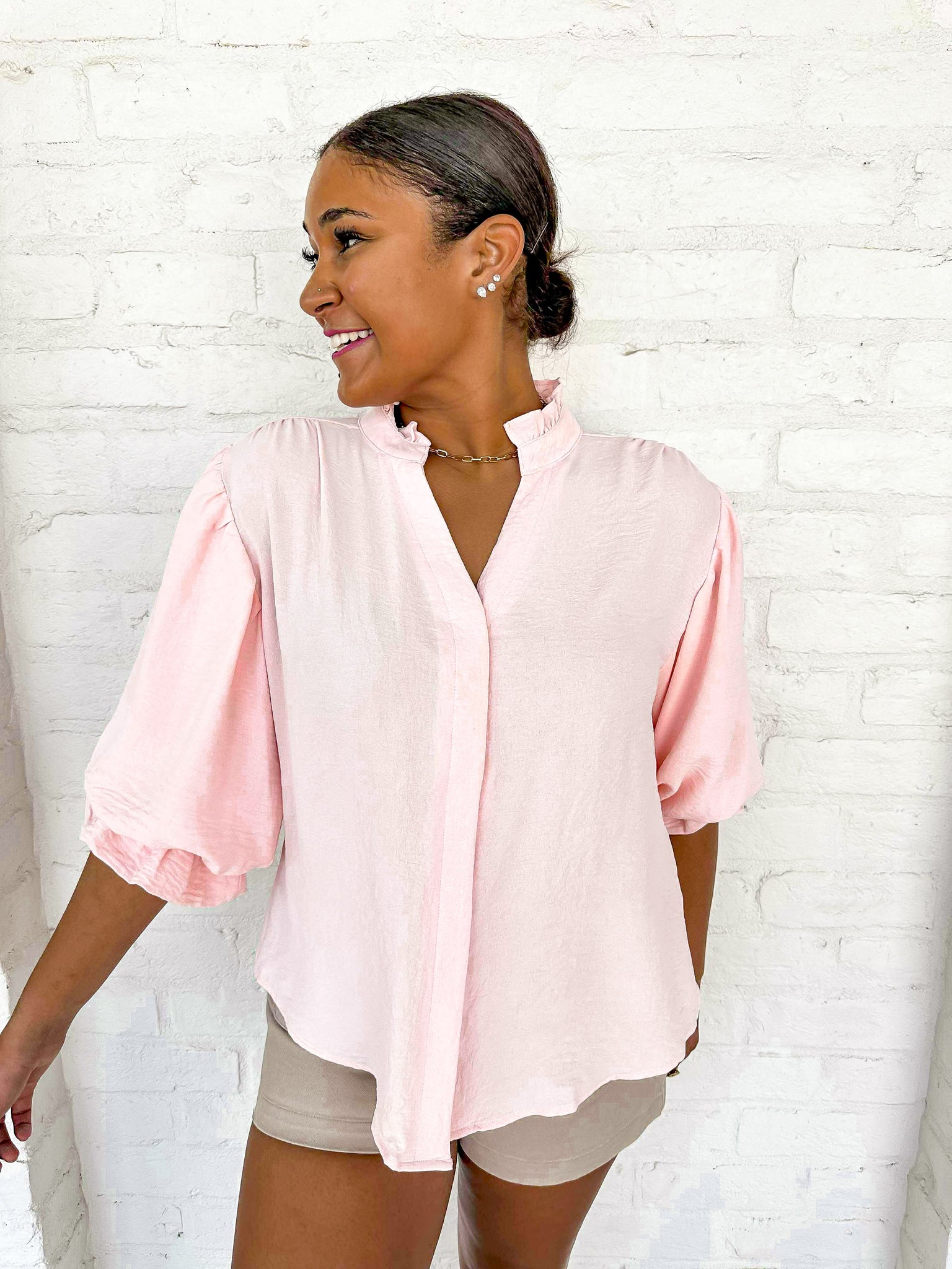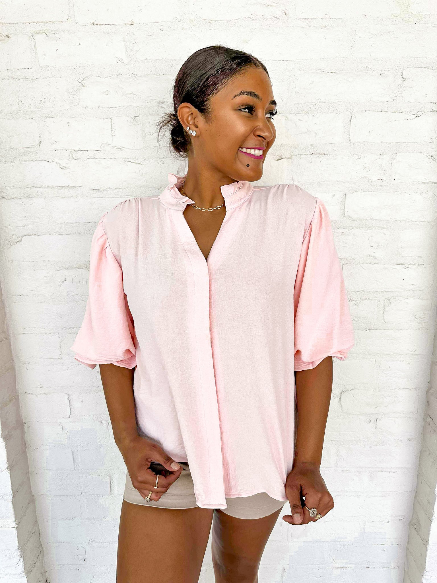 Transform your wardrobe with our Anything And Everything Blush Top! This simple blouse will elevate any outfit with its timeless and versatile style. Effortlessly pair it with jeans or a skirt for a chic and polished look. Upgrade your wardrobe today!