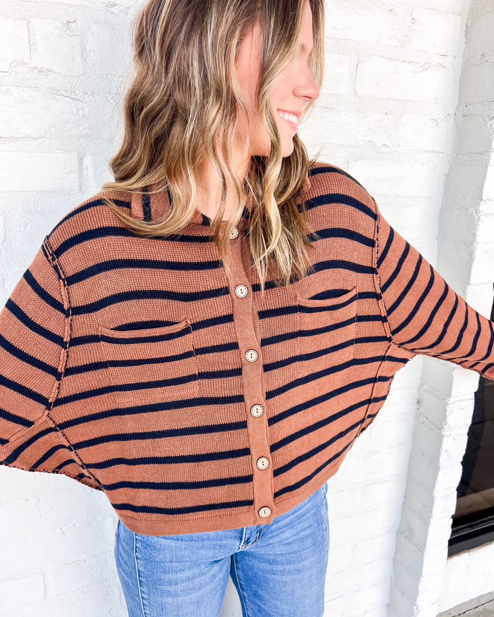 Unleash your inner fashionista with our Believe Your Heart Long-sleeve Cardigan! This eye-catching piece features a stylish stripe collared design and exposed seams for added flair. Stay cozy and chic all day long with this must-have addition to your wardrobe.