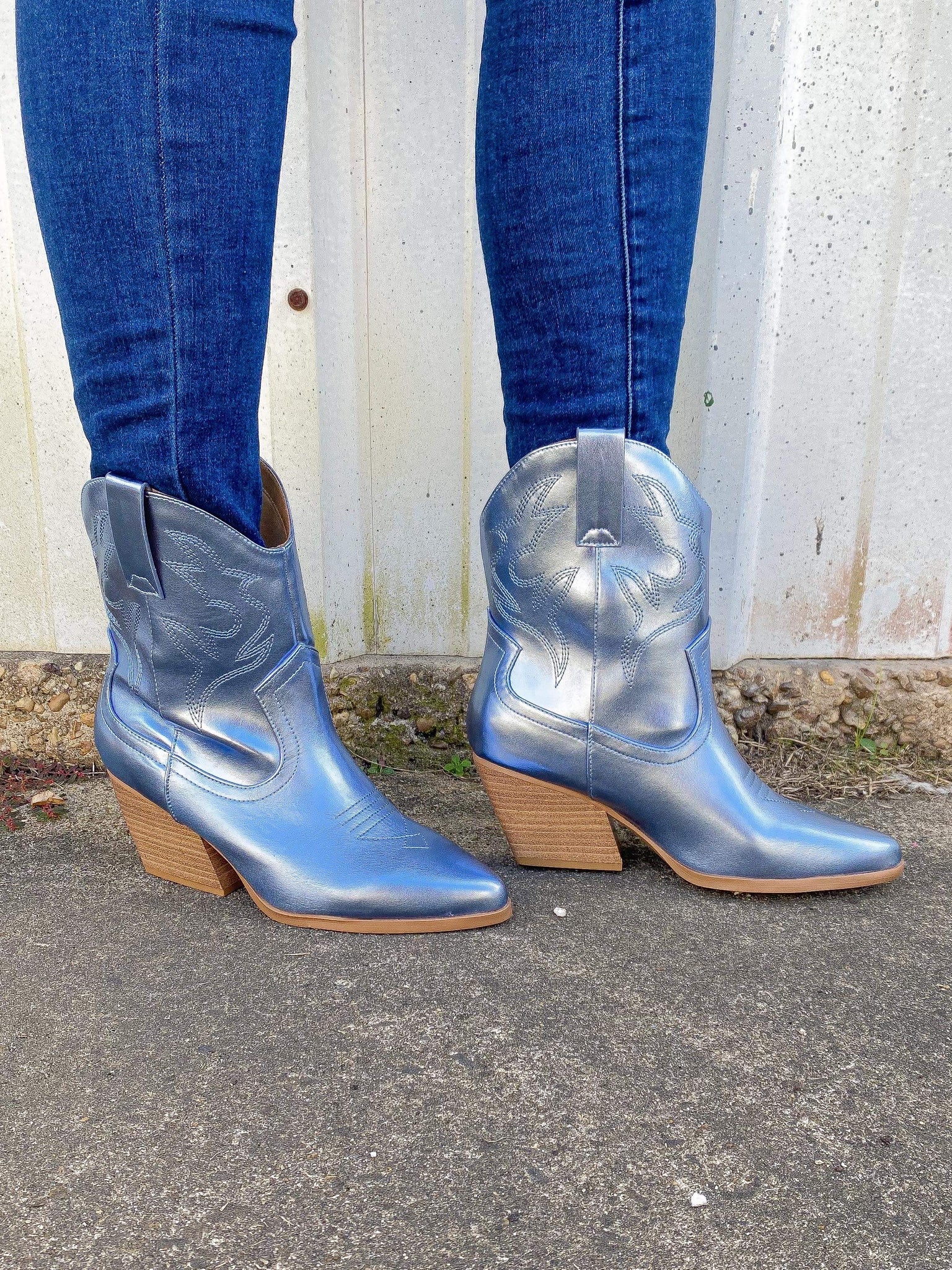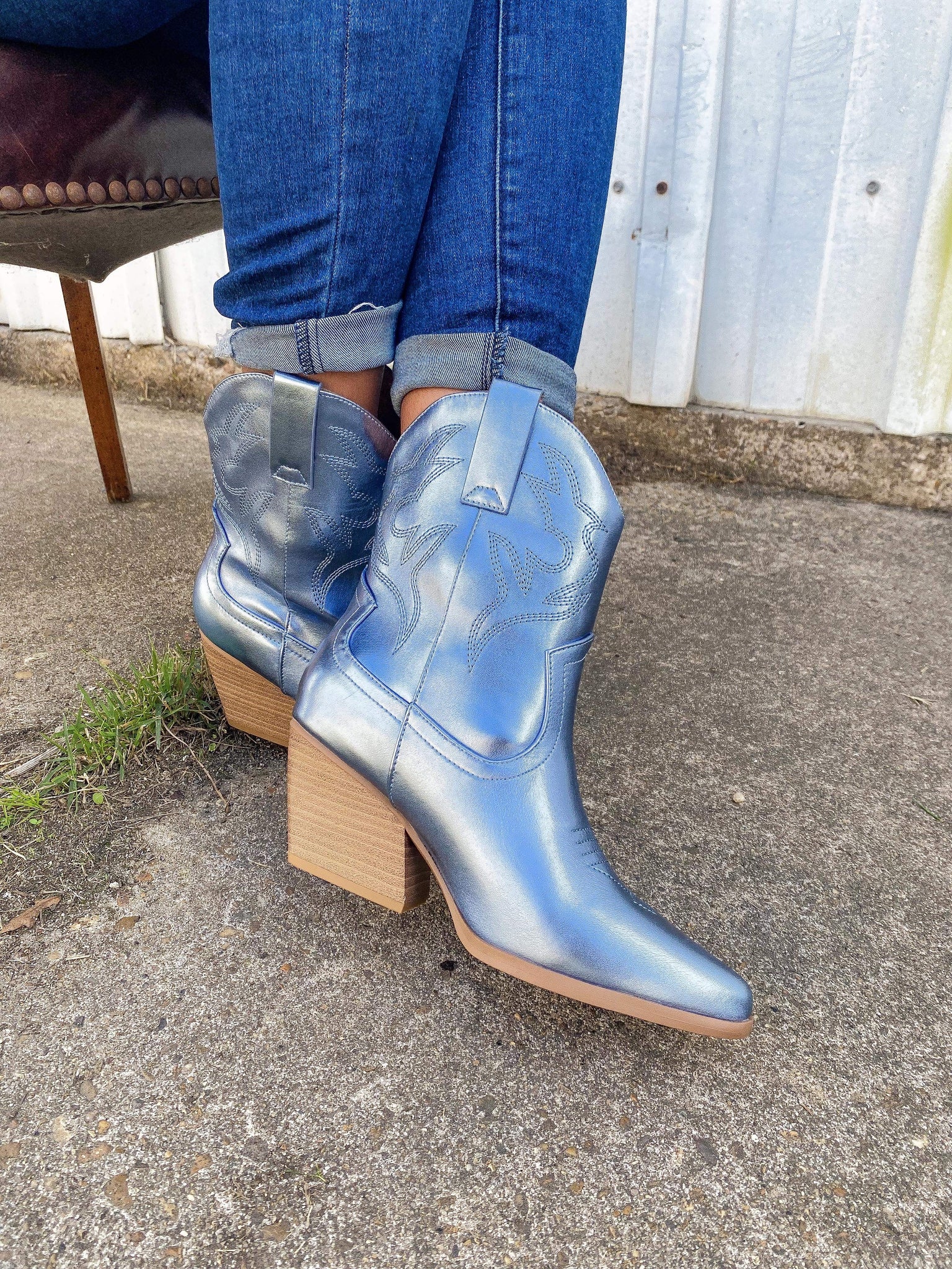 Blue ankle bootie with blue stitching! These are a western style! You can stay true to size in these!