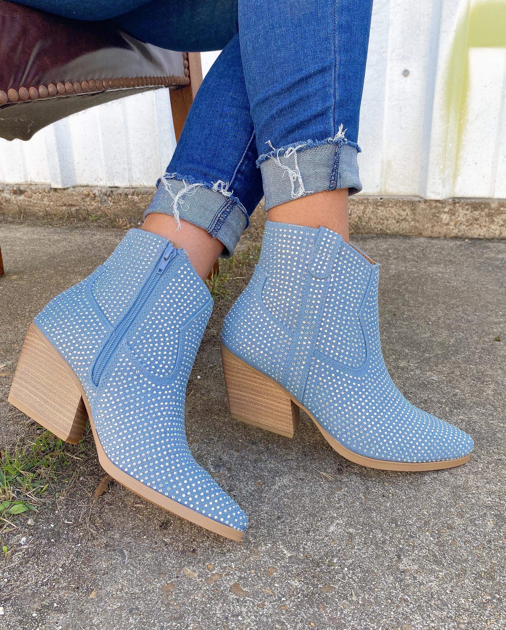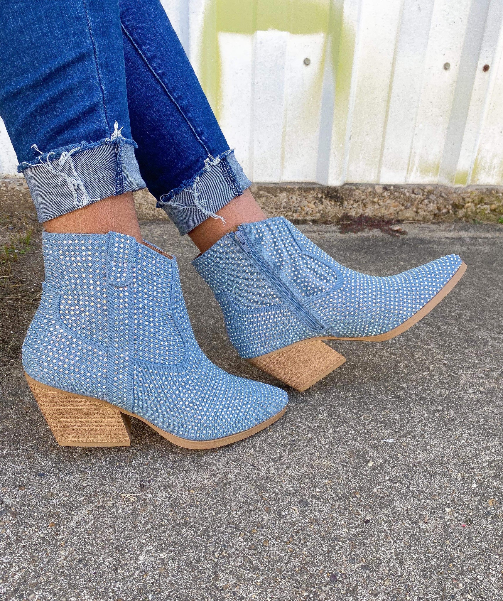 Light blue ankle bootie with rhinestones! These are a western style! You can stay true to size in these!