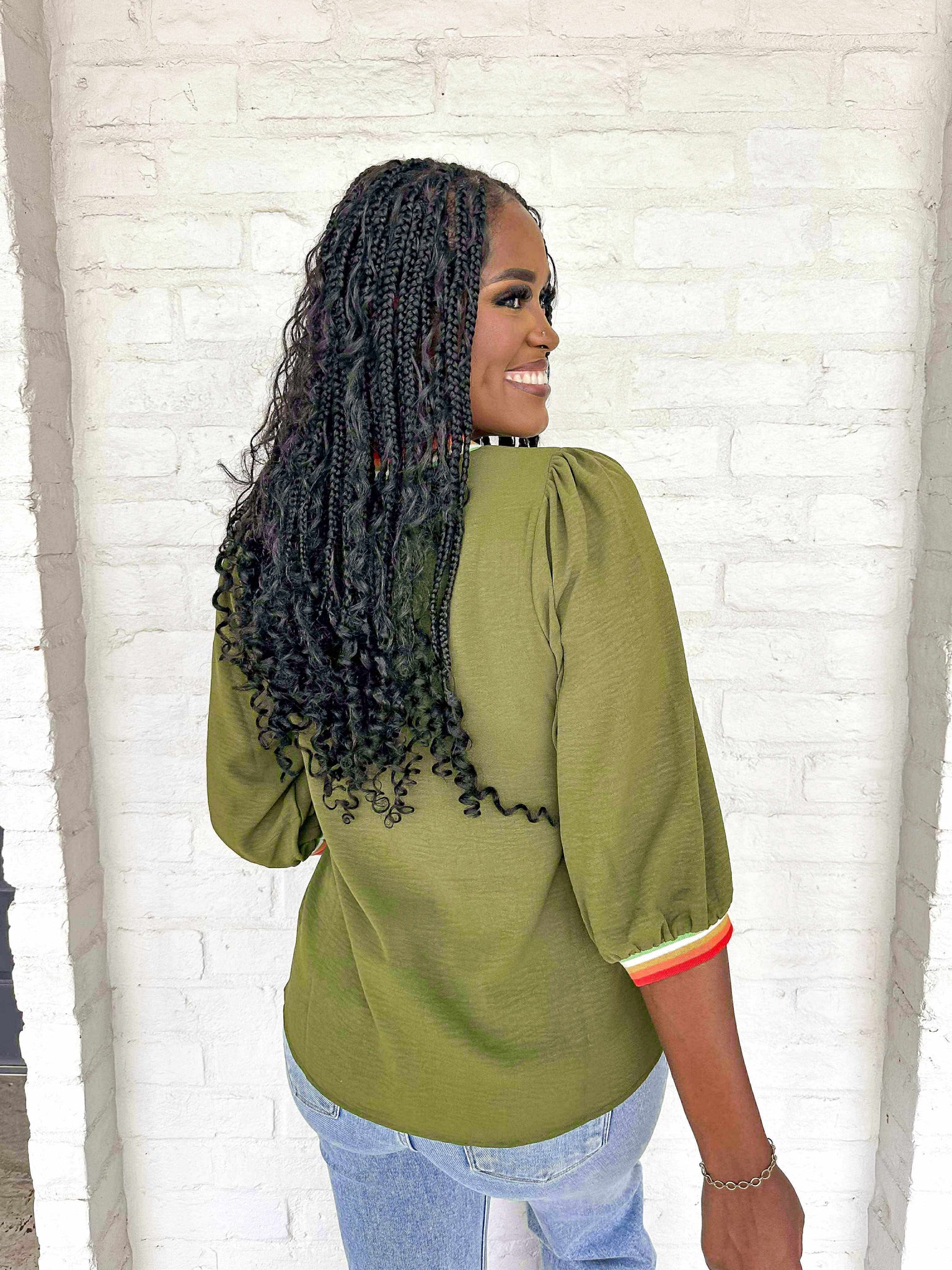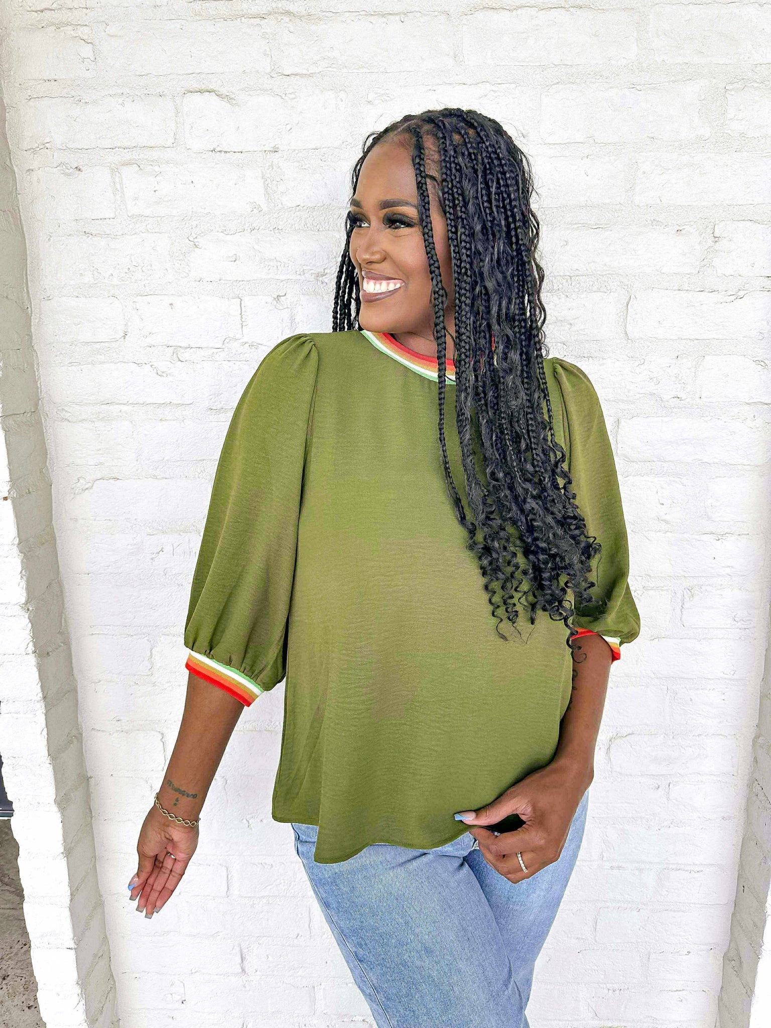 This elegant Carry On Olive Top is perfect for the office! With its sleek and professional design, this top will help you make a stylish statement while staying comfortable throughout the day. Dress it up with a statement necklace or keep it simple and chic. Make a lasting impression with this versatile office top!