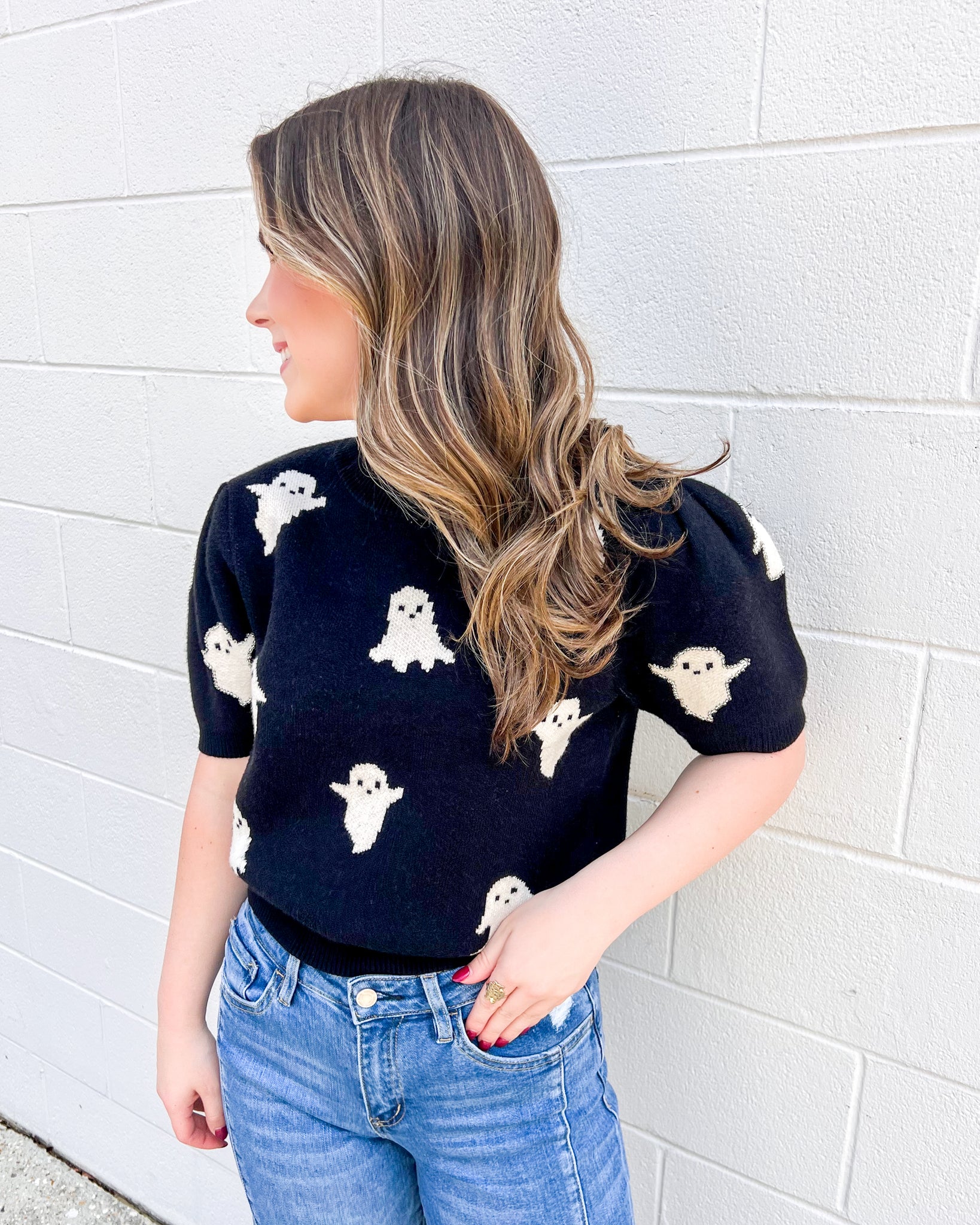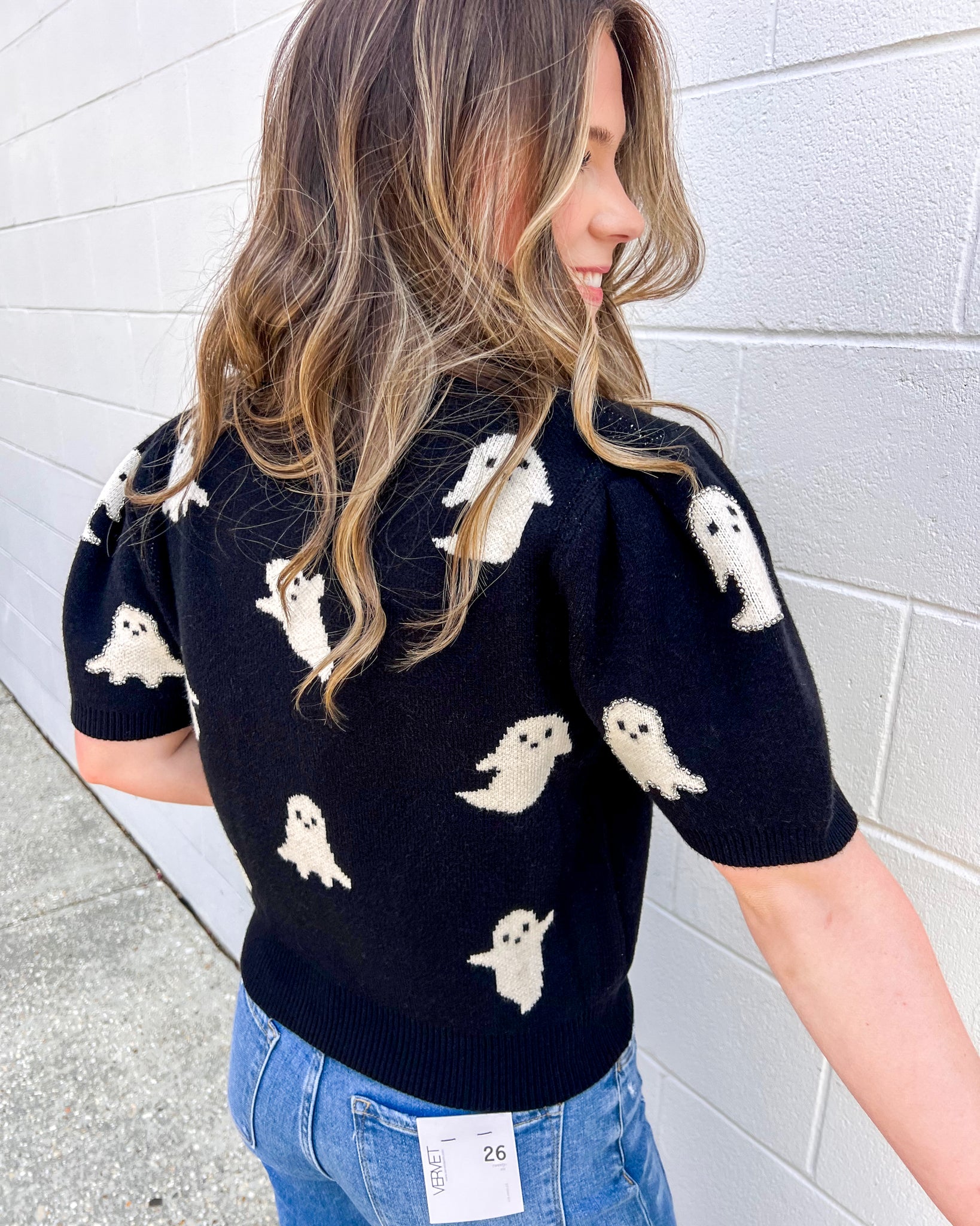 The Little Boo Thing Ghost Top, perfect for Halloween, features puff short sleeves and a fun ghost pattern. This playful sweater top will keep your little one cozy and stylish during the spooky season. Get ready for some ghostly fun with this must-have for any Halloween wardrobe!