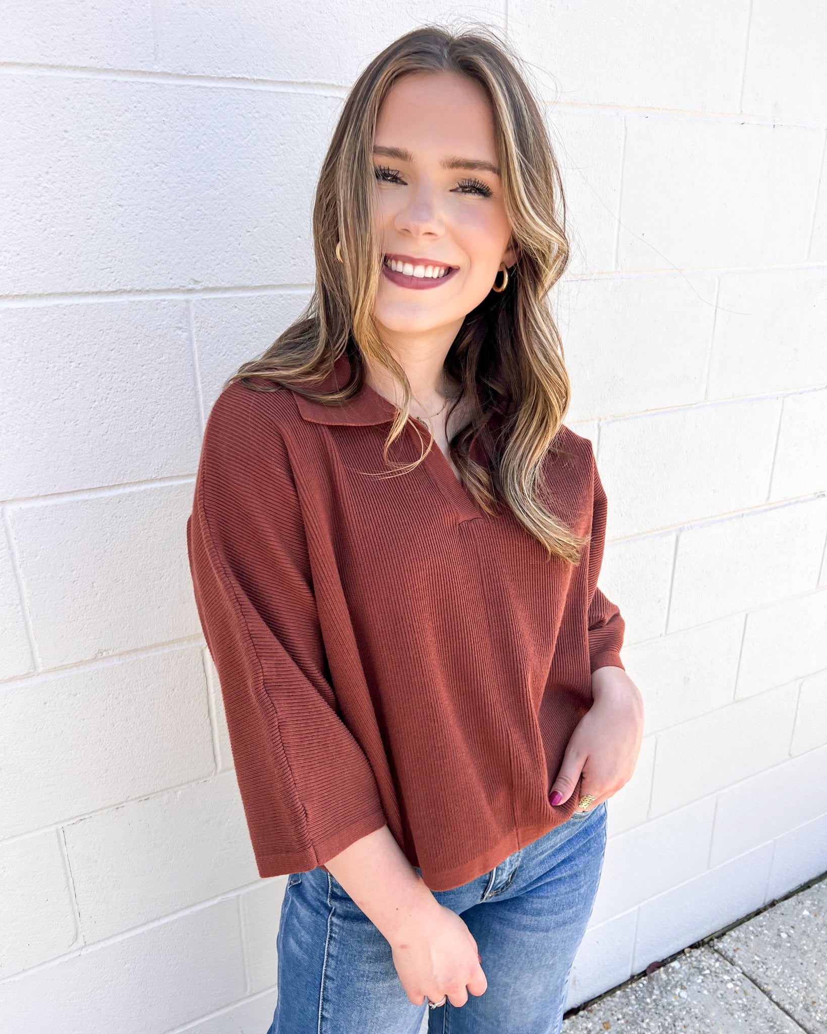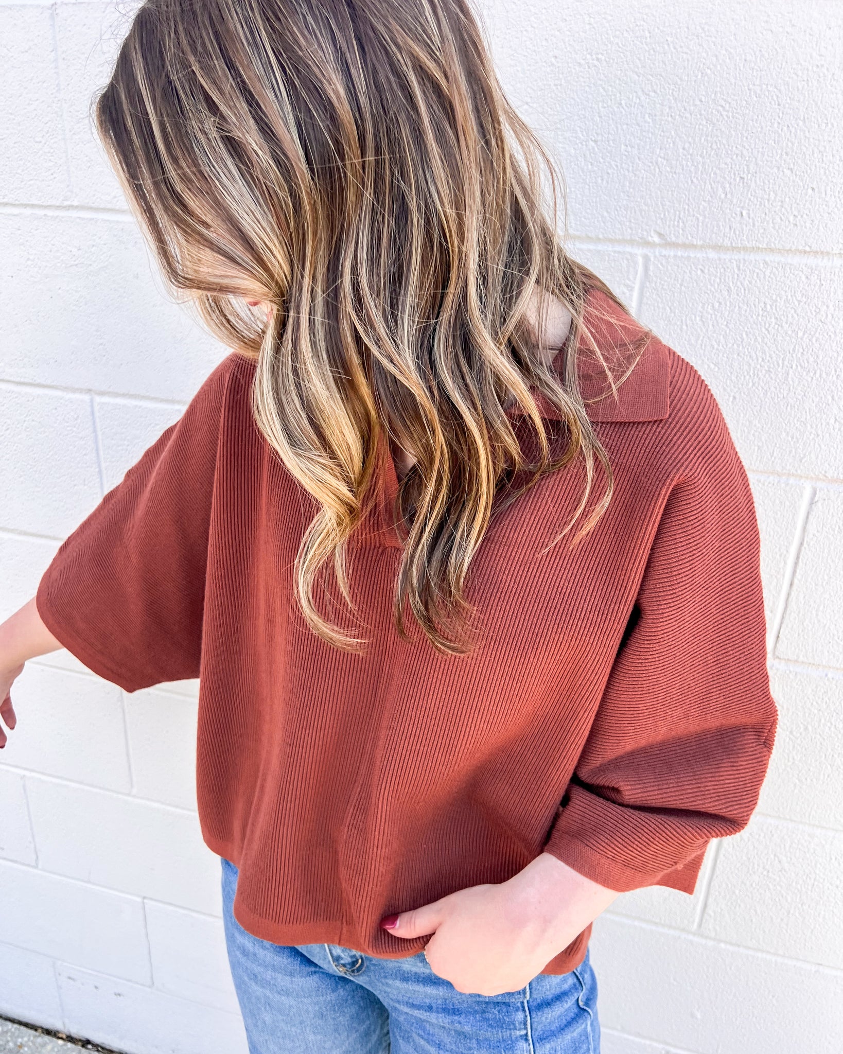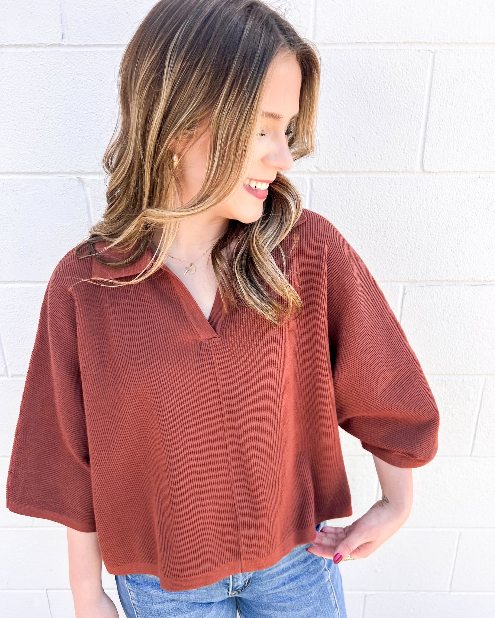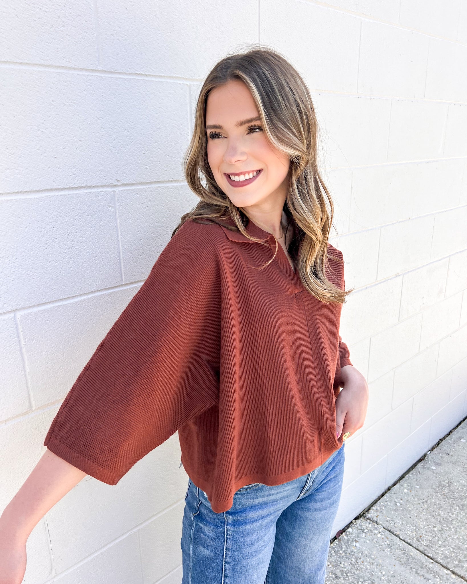 Effortless style meets everyday comfort in this Rust Textured Knit Split Neck Top. Designed with a relaxed silhouette, this versatile piece features a soft ribbed knit, drop shoulders, and a flattering split neckline that elevates a casual staple. The warm rust shade makes it perfect for fall layering and pairs seamlessly with denim, skirts, or trousers for an easy, put-together look.