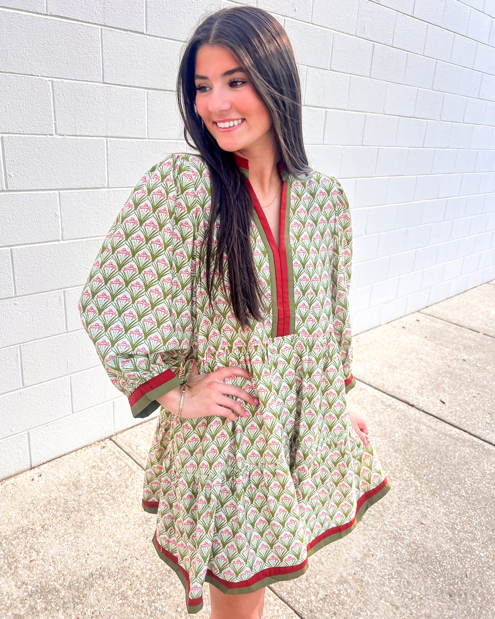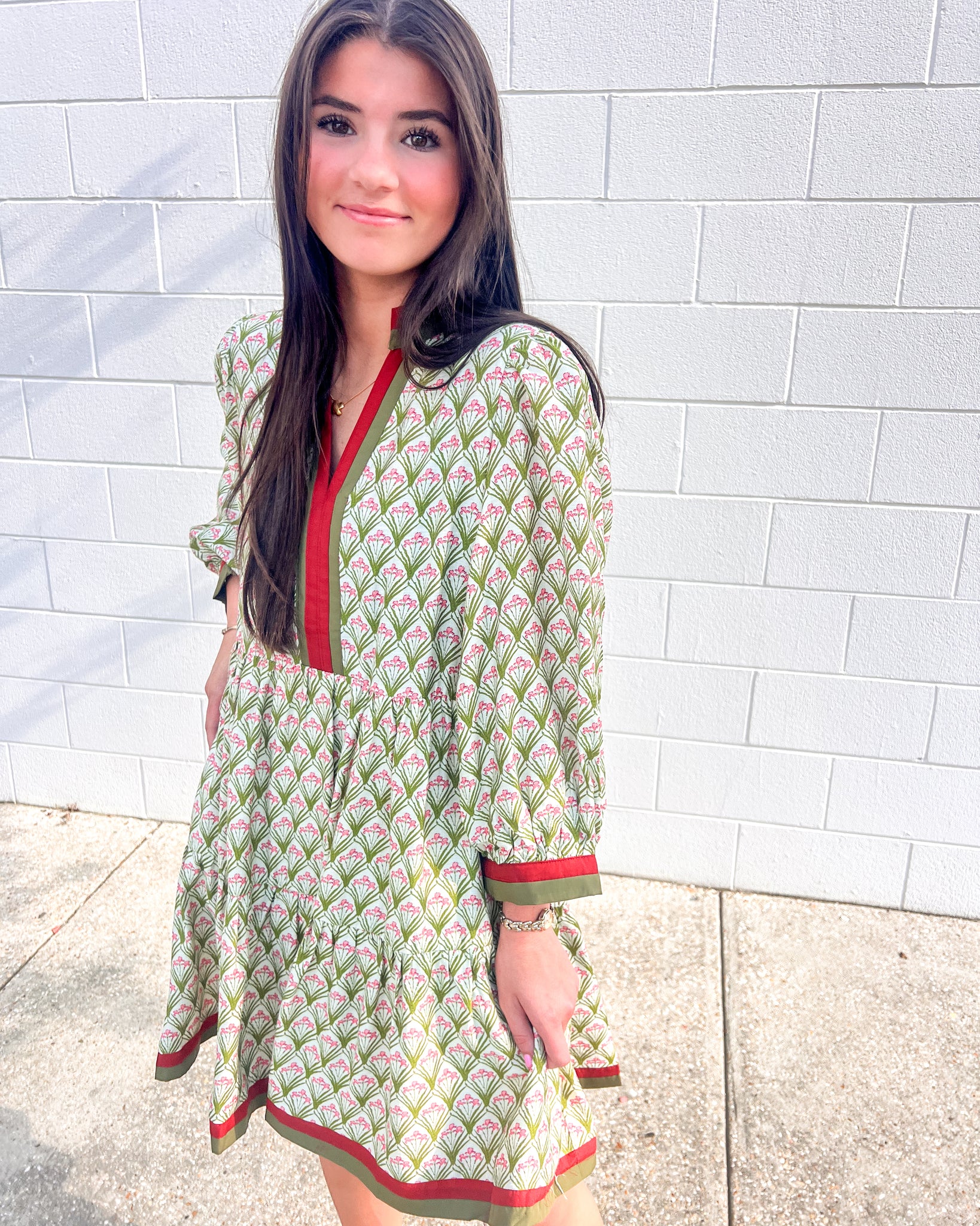 Playful yet polished, the Green & Red Print Long Sleeve Mini Dress is a chic statement piece for your wardrobe. Designed with a bold geometric-inspired print, this dress features contrast trim along the neckline, cuffs, and hem for a striking finish. The relaxed fit, tiered skirt, and side pockets make it as comfortable as it is stylish—perfect for all-day wear.