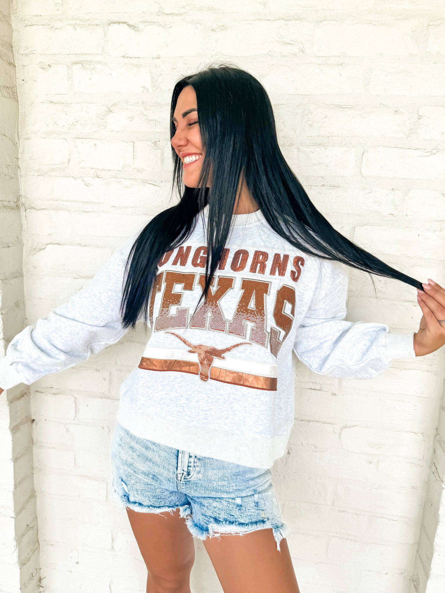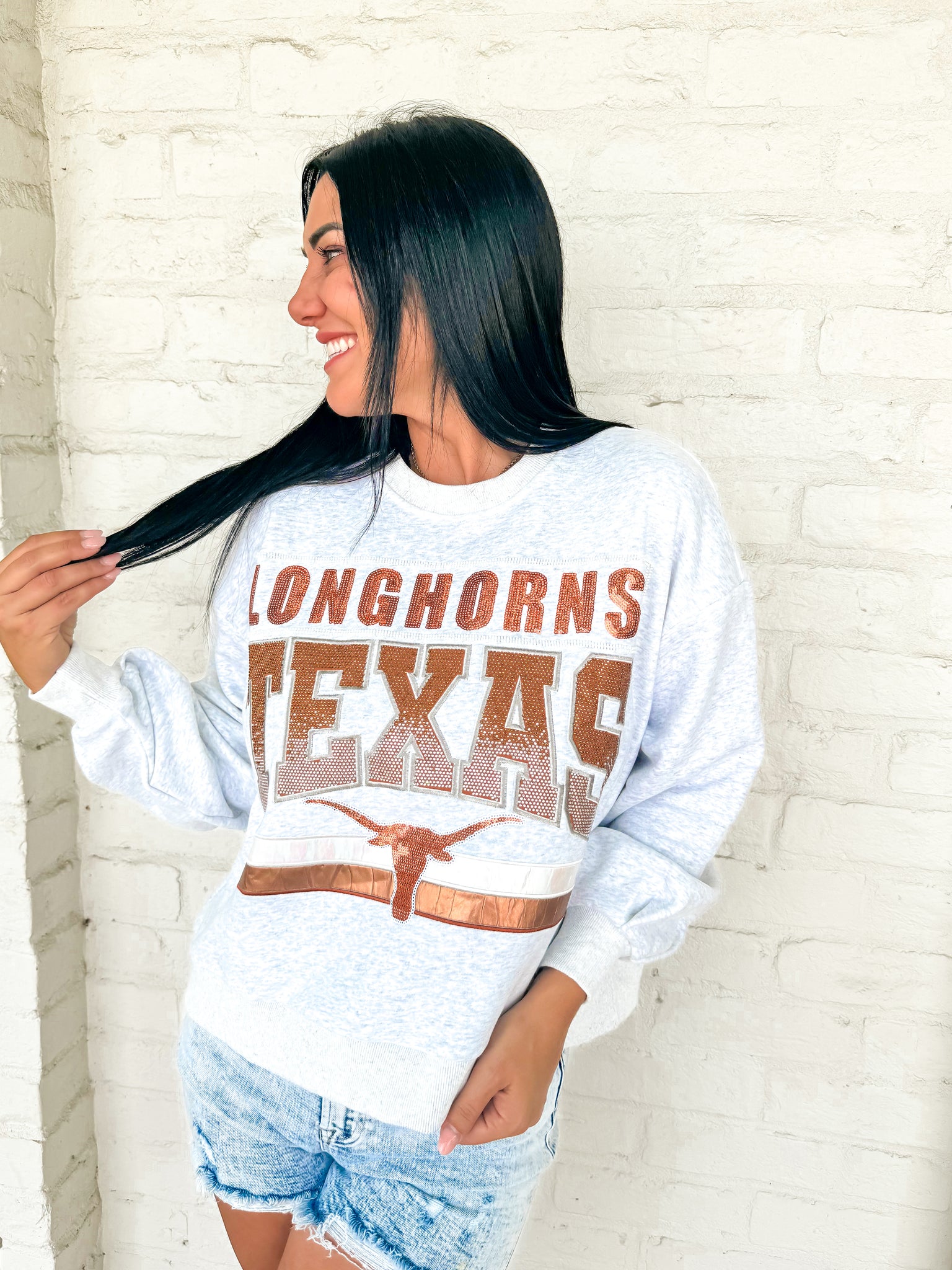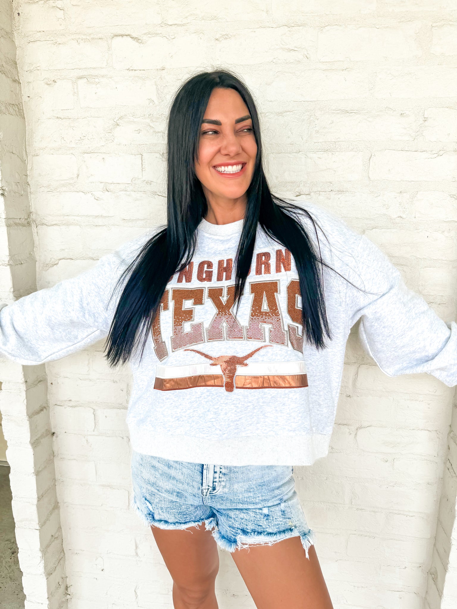 Get ready for game day in style with our Queen Of Sparkles Grey Longhorns Texas Vintage Sweatshirt. Embrace your inner Texan and show off your love for football with this cozy sweatshirt perfect for the fall season. Enjoy the comfort and style of this must-have addition to your game day wardrobe.
